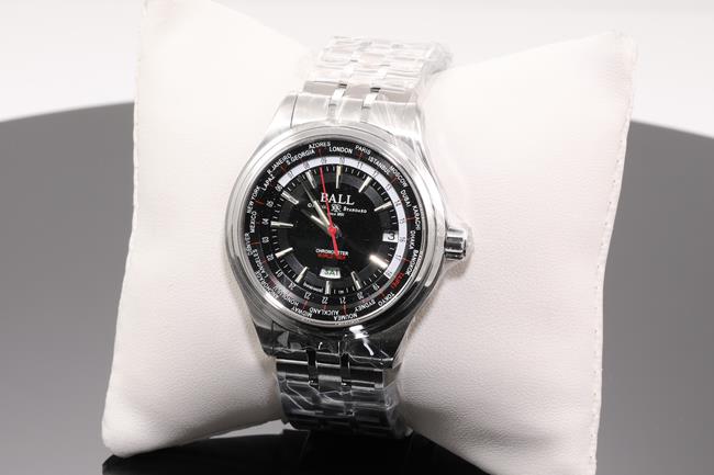 Ball Trainmaster Worldtime stainless steel automatic mens watch. Black dial, date, case diameter: 41mm, wrist size: 18cm, Swiss made. Ref# GM2020D-S2CJ-BK. With BALL stainless steel bracelet and clasp. With Ball chronometer certificate card, Ball Premium International warranty certificate card, Ball QR code linking to user manual and Ball box. 2 year manufacturer warranty. (New, in original wrapping)