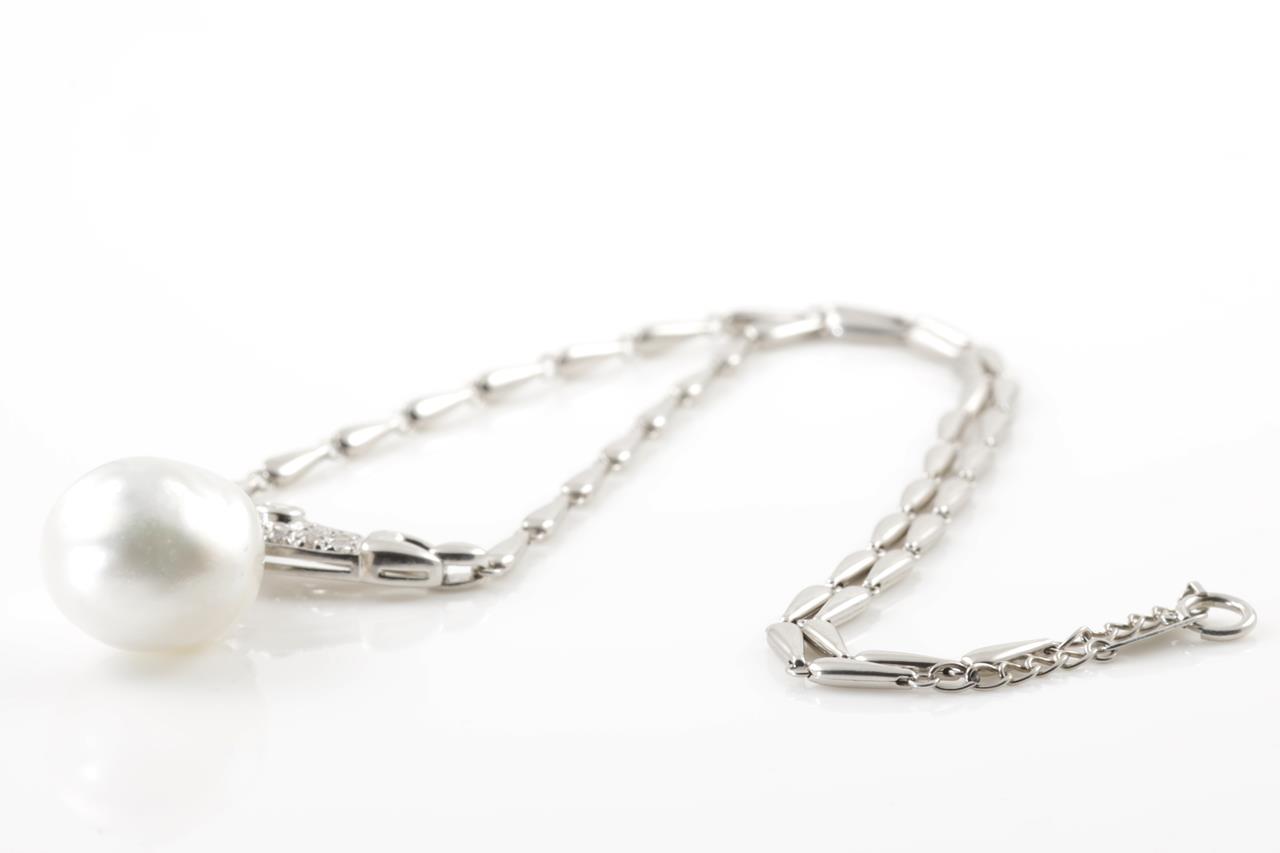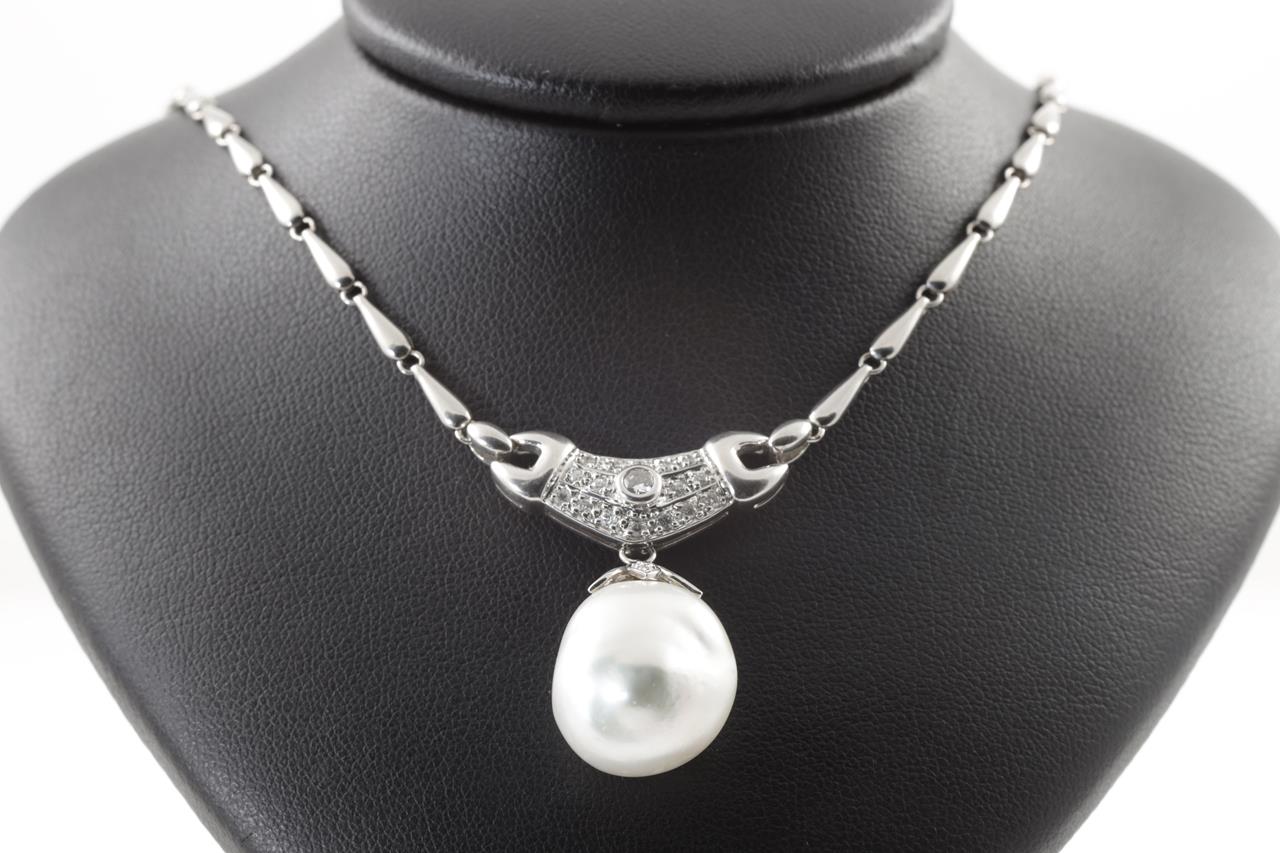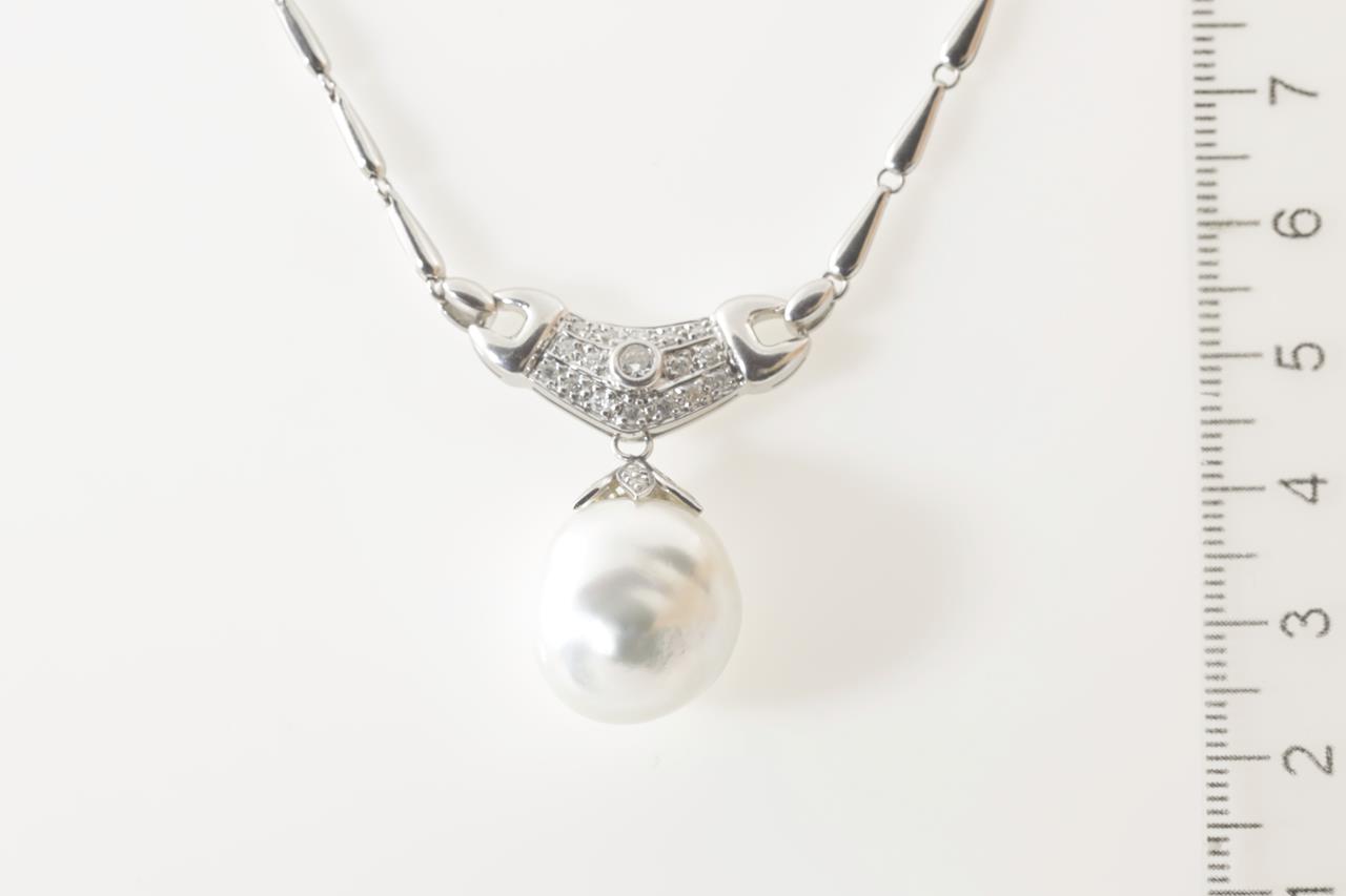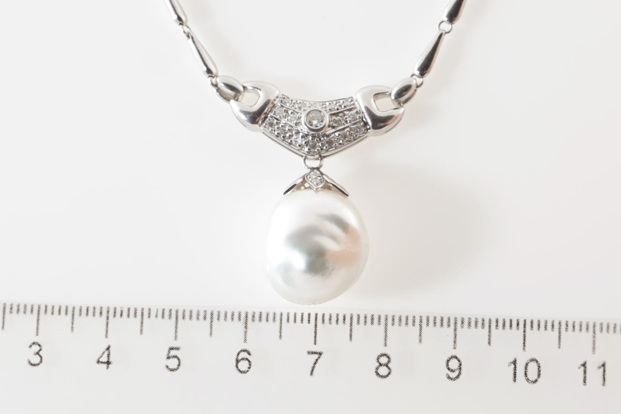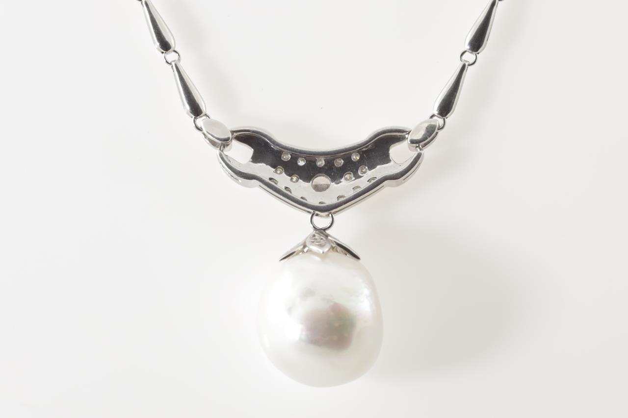 Pearl and Diamond pendant with a Baroque South Sea Pearl of 15.4cm (note minor wear marks) and Diamonds totalling 0.34cts (Estimated grading: H SI-P1). Platinum with attached chain. Length: 44cm. Weight: 18.8g (Pre-owned)