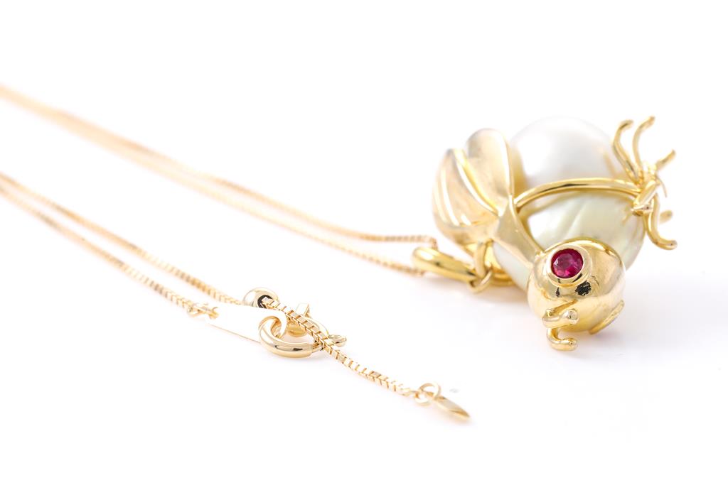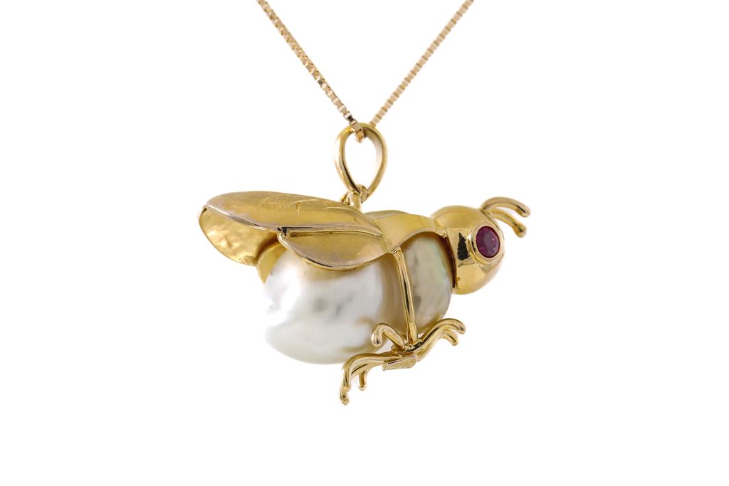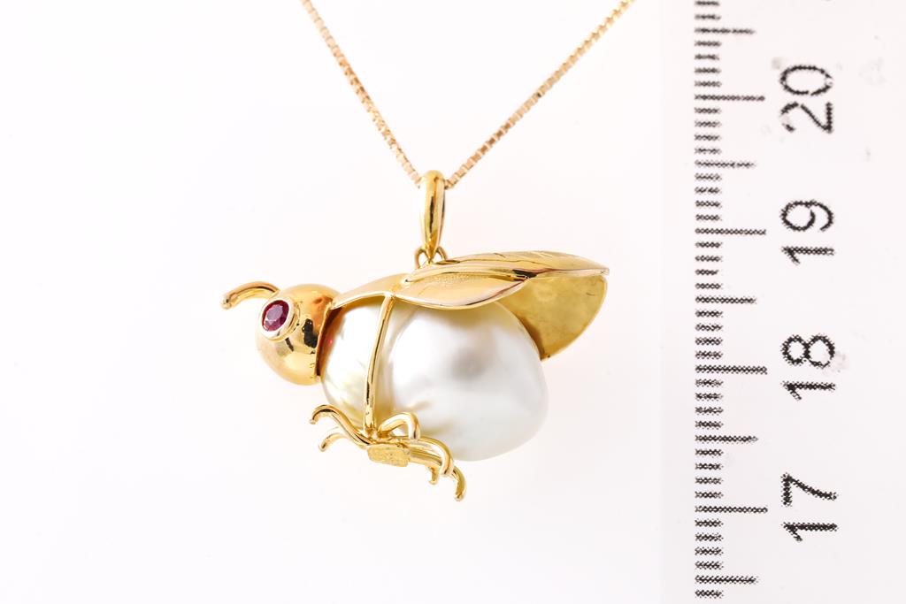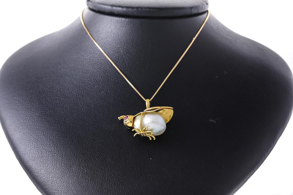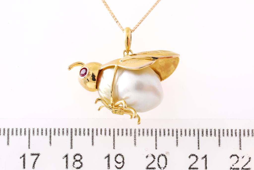 Ruby and Pearl bumble bee desgin pendant with Rubies totalling 0.21cts and Baroque South Sea Pearl of 11.3mm. 18ct yellow gold and 18ct yellow gold adjustable 44cm chain. Weight: 8.3g. (Pre-owned)