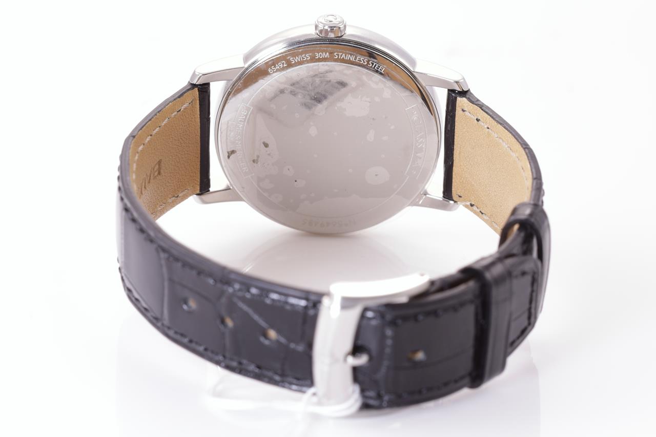 Baume and Mercier Classima stainless steel quartz ladies watch. White dial, date, Diamond indicators, case diameter: 33mm, length: 18.5cm, Swiss made. Ref# MOA10146. With Baume and Mercier black leather strap and clasp. Note: light wear on strap due to being display stock. With Baume and Mercier International Limited Warranty Card (not stamped). No box provided. 3 month FSA Warranty. (As New)
