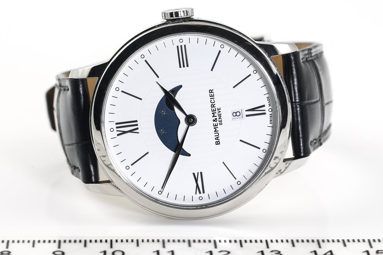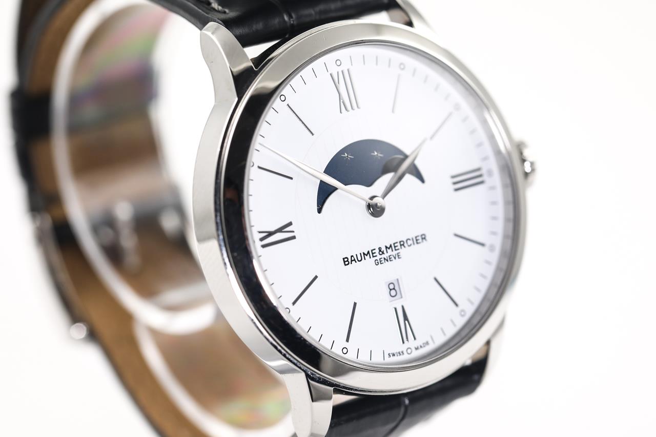 Baume and Mericer Classima stainless steel quartz mens watch. White dial, date, case diameter: 40mm, wrist size: 20.5cm, Swiss made. Ref# MOA10219. With Baume and Mercier black leather strap and clasp. Note: light wear on strap due to being display stock. With Baume & Mercier International Limited Warranty Card (not stamped). No box provided. 3 month FSA Warranty. (As New)