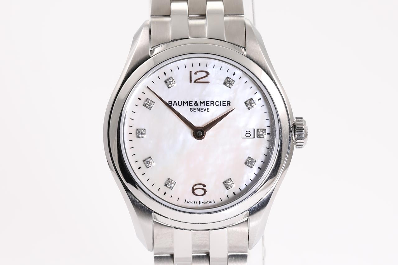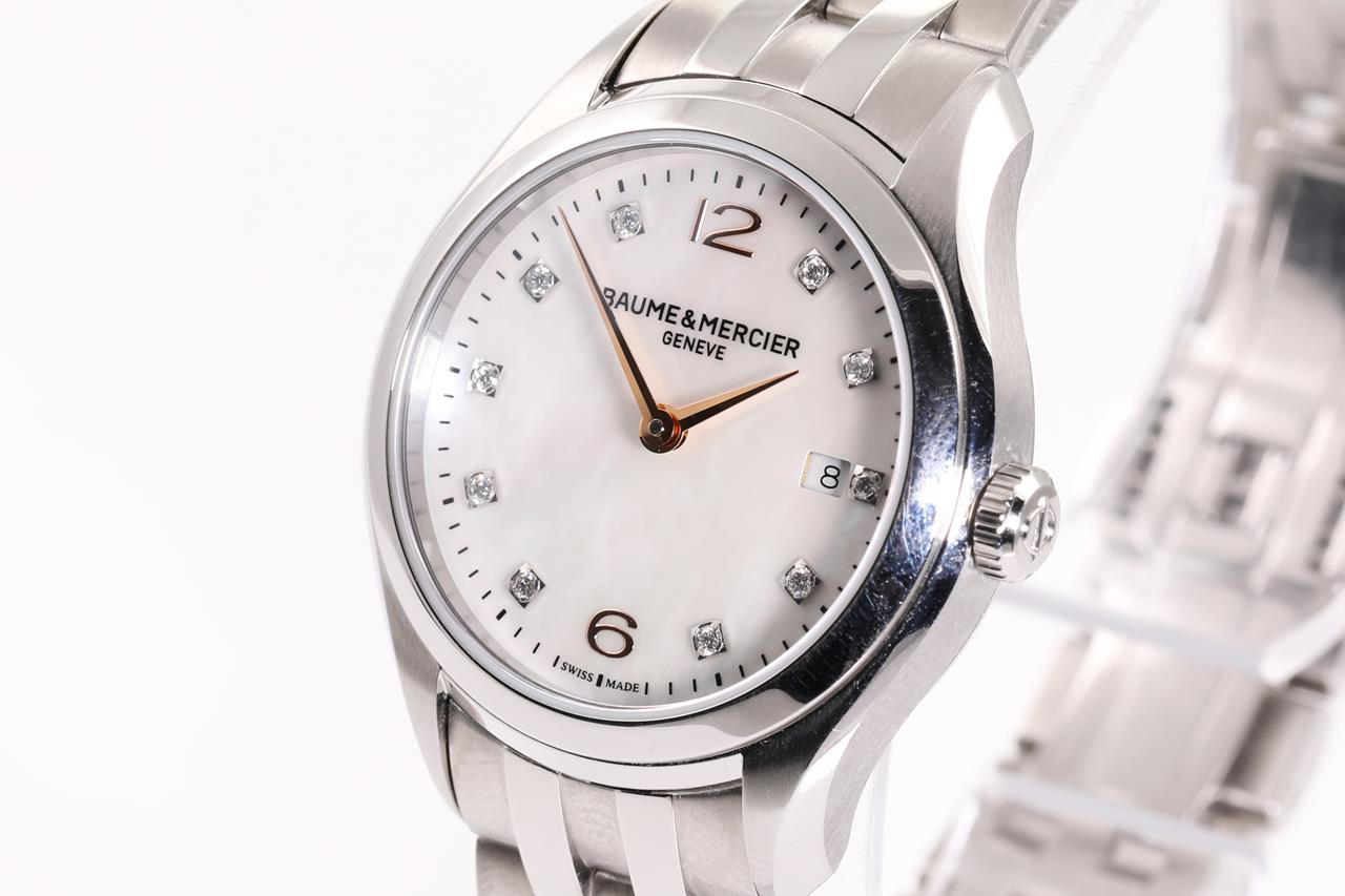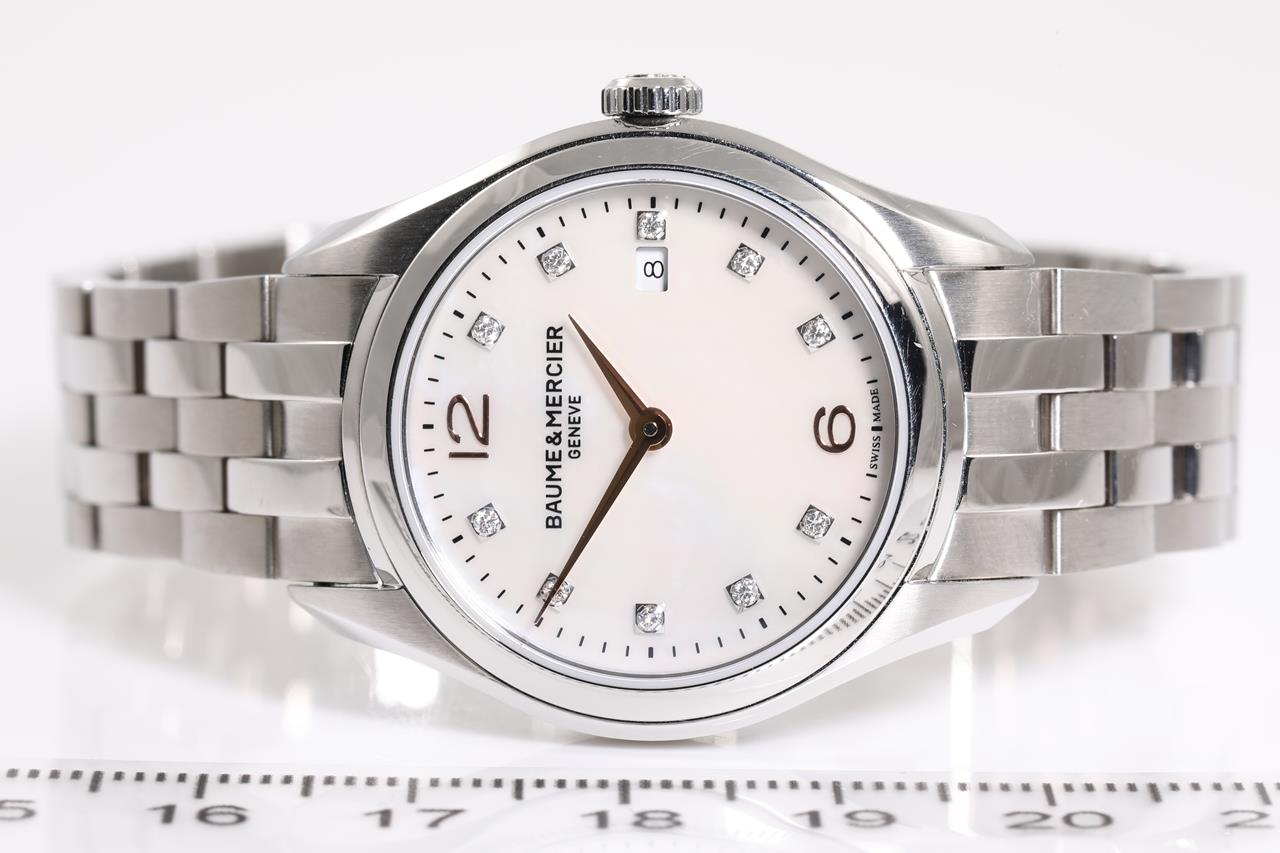 Baume and Mercier Clifton stainless steel quartz ladies watch. Mother of Pearl dial, date, Diamond indicators, case diameter:32mm, wrist size: 17.5cm, Swiss made. Note: Scratches on case due to being display stock. Ref# MOA10176. With Baume & Mercier stainless steel bracelet and clasp. 3 month FSA warranty. (As New)