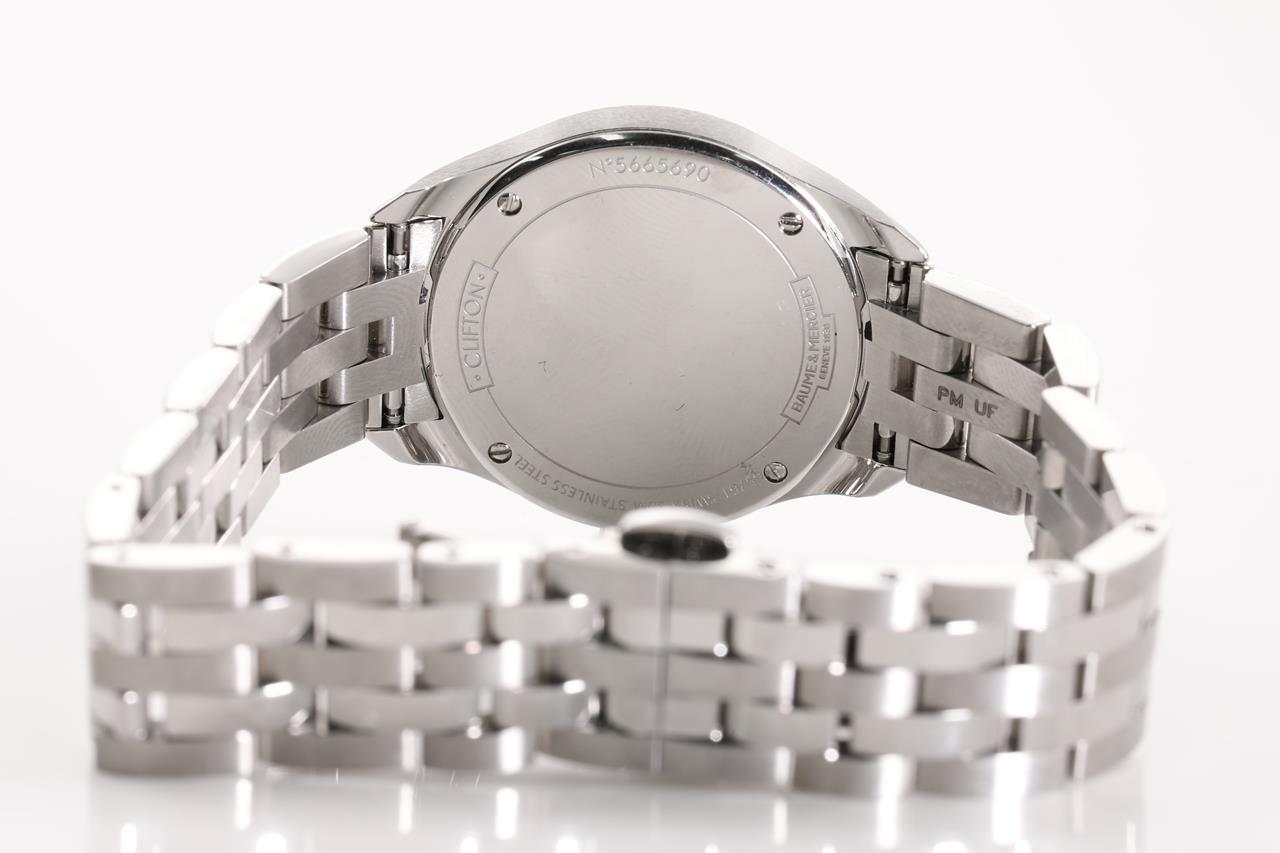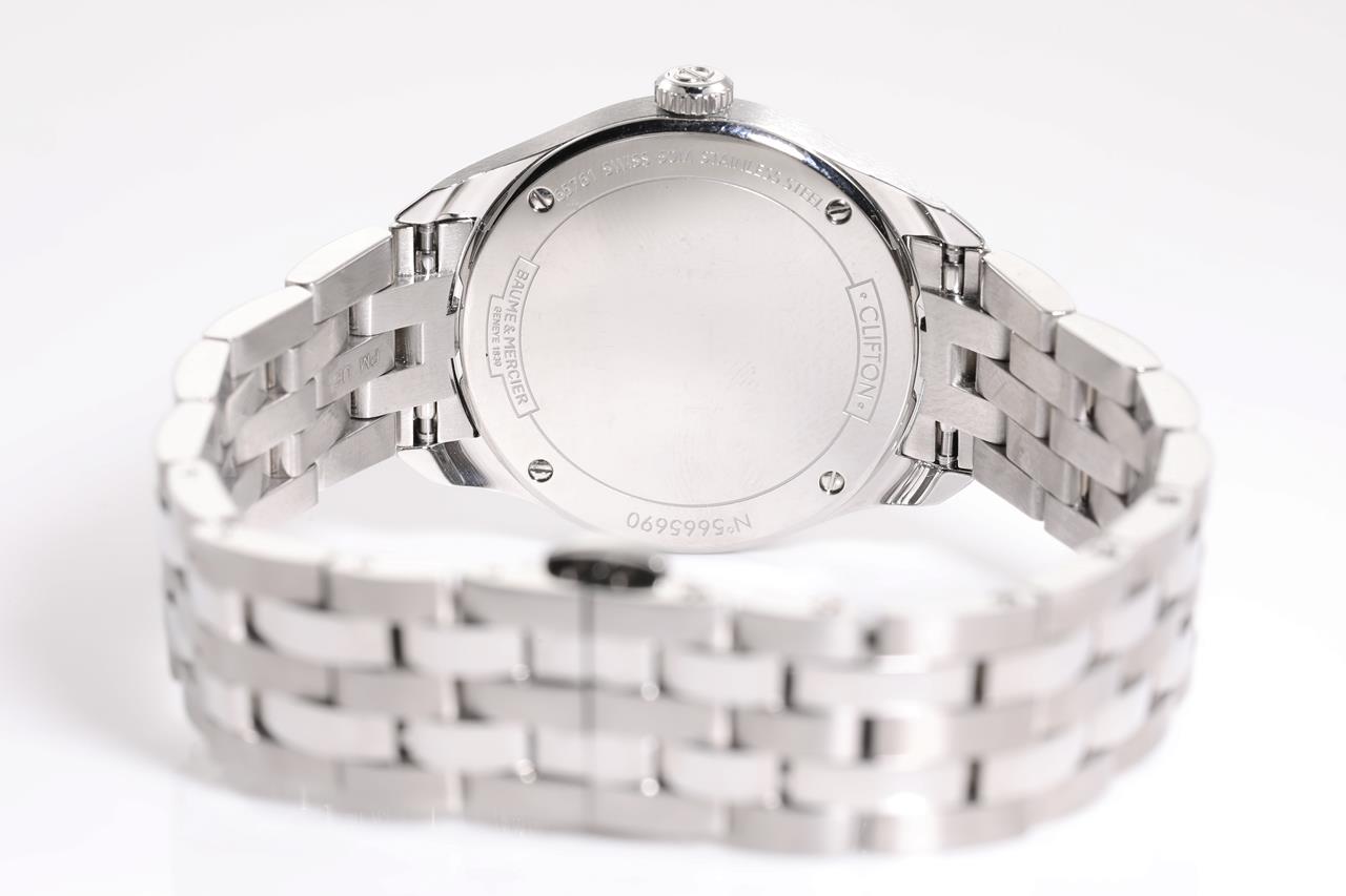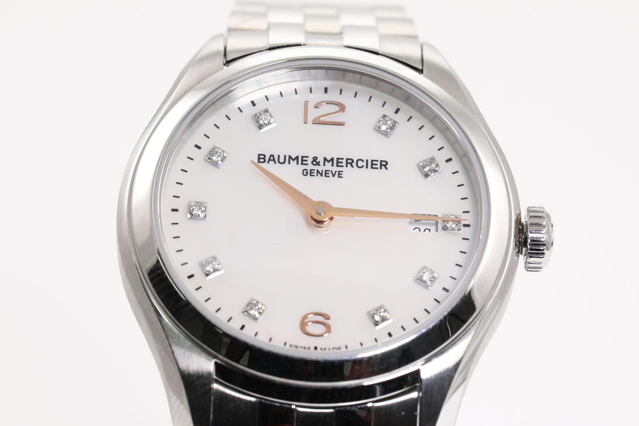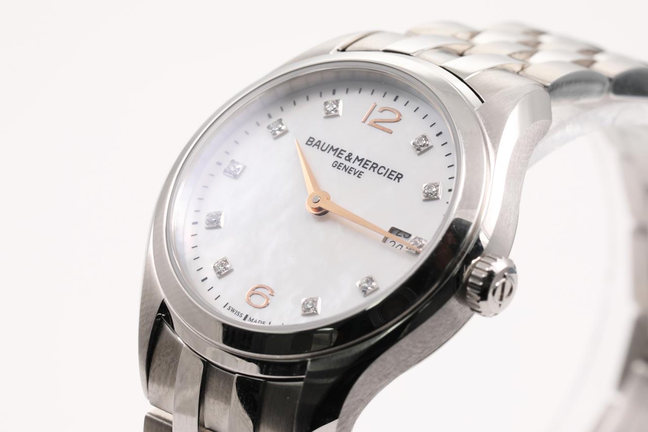 Baume and Mercier Clifton stainless steel quartz ladies watch. Mother of Pearl dial, date, Diamond indicators, case diameter:32mm, wrist size: 17.5cm, Swiss made. Note: Scratches on case due to being display stock. Ref# MOA10176. With Baume & Mercier stainless steel bracelet and clasp. 3 month FSA warranty. (As New)
