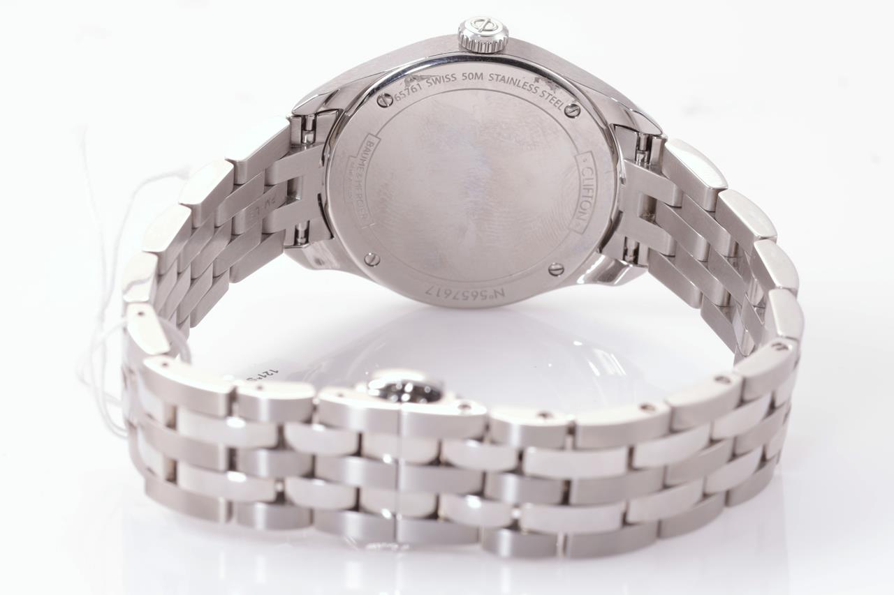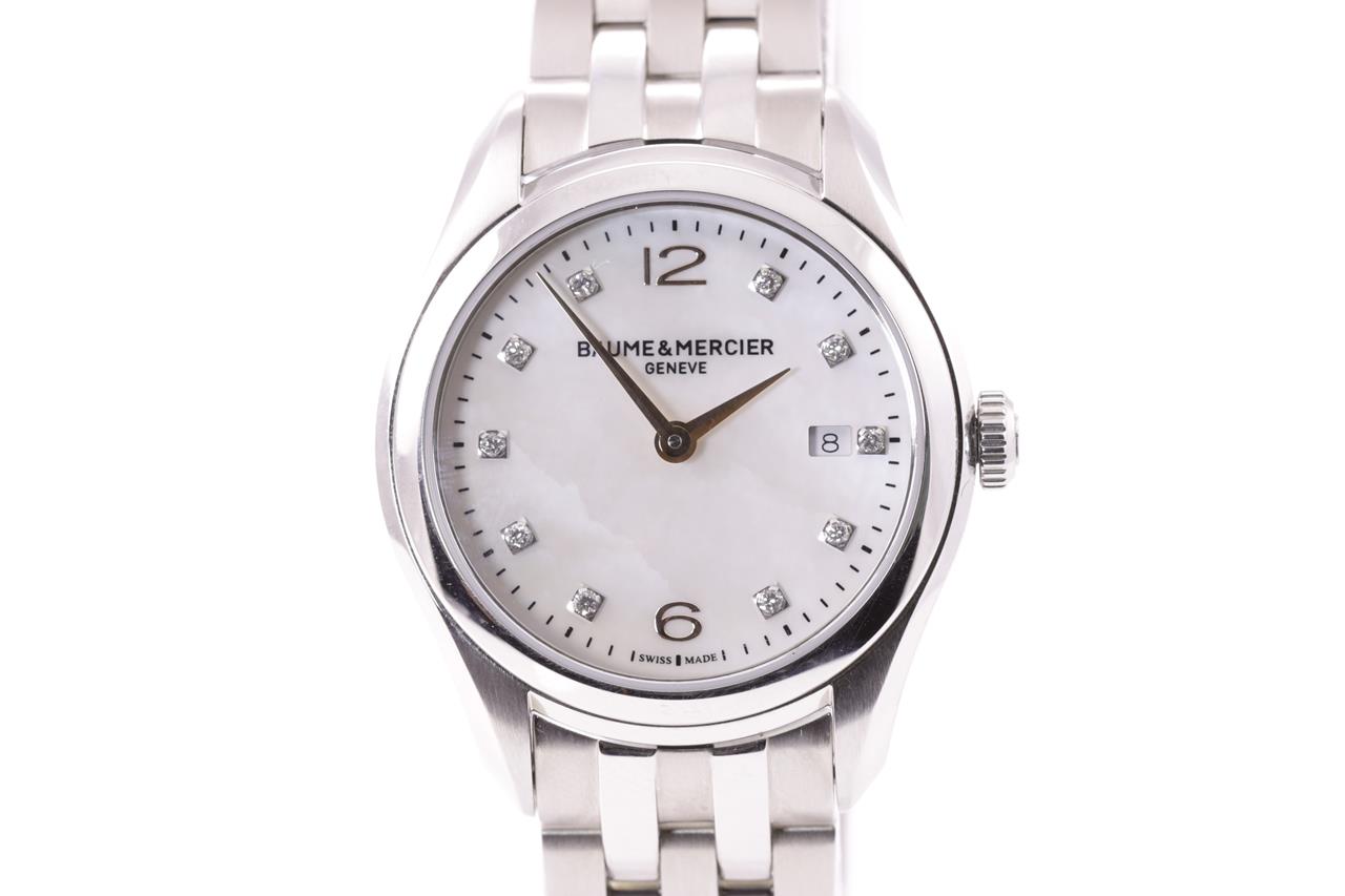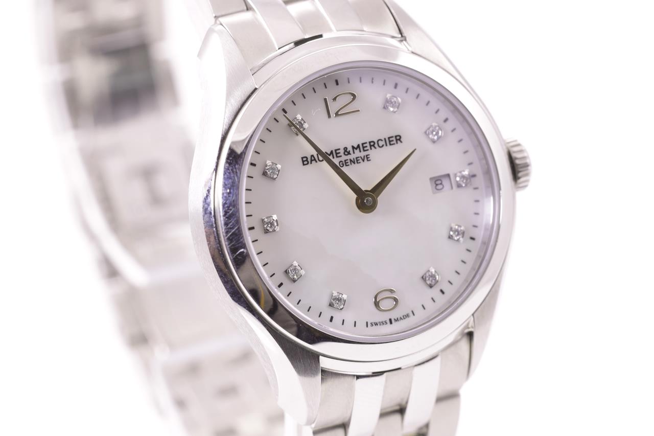 Baume and Mercier Clifton stainless steel quartz ladies watch. Mother of Pearl dial, date, Diamond indicators, case diameter: 32mm, wrist size: 17.5cm, Swiss made. Ref# MOA10176. With Baume & Mercier stainless steel bracelet and clasp. Note: scratches on case and bracelet due to being display stock. No box provided. 3 month FSA warranty. (As New)