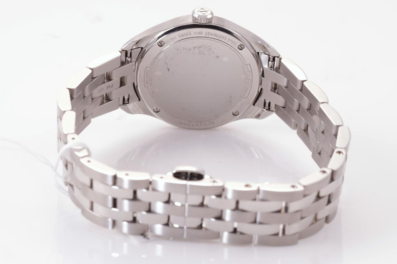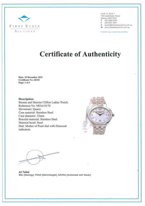 Baume and Mercier Clifton stainless steel quartz ladies watch. Mother of Pearl dial, date, Diamond indicators, case diameter: 32mm, wrist size: 17cm, Swiss made. Ref# MOA10176. With Baume & Mercier stainless steel bracelet and clasp. Note: scratches on case and bracelet due to being display stock. With Certificate of Authenticty. No box provided. 3 month FSA warranty. (As New)