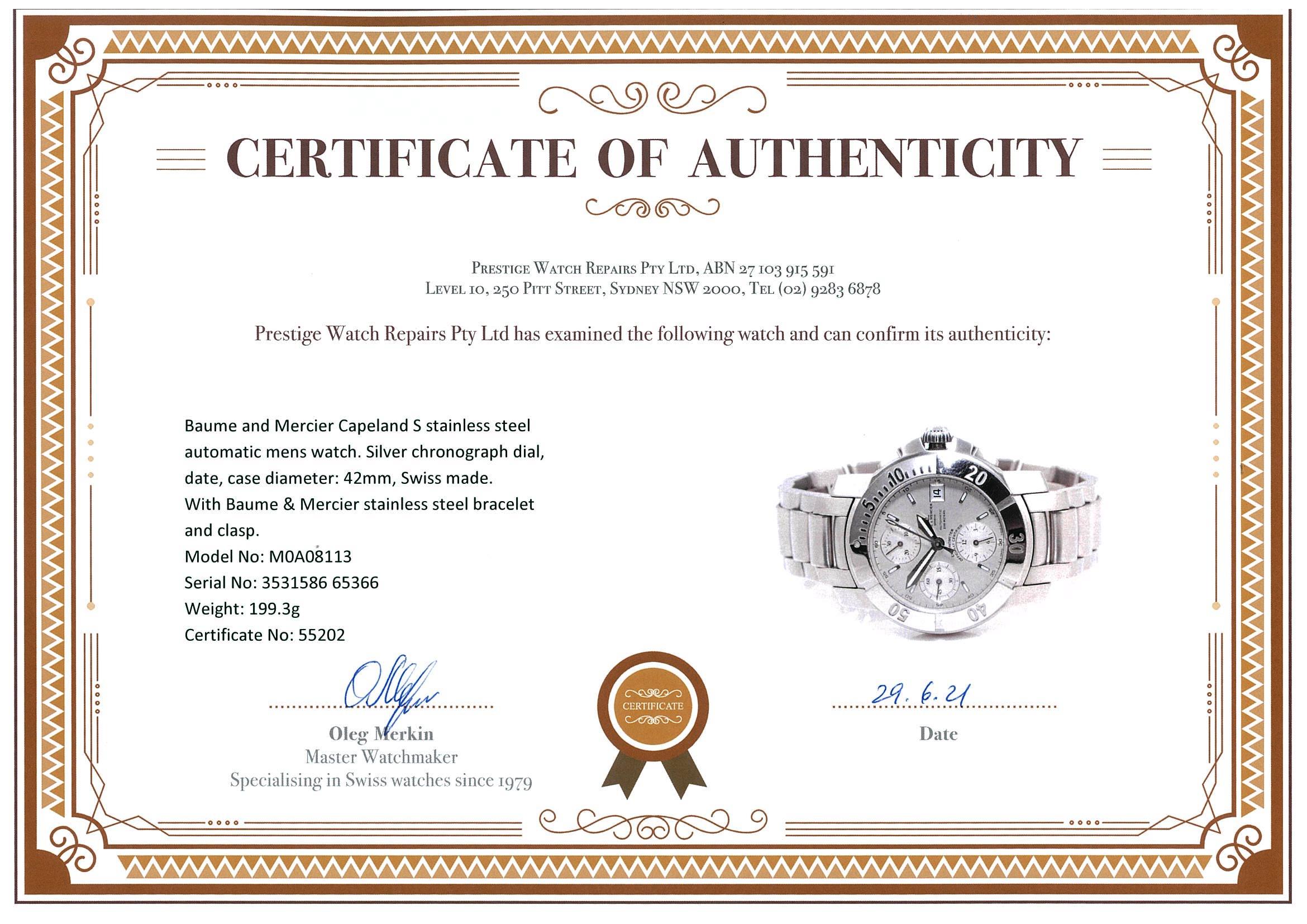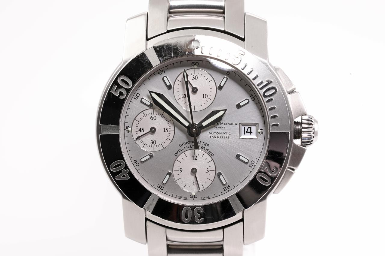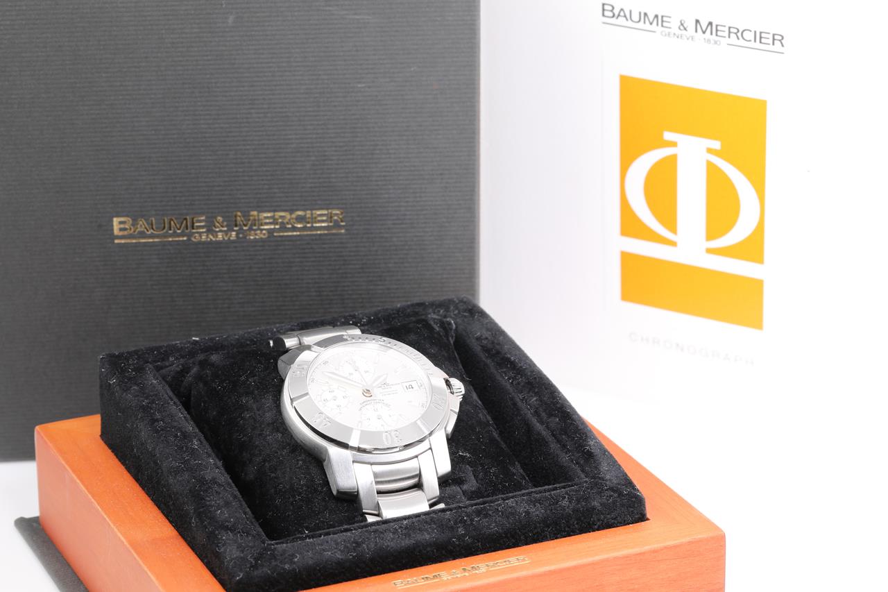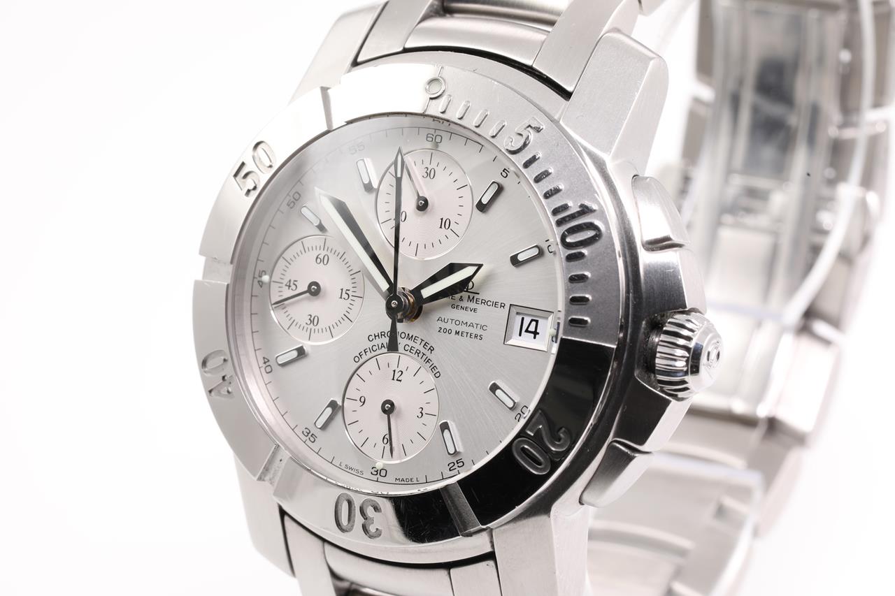 Baume and Mercier Capeland S stainless steel automatic mens watch. Silver chronograph dial, date, case diameter: 42mm, wrist size: 19cm, Swiss made. Ref #M0A08113. With Baume & Mercier stainless steel bracelet and clasp. With International guarantee card, certificate of authenticity and Baume & Mercier box. 3 month FSA warranty. (Pre-owned)