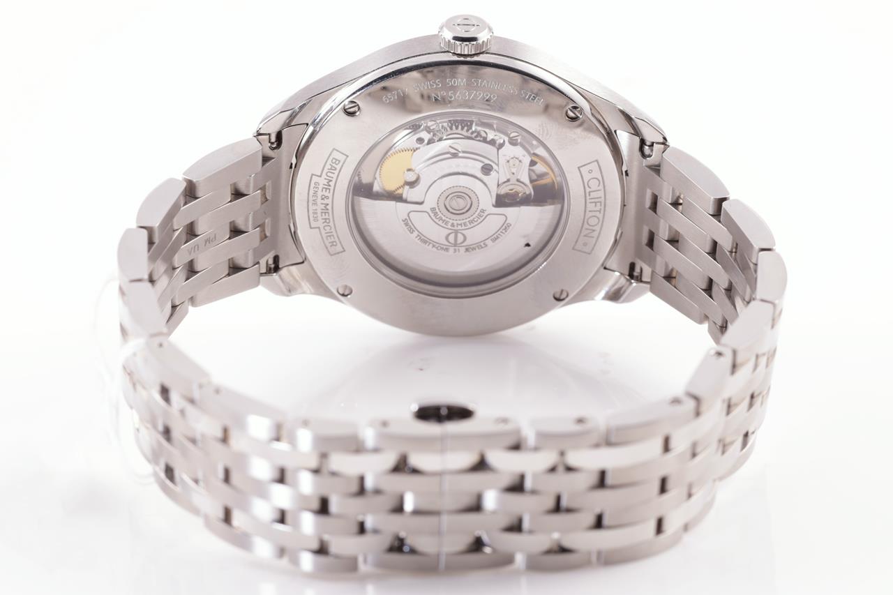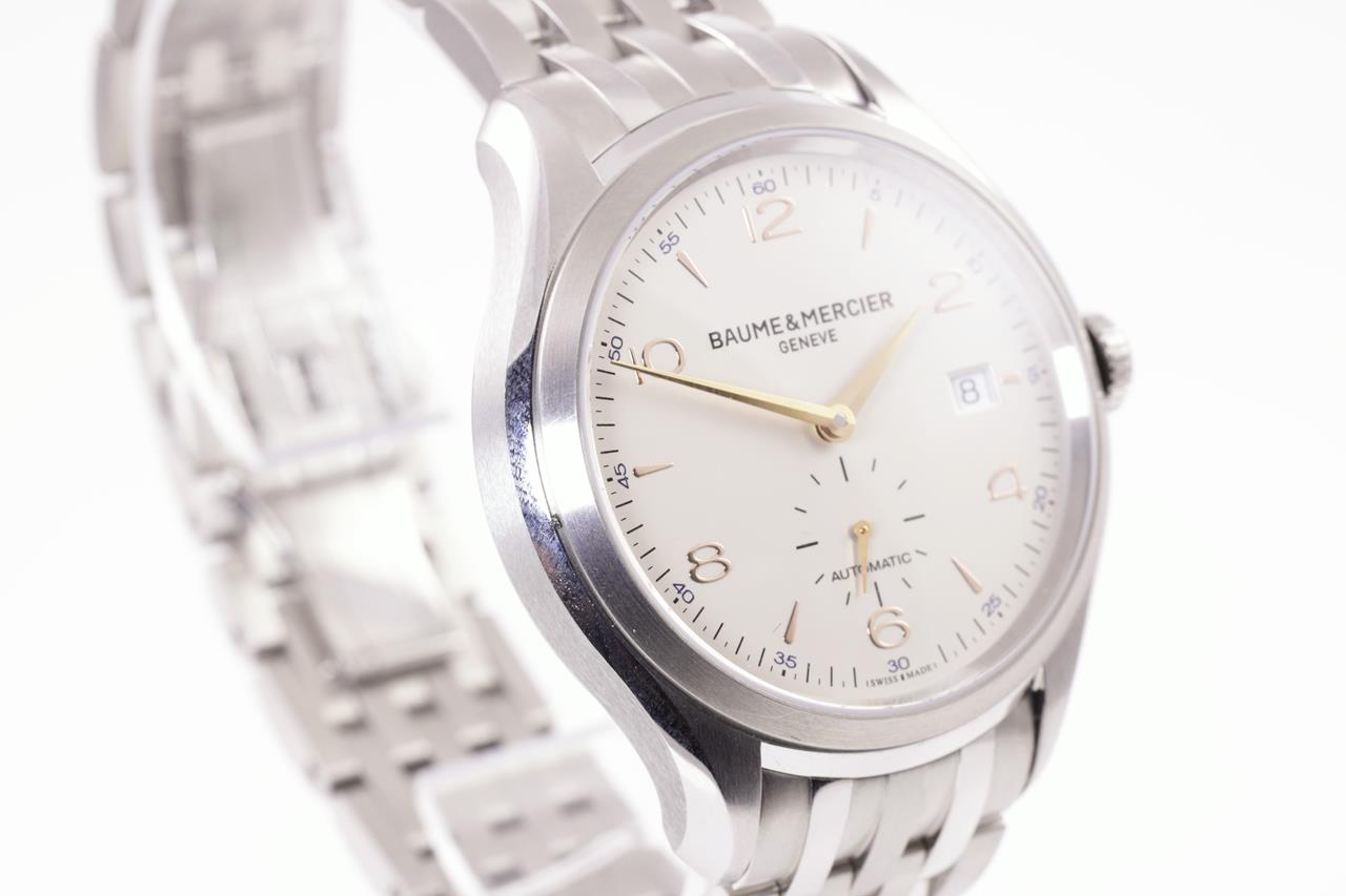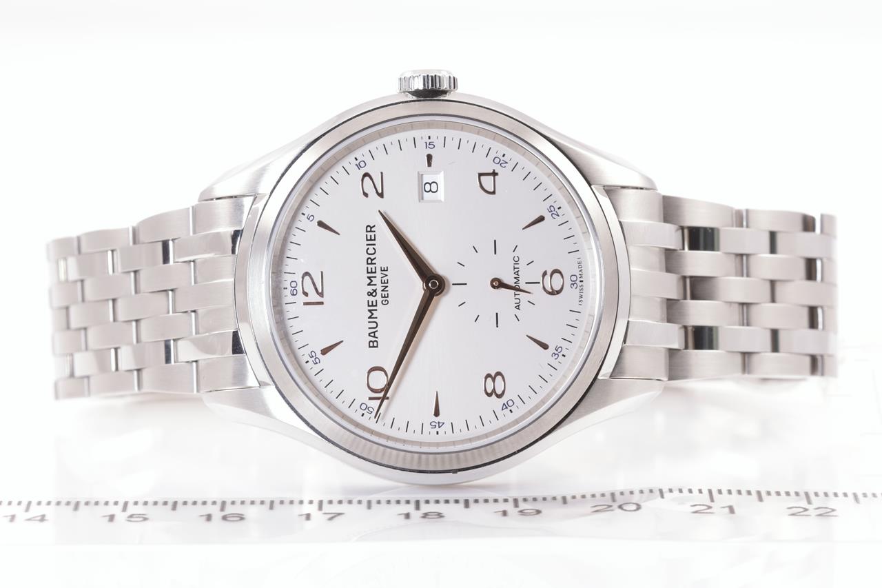 Baume & Mercier Clifton stainless steel automatic mens watch. Silver dial, date, case diameter: 41mm, wrist size: 20cm, Swiss made. Ref# MOA10141. With Baume & Mercier stainless steel bracelet and clasp. Note: minor scratches on case and bracelet due to being display stock. No box provided. 3 month FSA warranty. (As New)