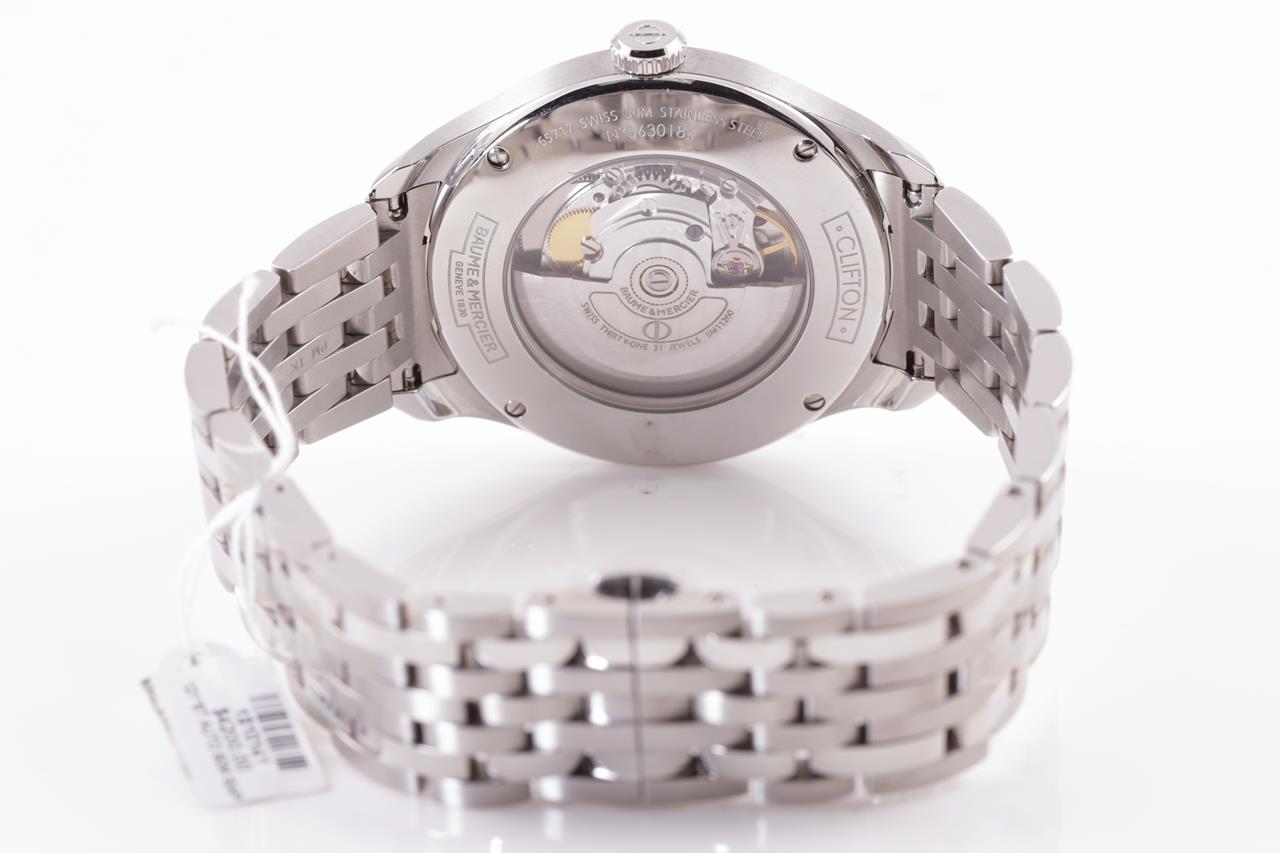 Baume & Mercier Clifton stainless steel automatic mens watch. Silver dial, date, case diameter: 41mm, wrist size: 20cm, Swiss made. Ref# MOA10141. With Baume & Mercier stainless steel bracelet and clasp. Note: minor scratches on case and bracelet due to being display stock. With Baume & Mercier International Limited Warranty Card (no stamped). No box provided. 3 month FSA warranty. (As New)