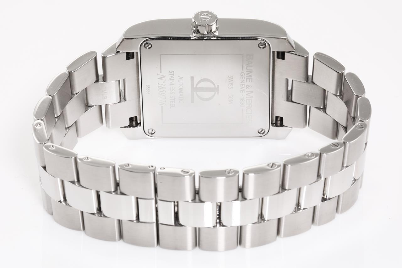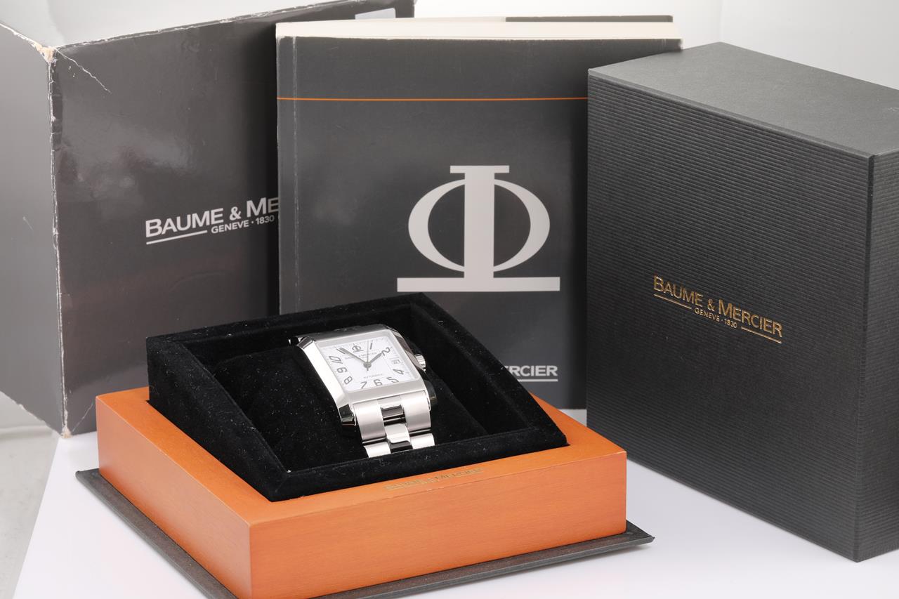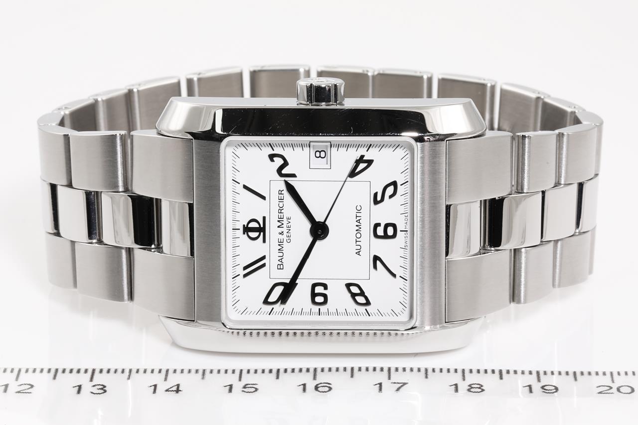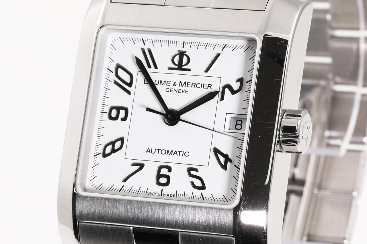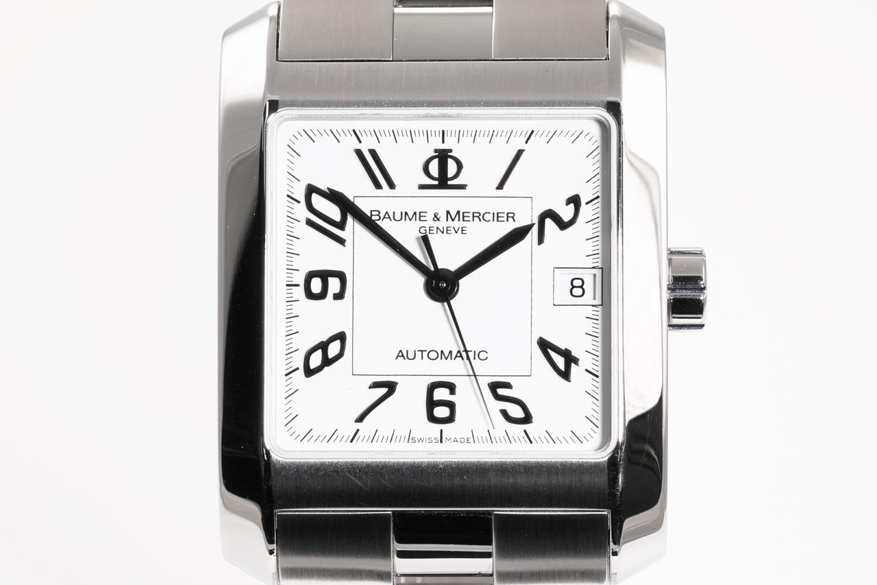 Baume & Mercier Hampton Classic Square stainless steel automatic mens watch. White dial, date, case diameter: 45mm x 34mm, wrist size: 19cm, Swiss made. Ref# 65535. With Baume & Mercier stainless steel bracelet and clasp. With certificate of authenticity and Baume & Mercier box. 3 month FSA warranty. (Pre-owned)