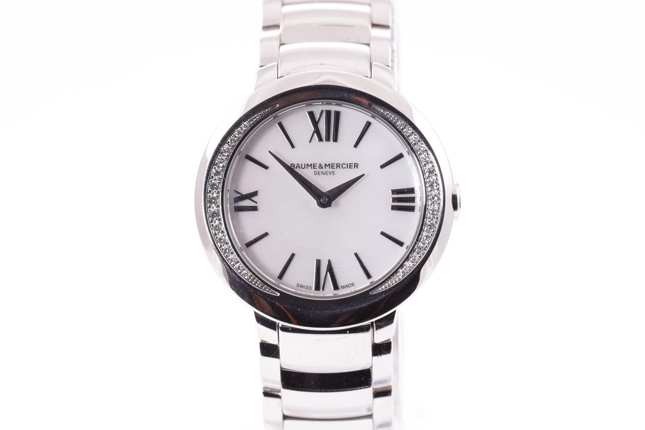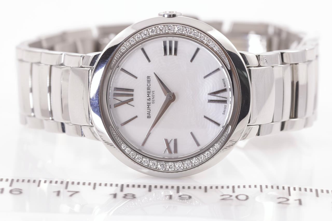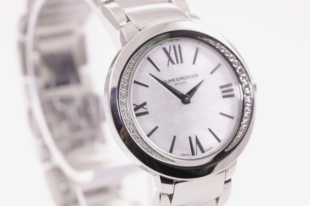 Baume & Mercier Promesse stainless steel quartz ladies watch. Mother of Pearl dial, Diamonds on bezel, case diameter: 30mm, wrist size: 16.5cm, Swiss made. Ref# MOA10160. With Baume & Mercier stainless steel bracelet and clasp. Note: minor scratches on case and bracelet due to being display stock. No box provided. 3 month FSA Warranty. (As New)