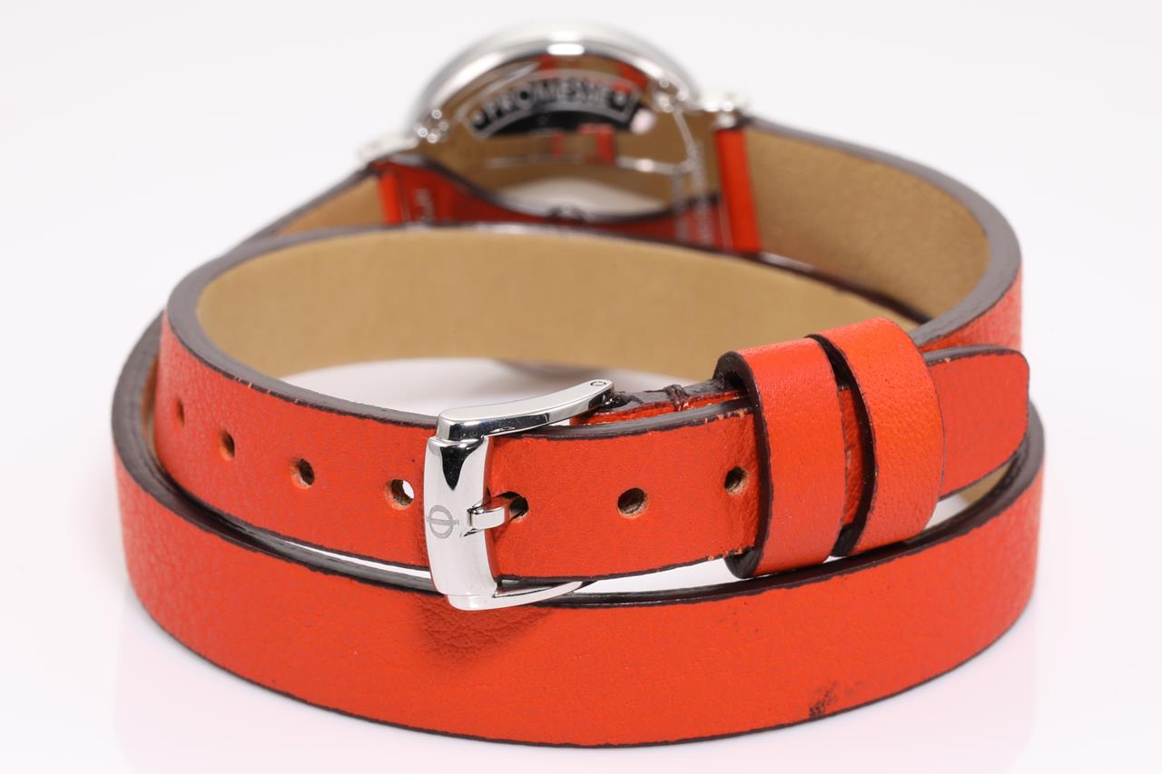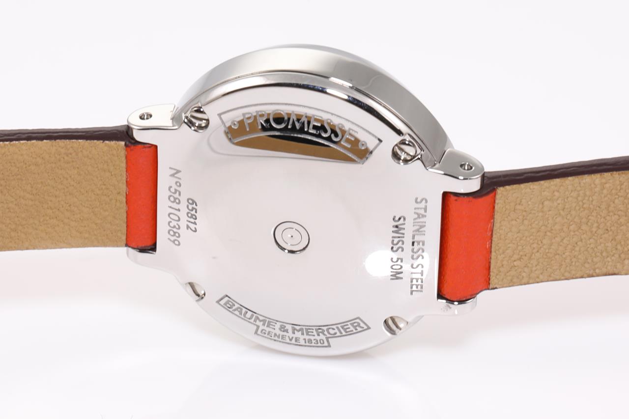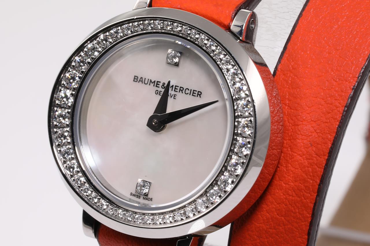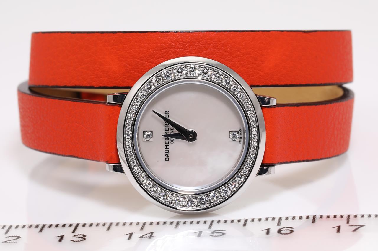 Baume & Mercier Promesse stainless steel quartz ladies watch. Mother of Pearl dial, Diamonds on bezel and on dial, case diameter: 22mm, wrist size: 35cm, Swiss made. Ref# MOA10290. With Baume & Mercier wrap-around orange leather strap and clasp. Note: light wear on strap due to being display stock. With Baume & Mercier International Limited Warranty Card (not stamped). No box provided. and 3 month FSA warranty. (As New)