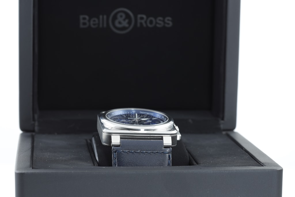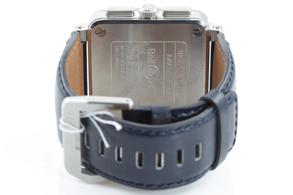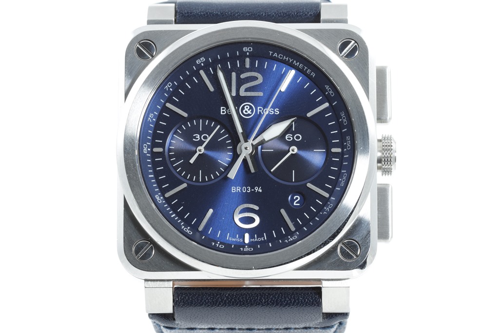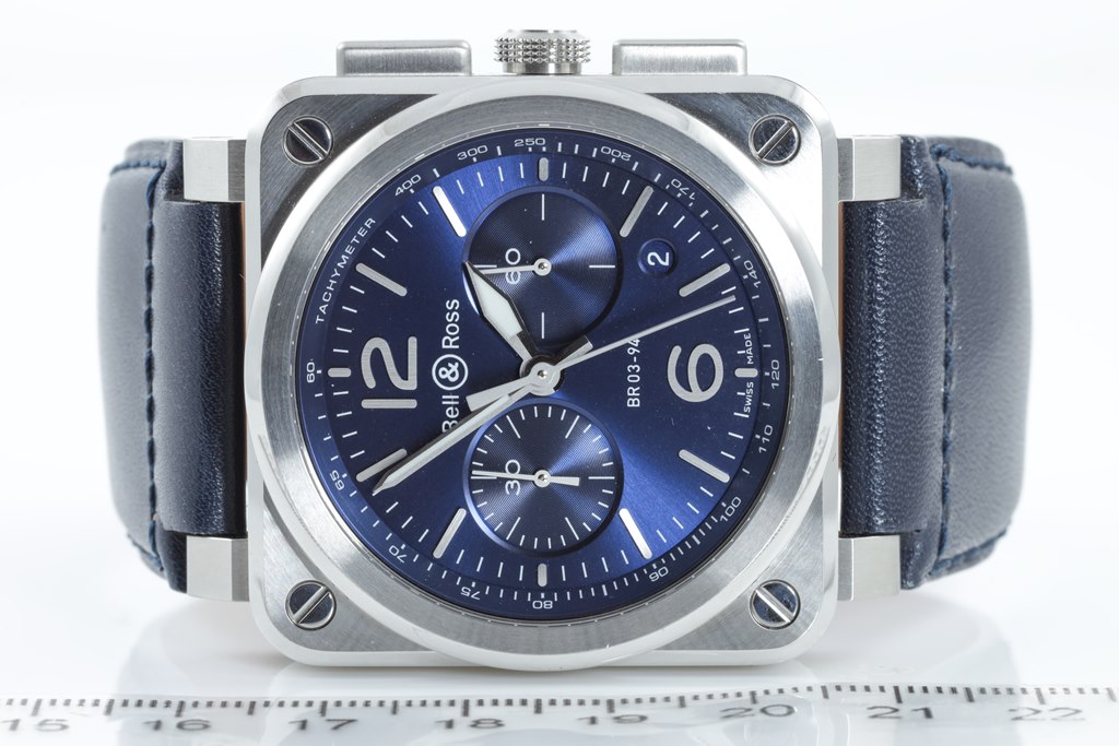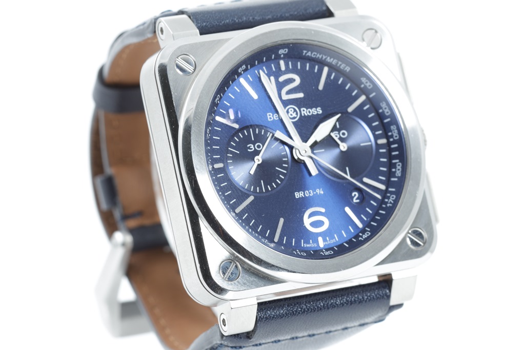 Bell & Ross Aviation BR 03-94 stainless steel automatic mens watch. Blue chronograph dial, date, case diameter: 42mm, length: 21cm, Swiss made. Ref# BR0394-BLU-ST/SCA. With Bell & Ross blue leather strap and buckle. Note: light wear on strap due to being display stock. With Bell & Ross Warranty card (not stamped) and Bell & Ross damaged box. 3 month FSA warranty. (As New)