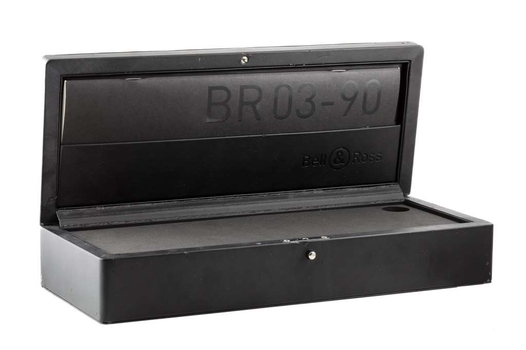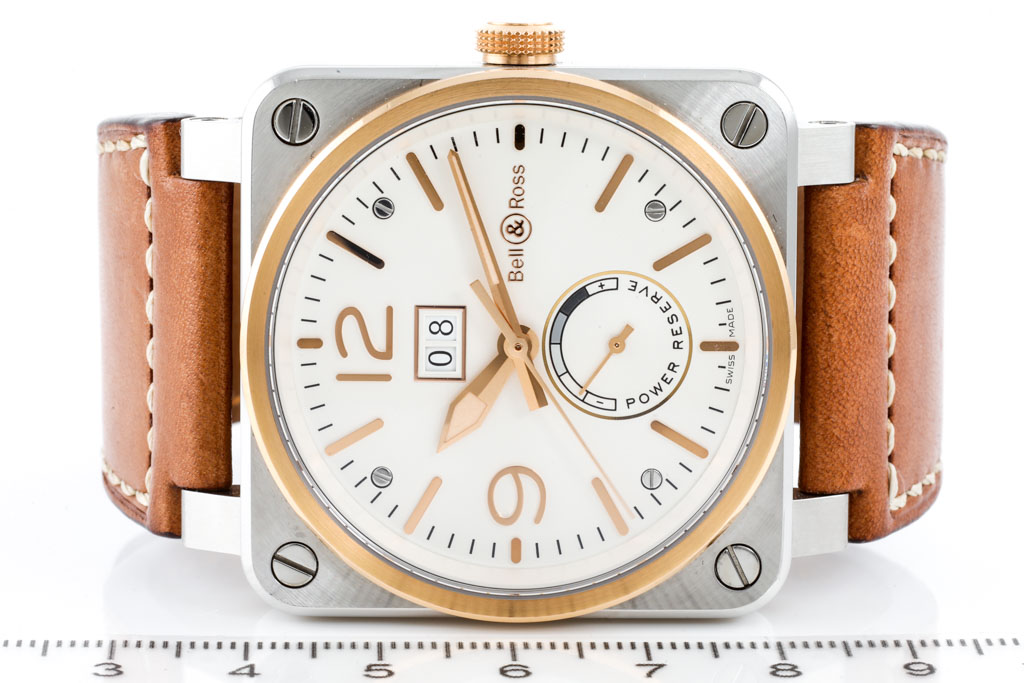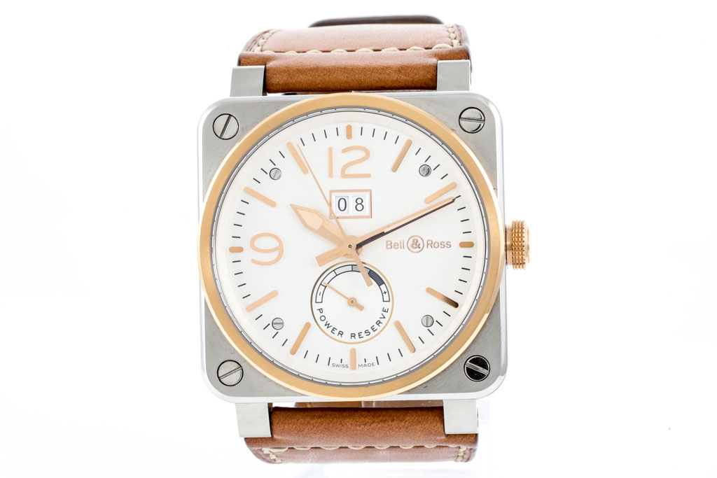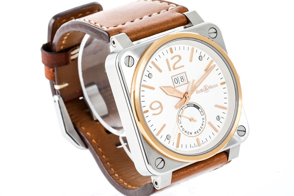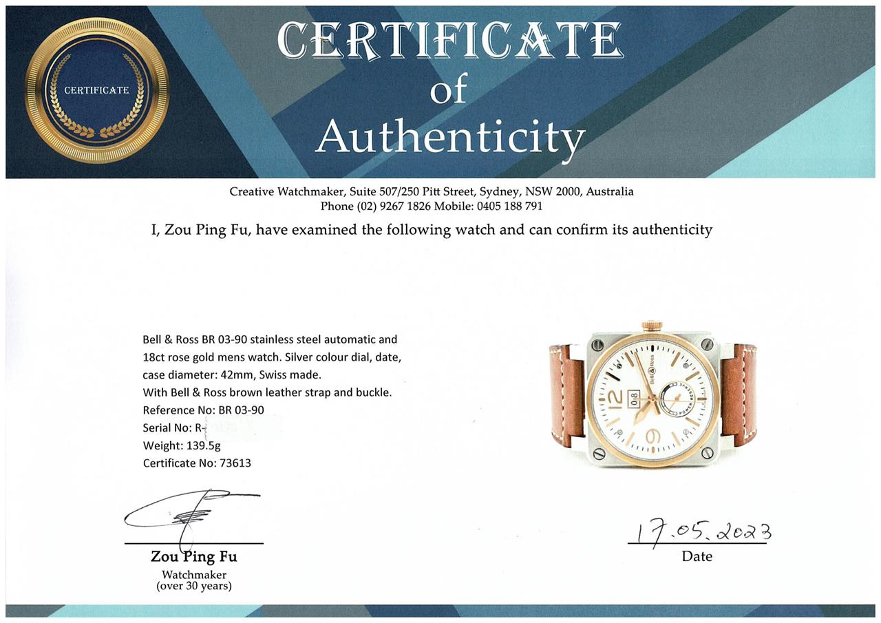 Bell & Ross BR 03-90 stainless steel and 18ct rose gold automatic mens watch. Silver colour dial, date, case diameter: 42mm, strap length: 21cm, Swiss made. Ref# BR 03-90. With Bell & Ross brown leather strap and buckle. With Certificate of Authenticity and Bell & Ross box. 3 month FSA warranty. (Pre-owned)