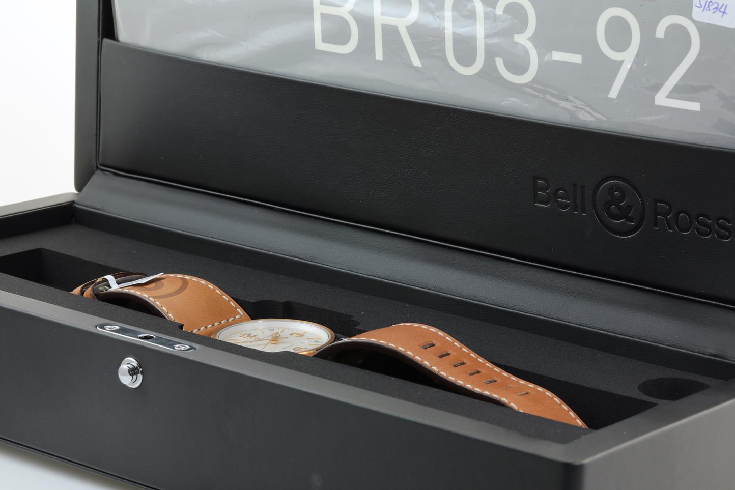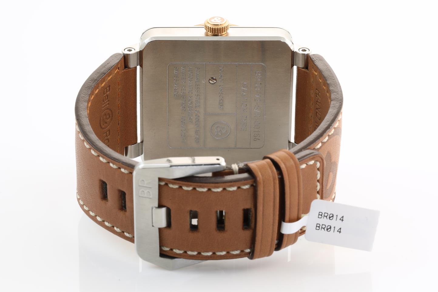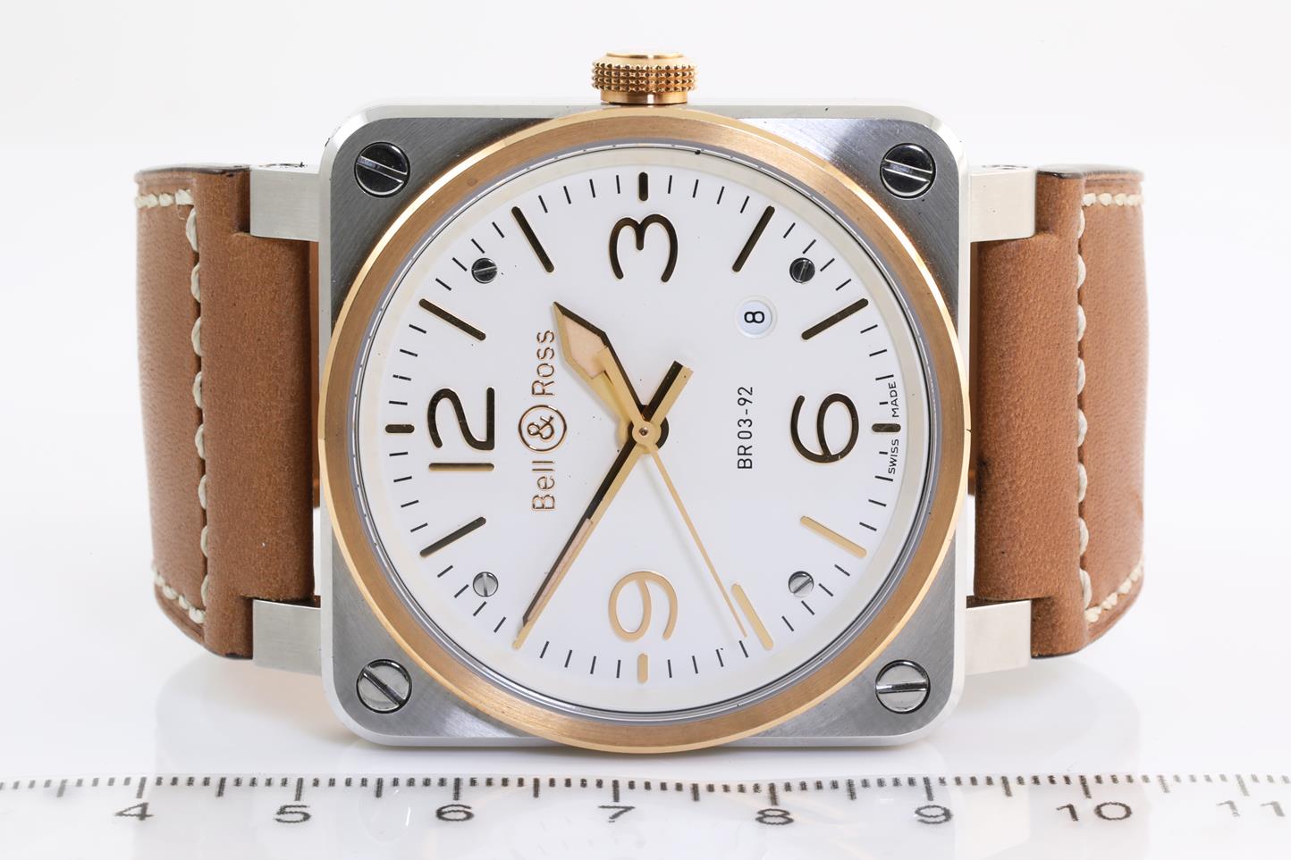 Bell & Ross BR 03 -92 stainless steel and 18ct rose gold automatic mens watch. Opaline dial, date, case diameter: 42mm. Swiss made. Ref #BR0392-ST-PG/SCA. With Bell & Ross brown leather strap. Note: slight wear on strap due to being display stock. With Bell & Ross warranty card (not stamped) and booklet inside Bell & Ross box. 3 month FSA Warranty. (New)