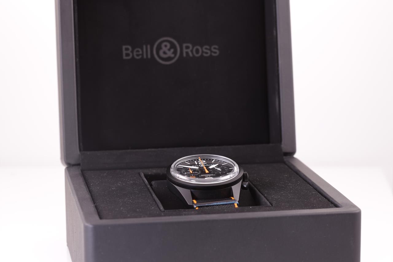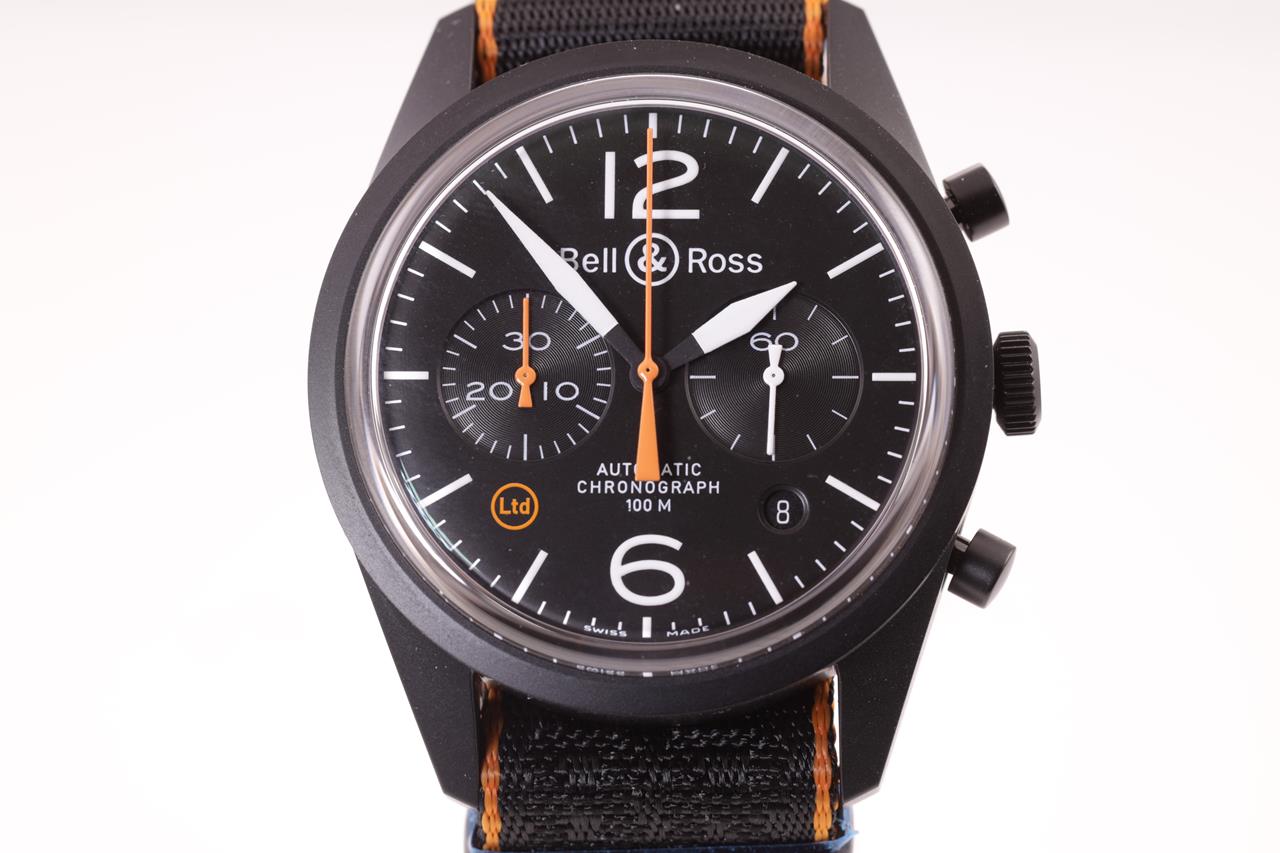 Bell & Ross BR 126 Carbon Orange matt black PVD stainless steel automatic mens watch. Black dial, date, case diameter: 41mm, length: 23.5cm, Swiss made. Ref# BRV126-O-CA. With Bell & Ross black nato strap with orange edging and buckle. With Bell & Ross Warranty Card (not stamped) and Bell & Ross box. 3 month FSA warranty. (New)