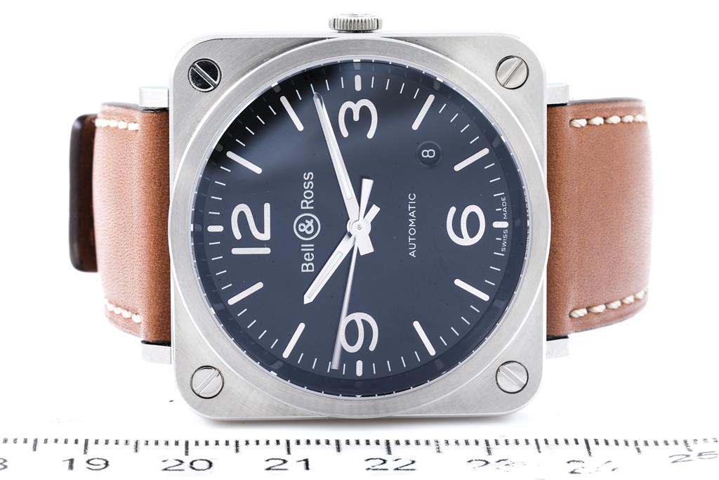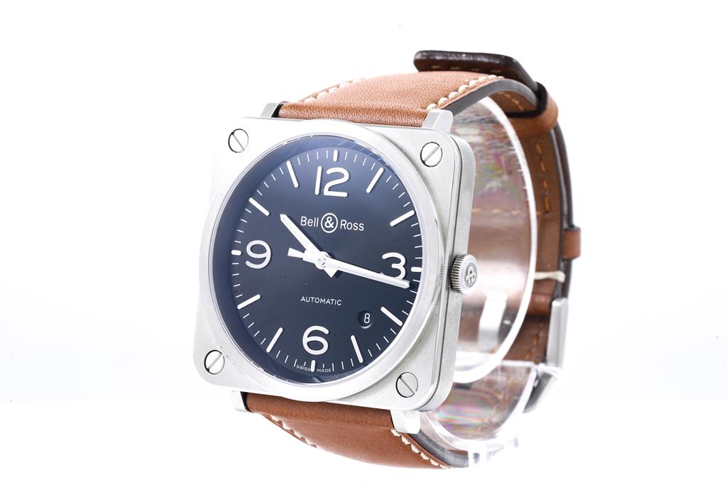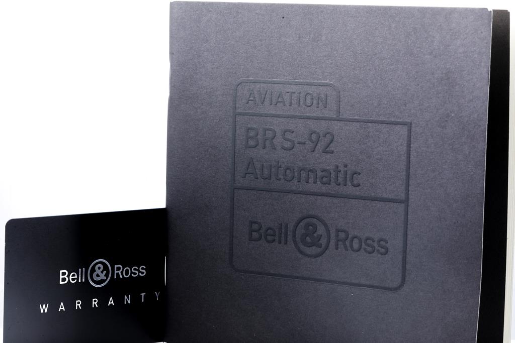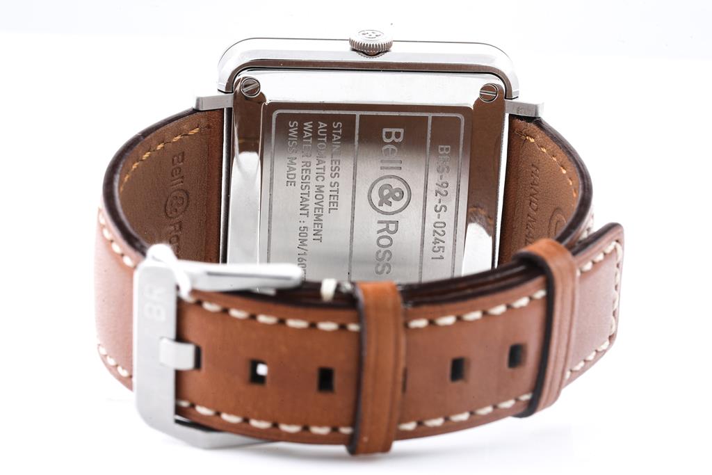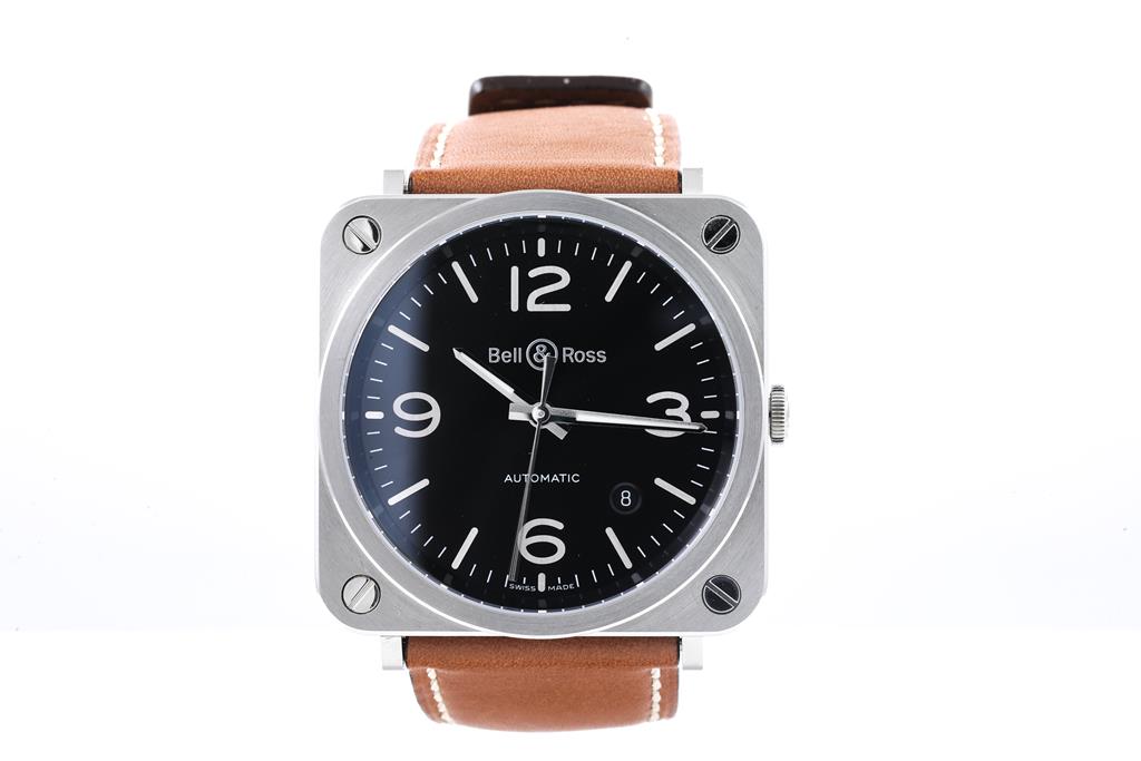 Bell & Ross BR S-92 Golden Heritage stainless steel automatic mens watch. Black dial, date, case diameter: 39mm, length: 20cm, Swiss made. Ref# BRS92-G-HE-ST. With Bell & Ross brown leather strap and clasp. With Bell & Ross warranty card - the card is not stamped so the Bell & Ross warranty will not apply. No box provided. 3 month FSA warranty. (As New, Note: light wear on strap due to being display stock)