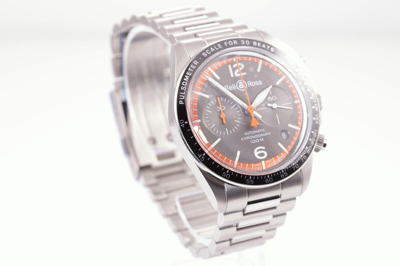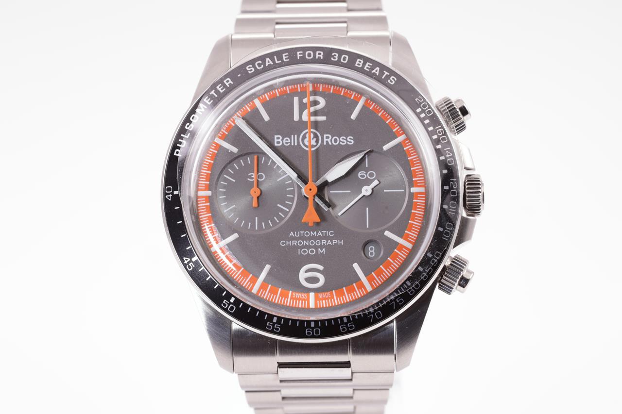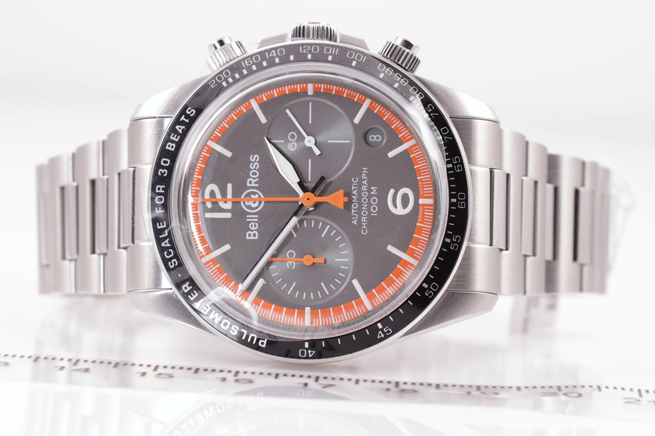 Bell & Ross BR V2-94 Garde Cotes stainless steel automatic mens watch. Matt grey chronograph dial, date, case diameter: 41mm, wrist size: 19.5cm, Swiss made. Ref# BRV294-ORA-ST/SST. With Bell & Ross stainless steel bracelet and clasp. Note: minor scratches on case and bracelet due to being display stock With Bell & Ross Warranty Card (nots stamped) and Bell & Ross worn box. 3 month FSA warranty. (As New)