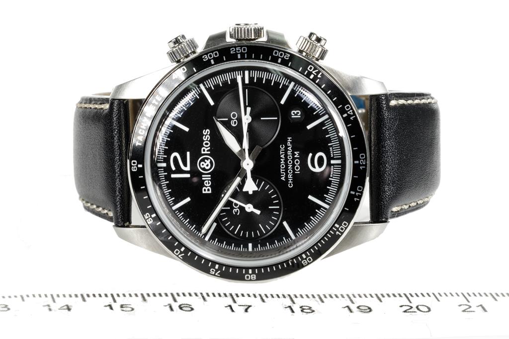 Bell & Ross BR V2 stainless steel automatic mens watch. Black dial, date, case diameter: 41mm, strap length: 21cm, Swiss made. Ref# BRV294-BL-ST/SCA. With Bell & Ross black leather strap and clasp. With Bell & Ross Warranty Card - the card is not stamped so the Bell & Ross warranty will not apply. No box provided. 3 month FSA warranty. (As New, Note: light wear on strap and minor scratches on case due to being display stock)