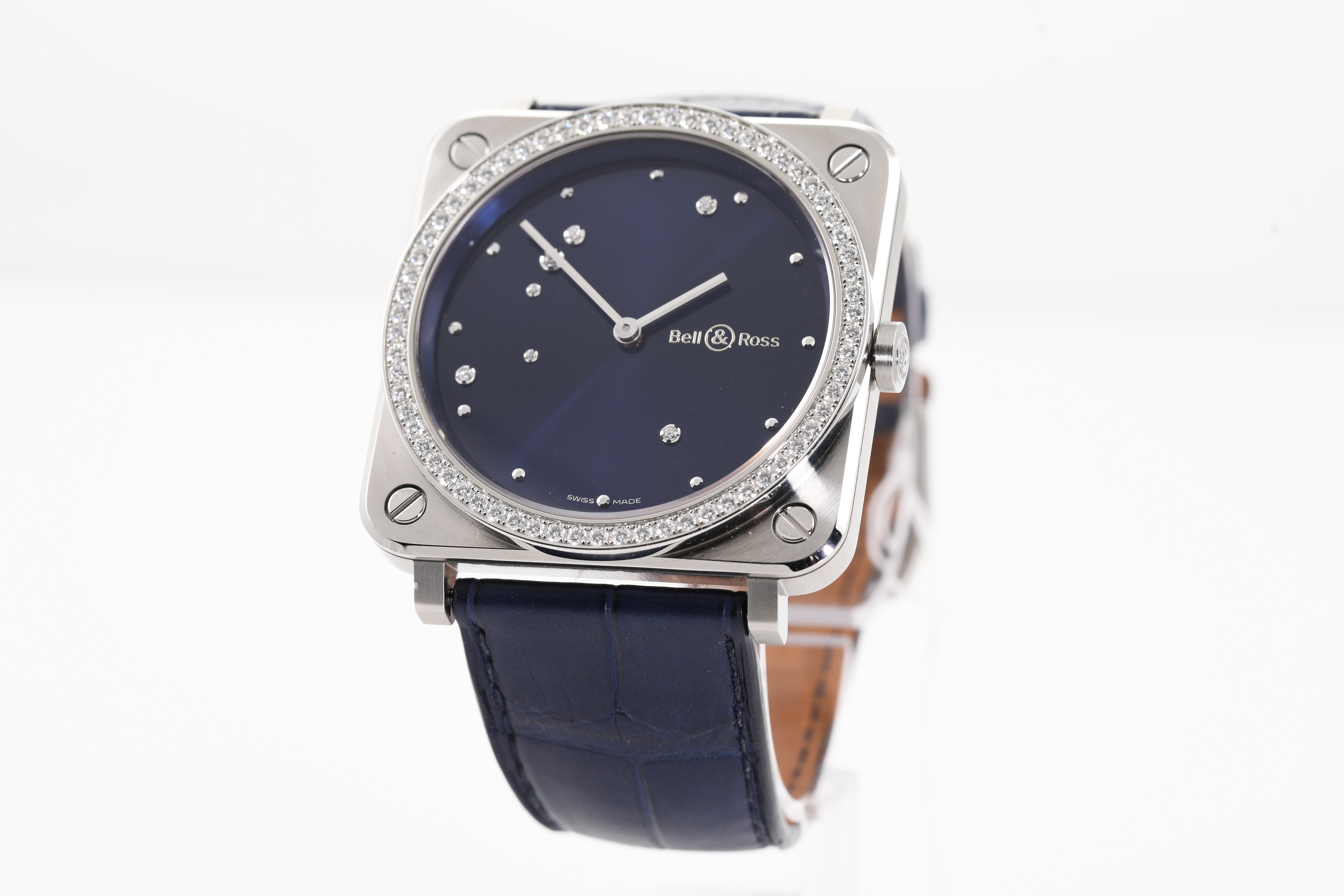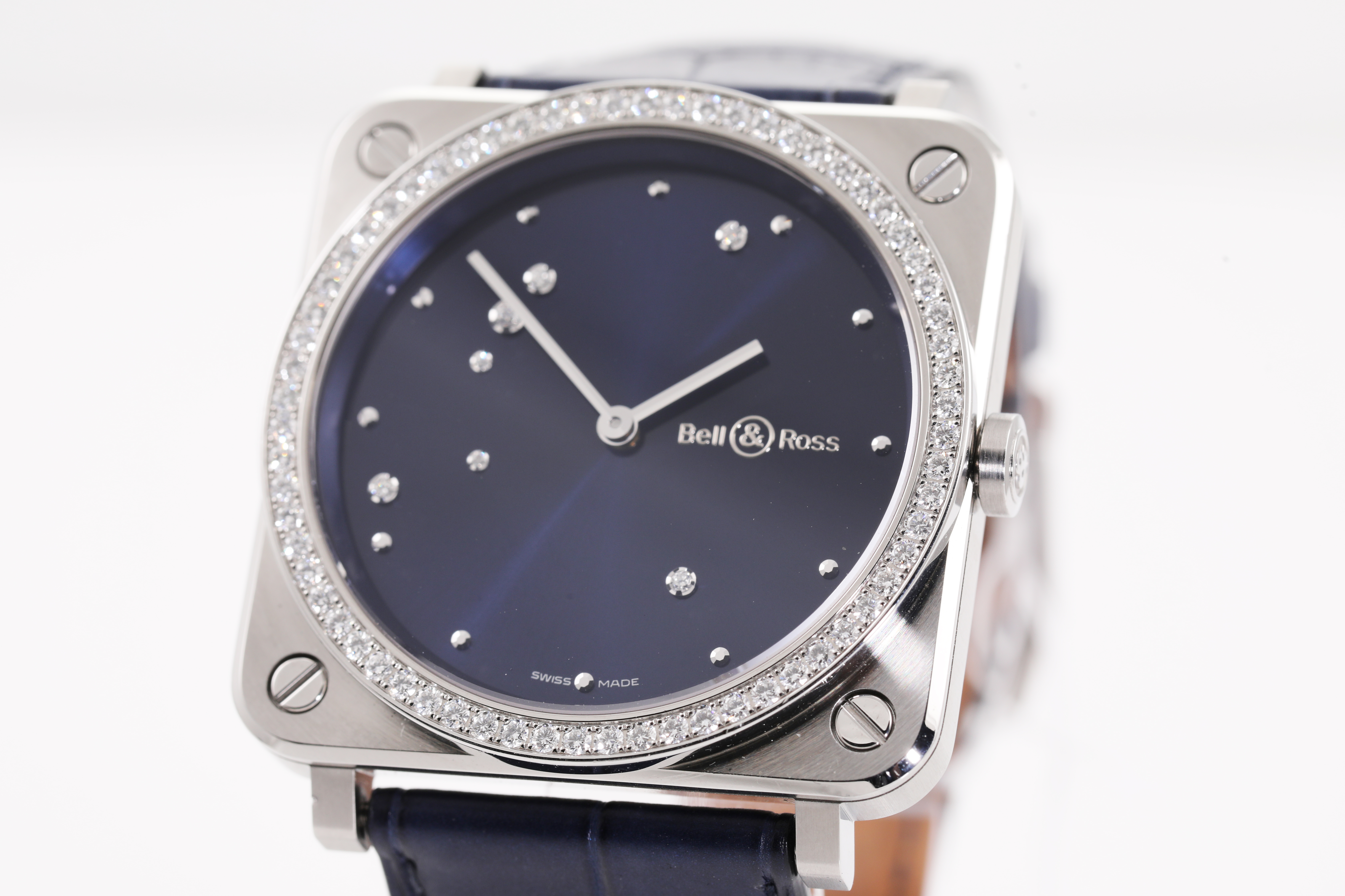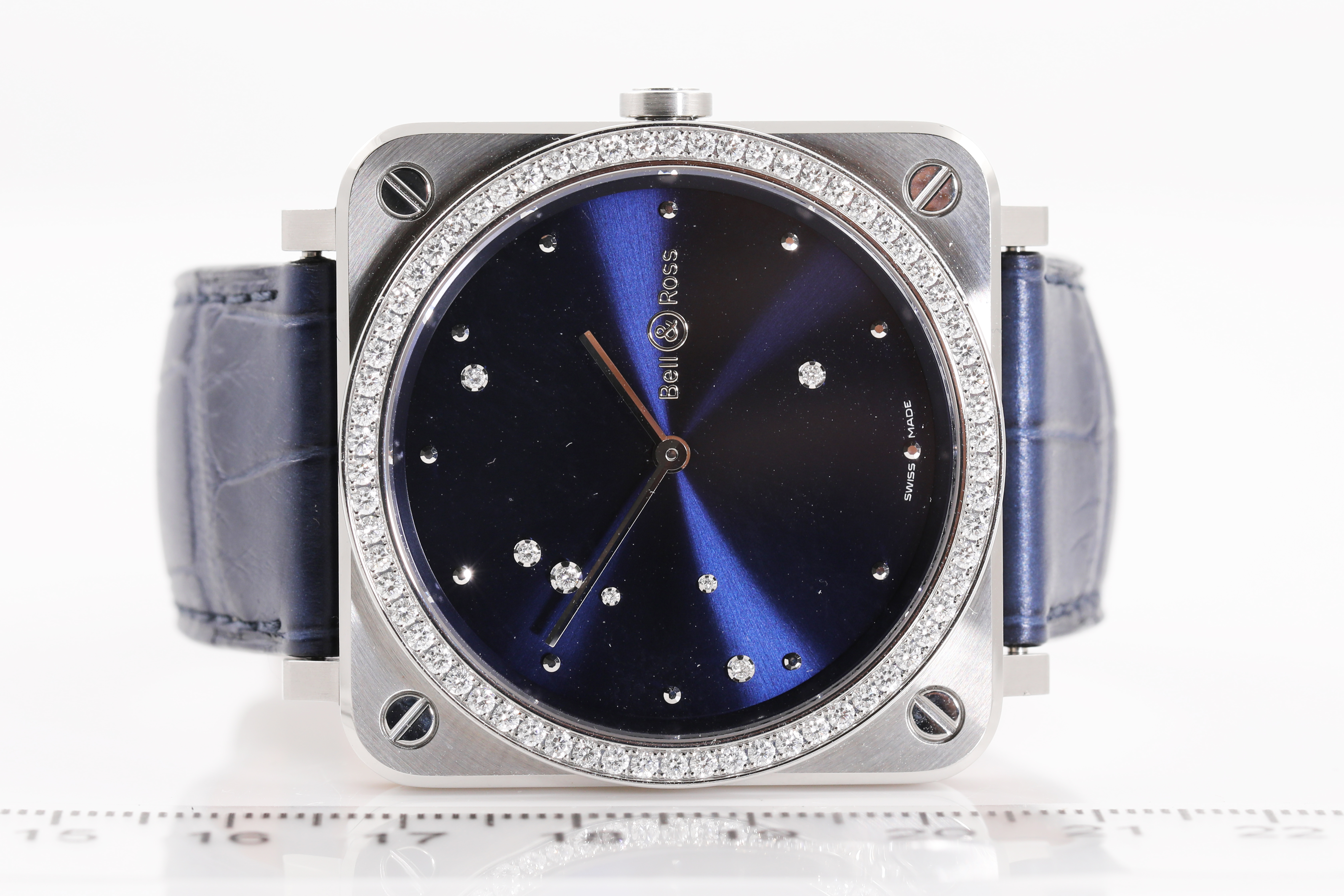 Bell & Ross BRS Blue Eagle Diamond stainless steel quartz mens watch. Blue dial with Diamonds and Diamond set bezel, case diameter: 39mm, wrist size: 18cm, Swiss made. Ref# BRS-EA-ST-LGD/SCR. With Bell & Ross blue leather strap and buckle. Note: light wear on strap due to being display stock. With Bell & Ross Warranty Card (not stamped) and Bell & Ross box. 3 month FSA warranty. (As New)