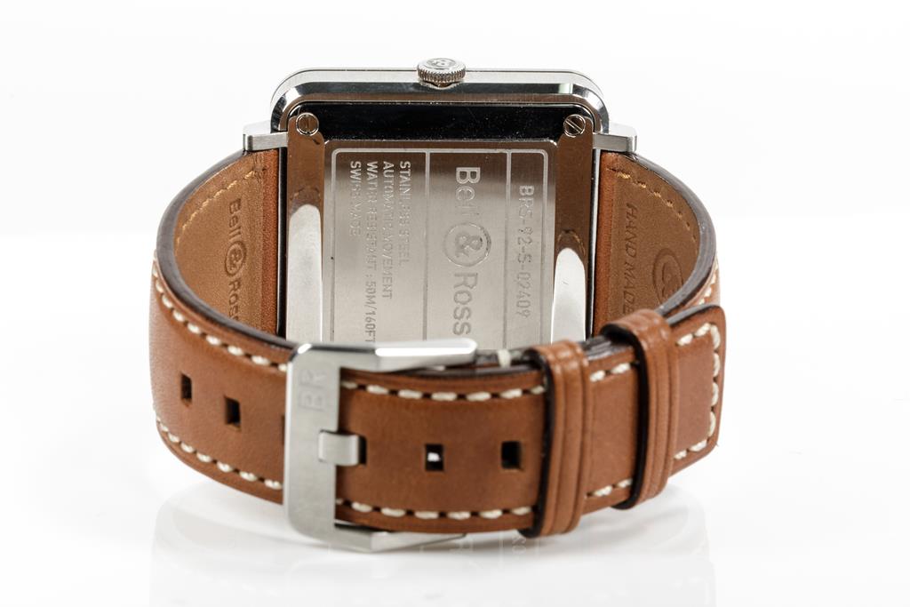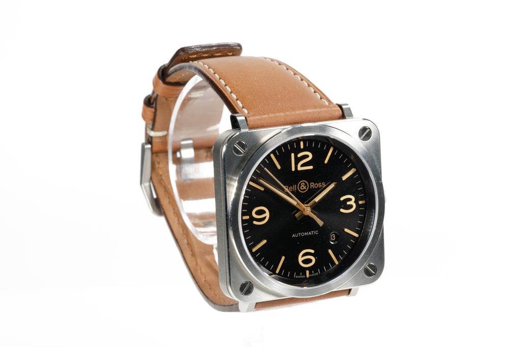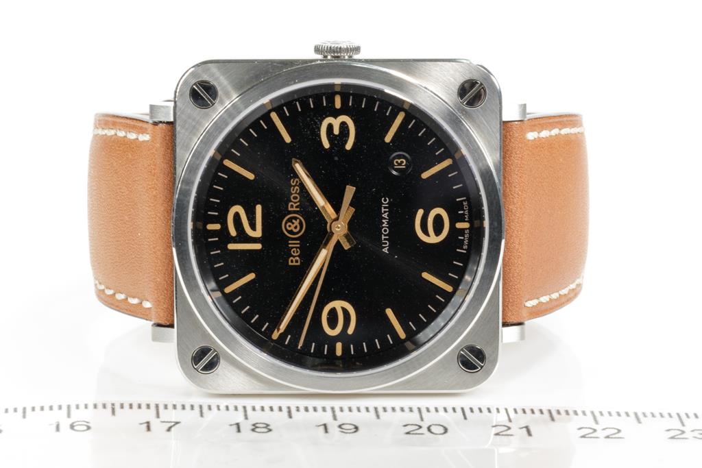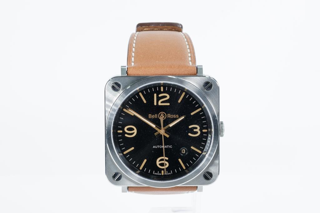Bell & Ross Golden Heritage stainless steel automatic mens watch. Black dial, date, case diameter: 39mm, strap length: 20cm, Swiss made. Ref# BRS92-G-HE-ST. With Bell & Ross brown leather strap and buckle. With Bell & Ross Warranty Card - the card is not stamped so the Bell & Ross warranty will not apply. No box provided. 3 month FSA warranty. (As New, Note: light wear on strap and minor scratches on case due to being display stock)
