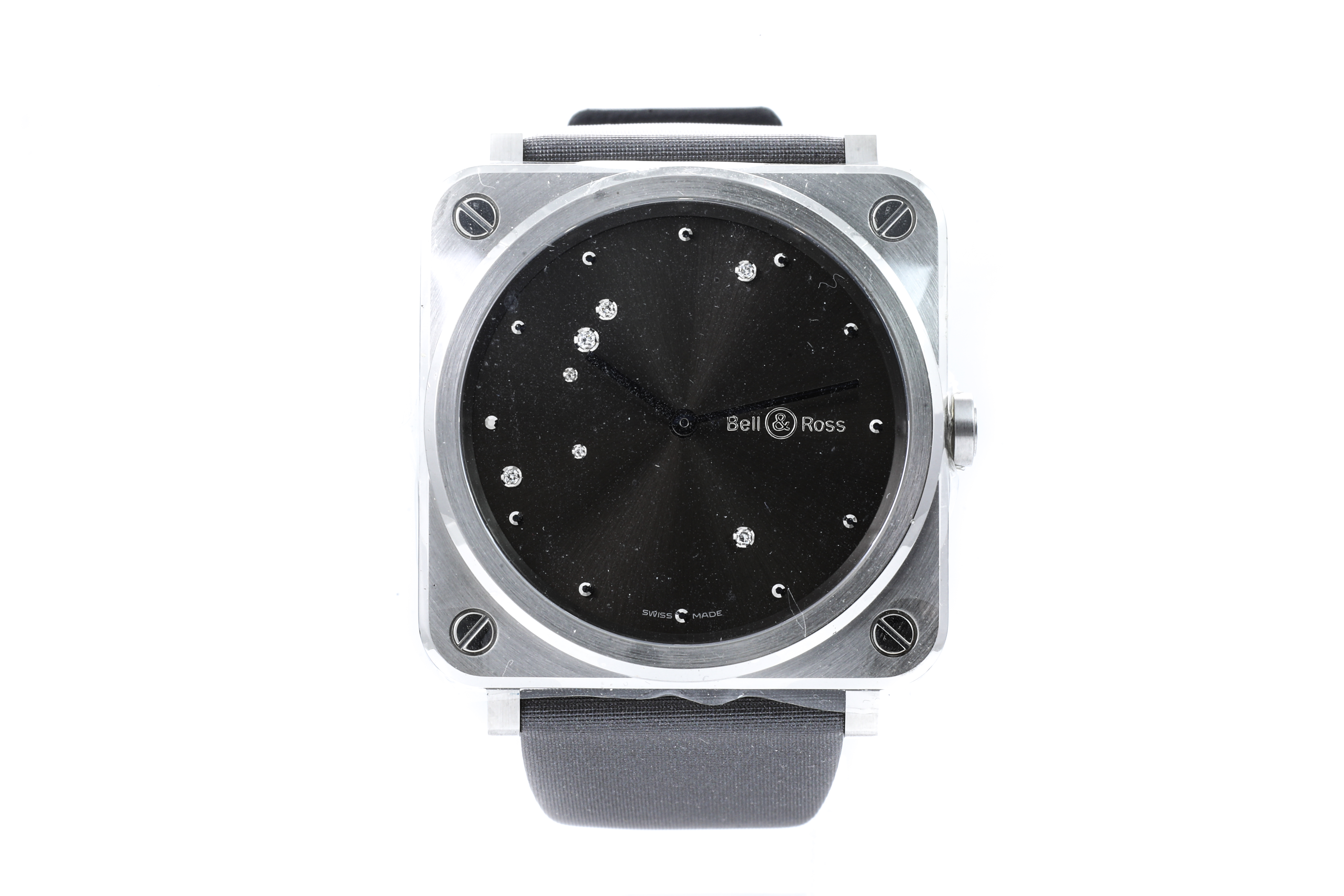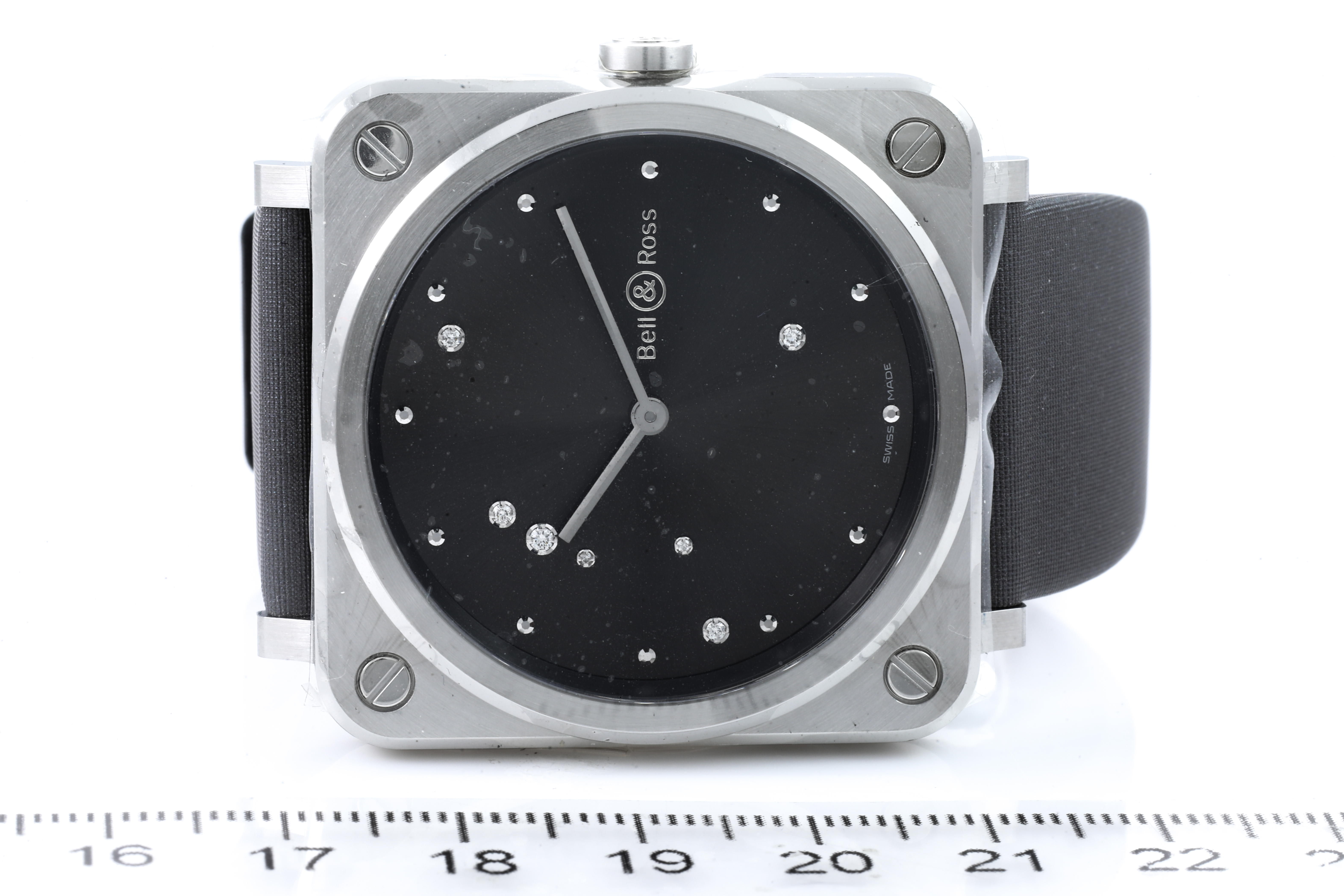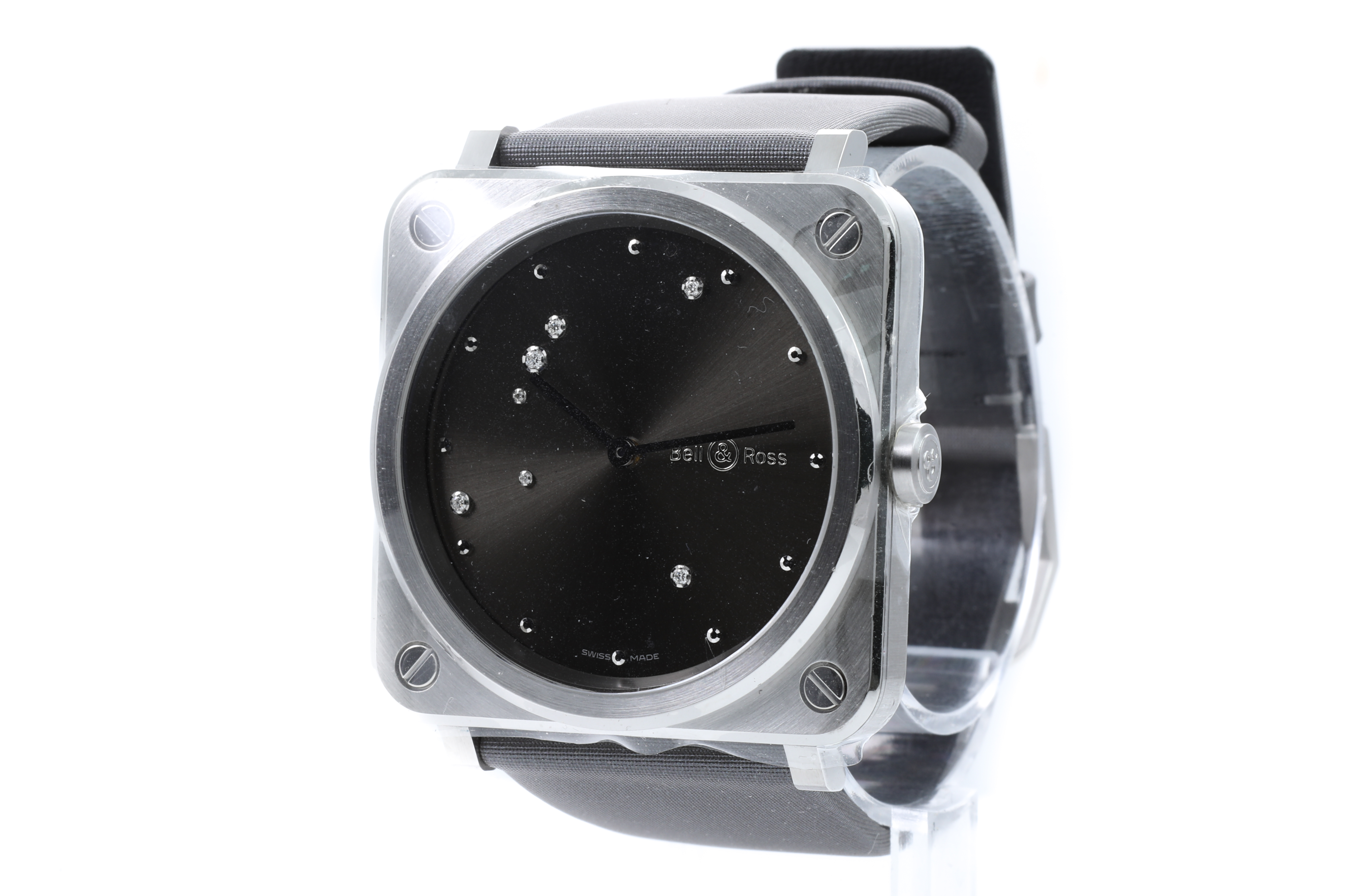 1843: Bell & Ross Instruments Grey Diamond Eagle stainless steel quartz mens watch. Grey Sunray dial set with 7 Diamonds, case diameter: 39mm, strap length: 18.5cm, Swiss made. Ref# BRS-ERU-ST/SCA. With Bell & Ross grey satin strap and buckle. With Oris warranty card - the card is not stamped so the Oris warranty will not apply. No box provided. 3 month FSA warranty. (As New)