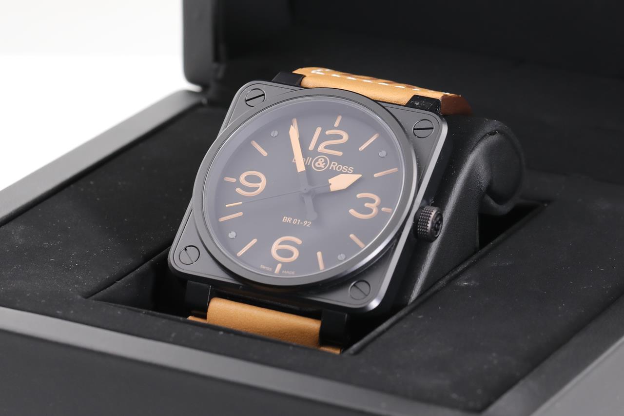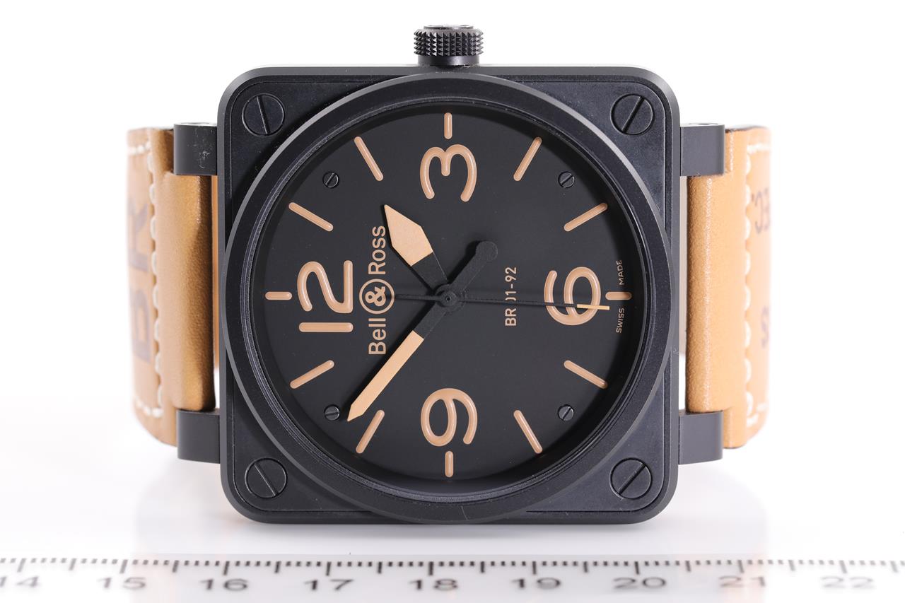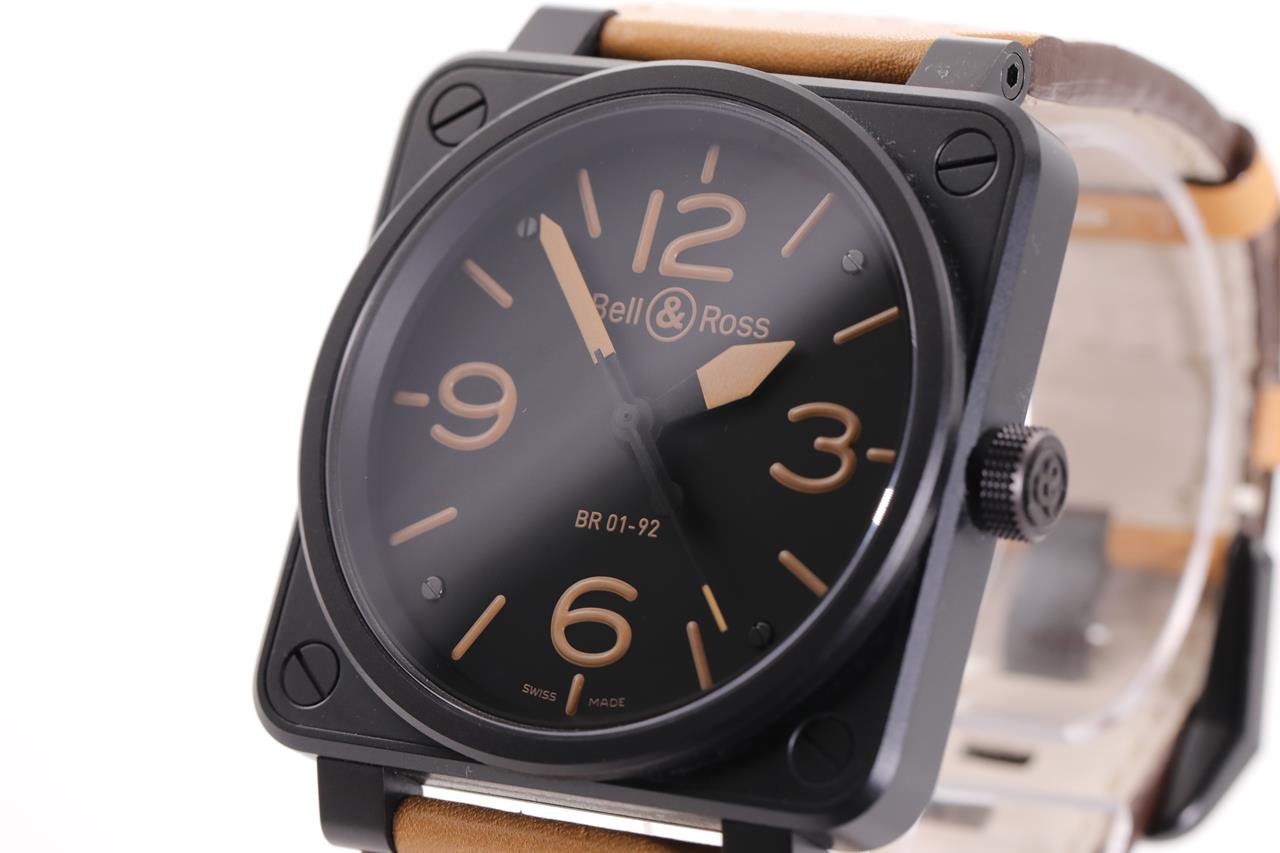 Bell & Ross Heritage matt black PVD stainless steel automatic mens watch. Black dial, case diameter: 42mm, length: 21cm, Swiss made. Ref# BR0192-HERITAGE. With Bell & Ross brown leather strap and buckle. Note: light wear on strap due to being display stock. With Bell & Ross Warranty Card (not stamped) and Bell & Ross box. 3 month FSA warranty. (As New)