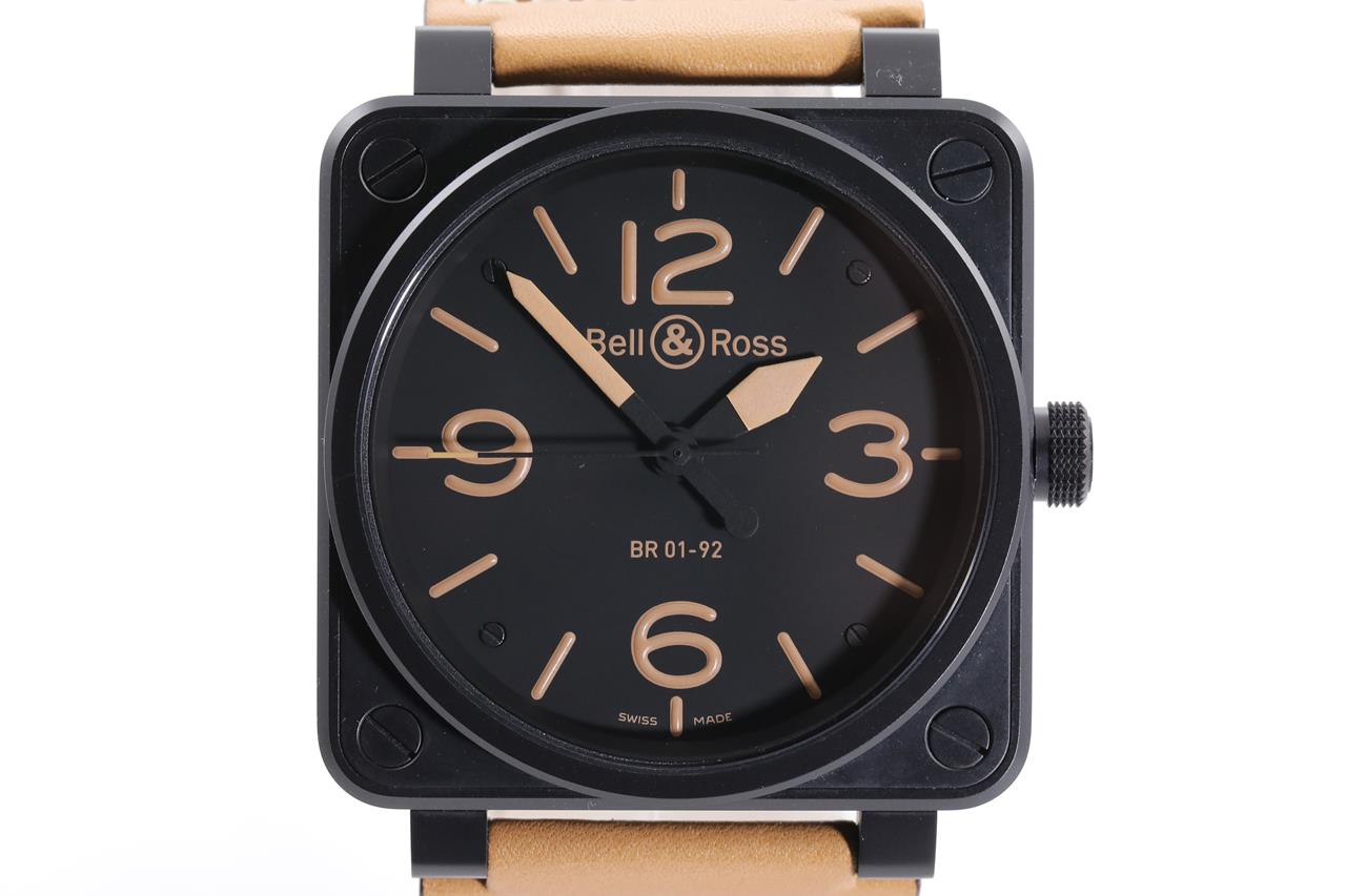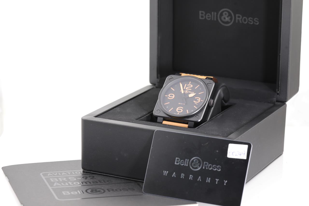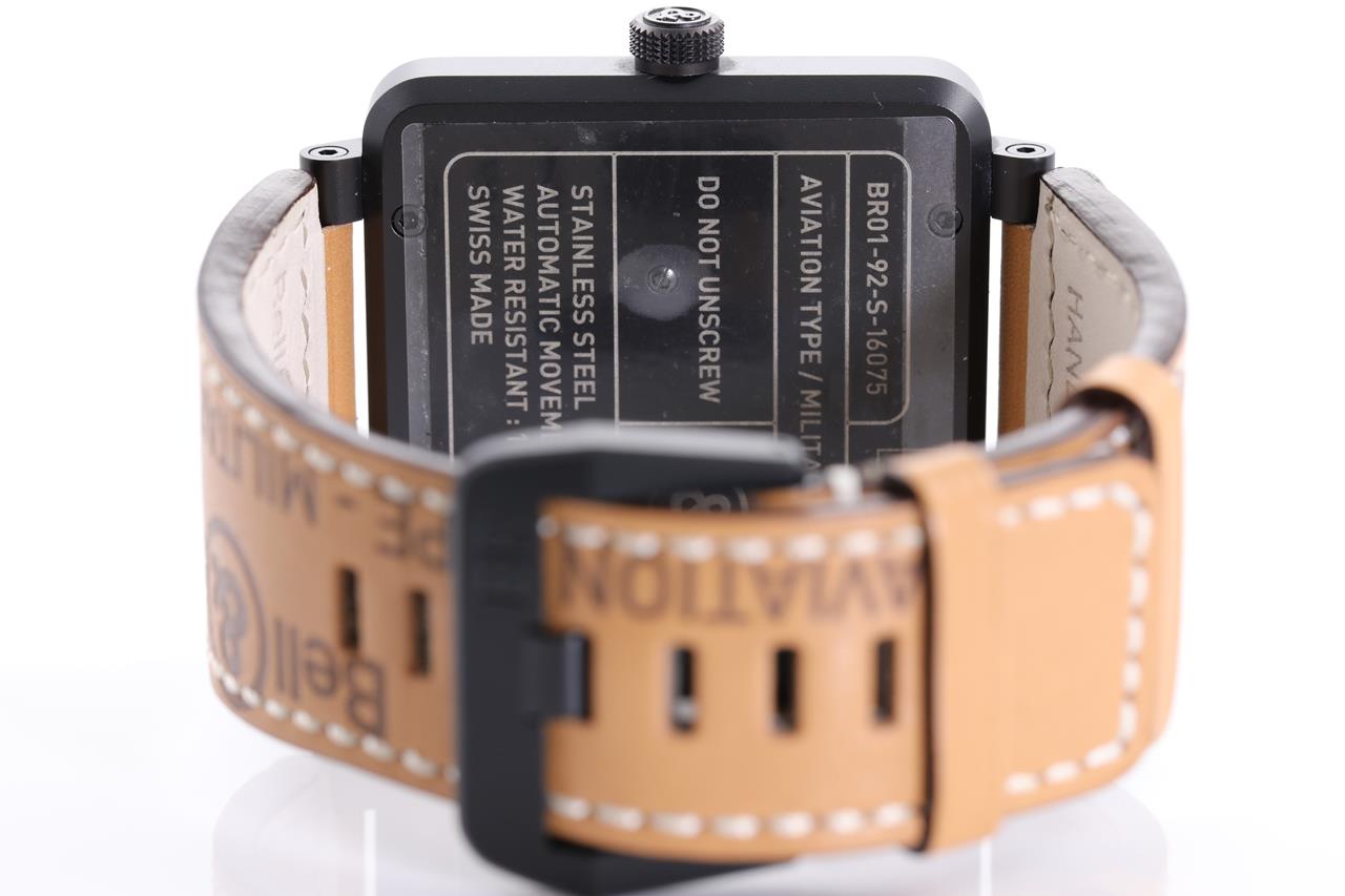 Bell & Ross Heritage matt black PVD stainless steel automatic mens watch. Black dial, case diameter: 42mm, length: 21cm, Swiss made. Ref# BR0192-HERITAGE. With Bell & Ross brown leather strap and buckle. Note: light wear on strap due to being display stock. With Bell & Ross Warranty Card (not stamped) and Bell & Ross box. 3 month FSA warranty. (As New)