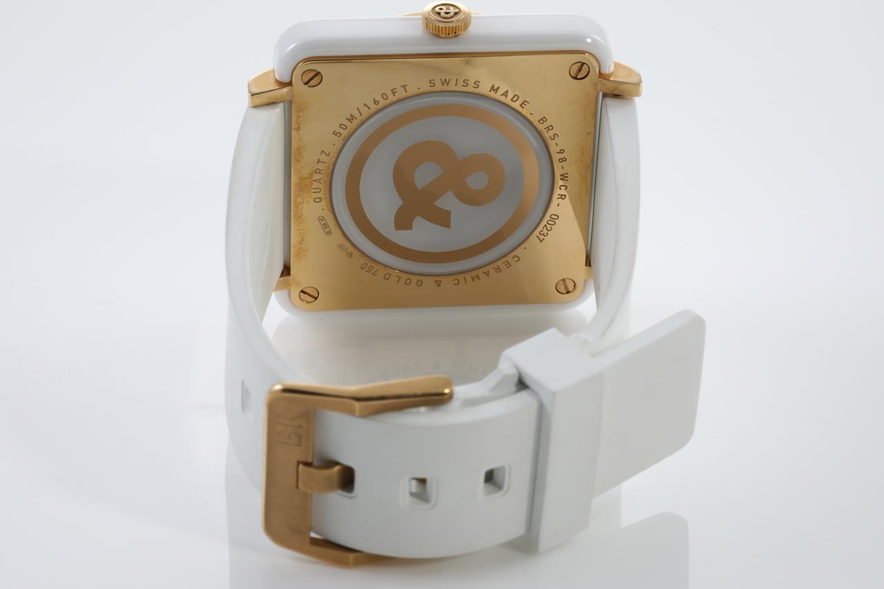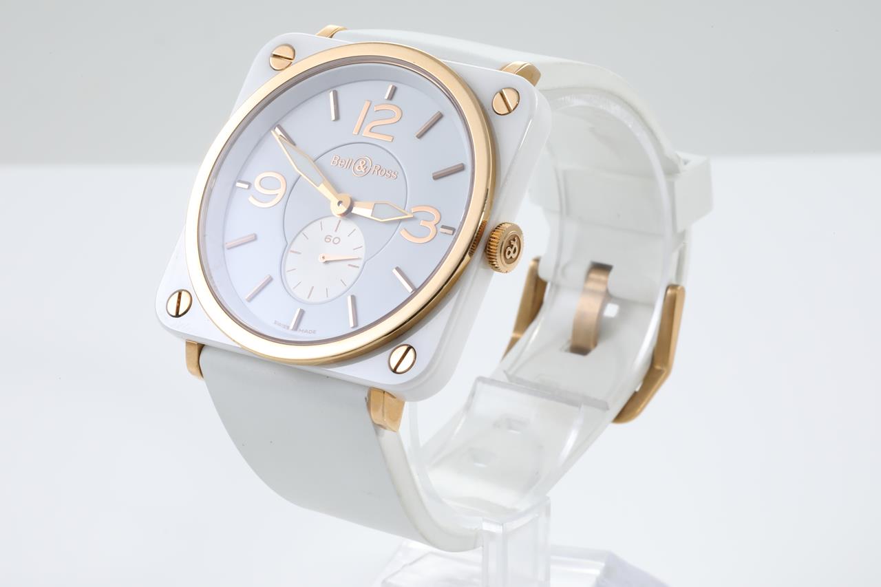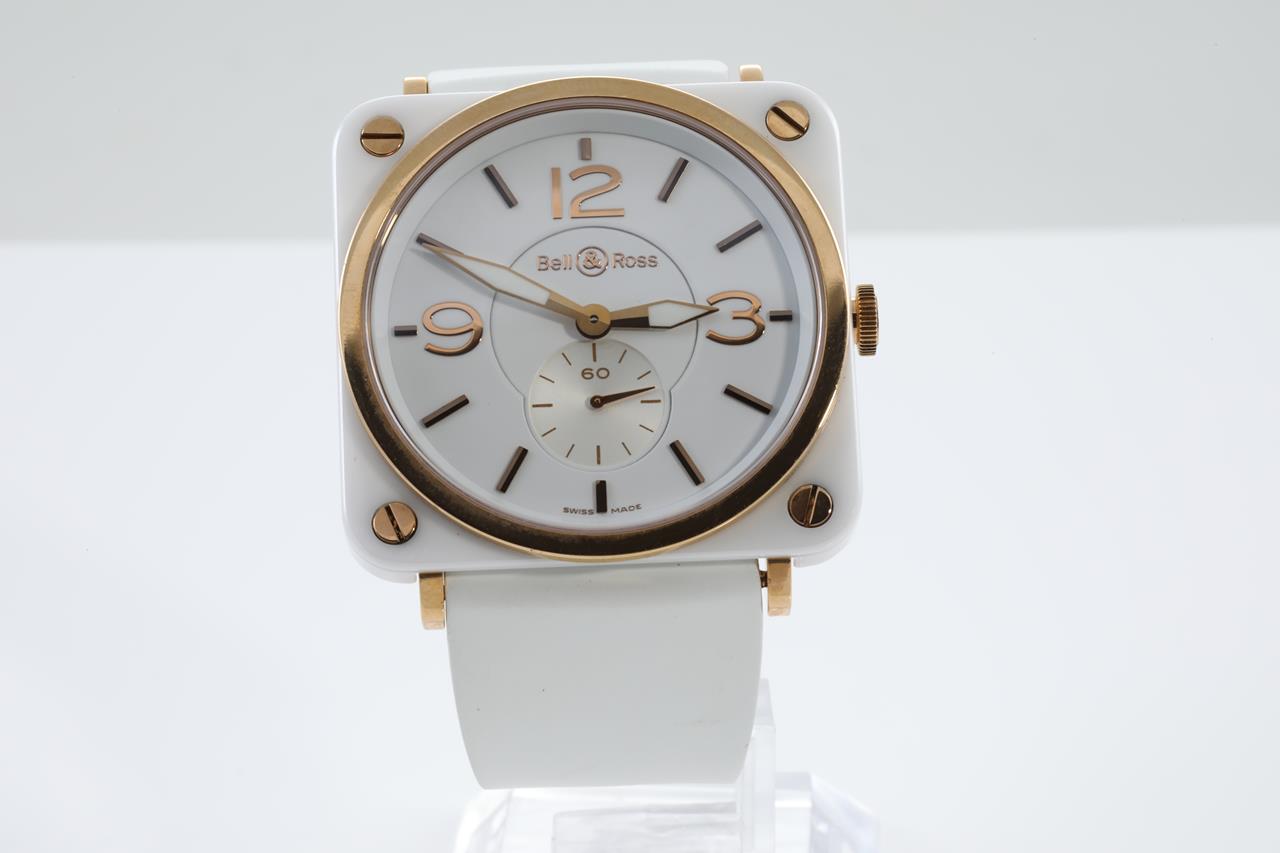 Bell & Ross 18ct rose gold and ceramic quartz watch. White dial, small second, case diameter: 38mm x 39mm, Swiss made. Ref #BRS-PKG-WH-C/SRB. With Bell & Ross white rubber strap and clasp. With instruction manual inside worn box. With FSA certifcate of authenticity. Manufacturers warranty card not supplied, 3 month FSA warranty applies. (As New)