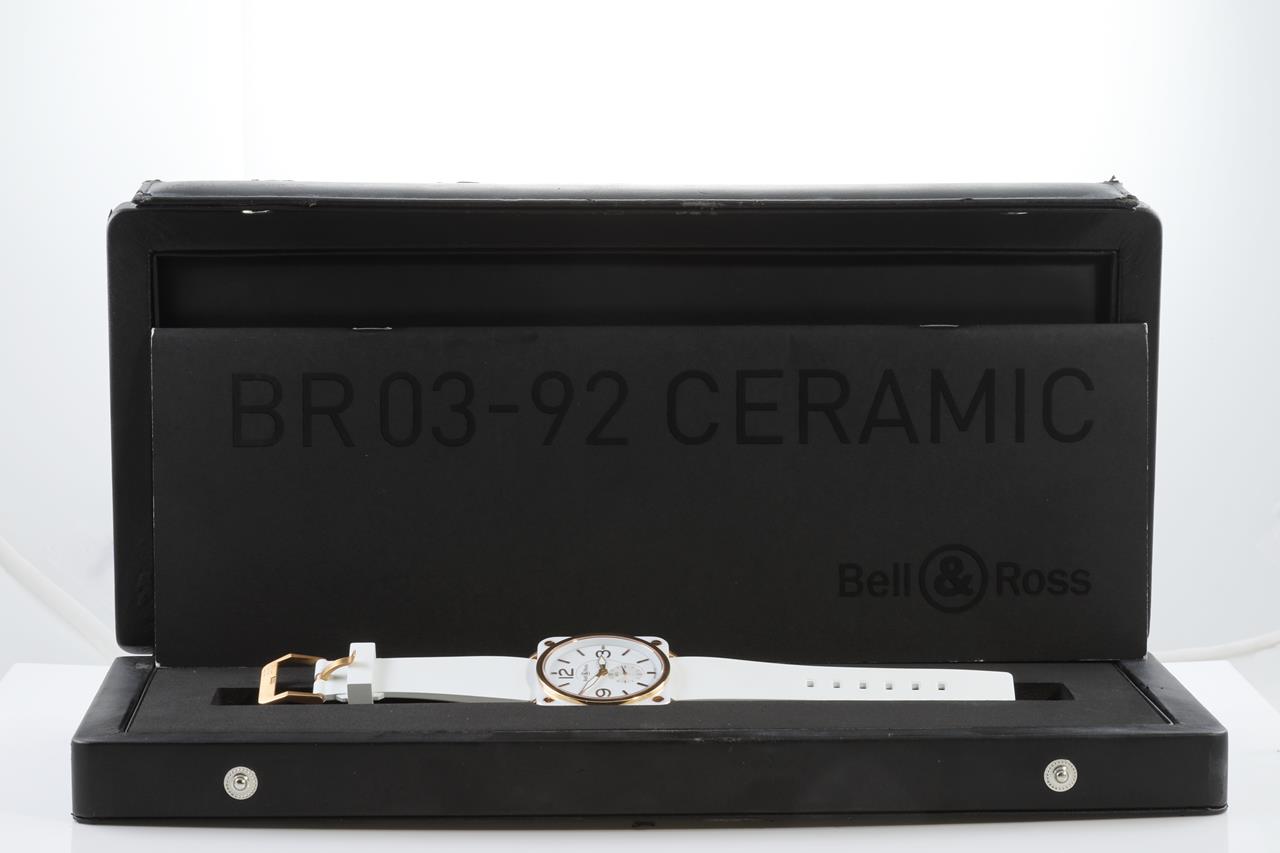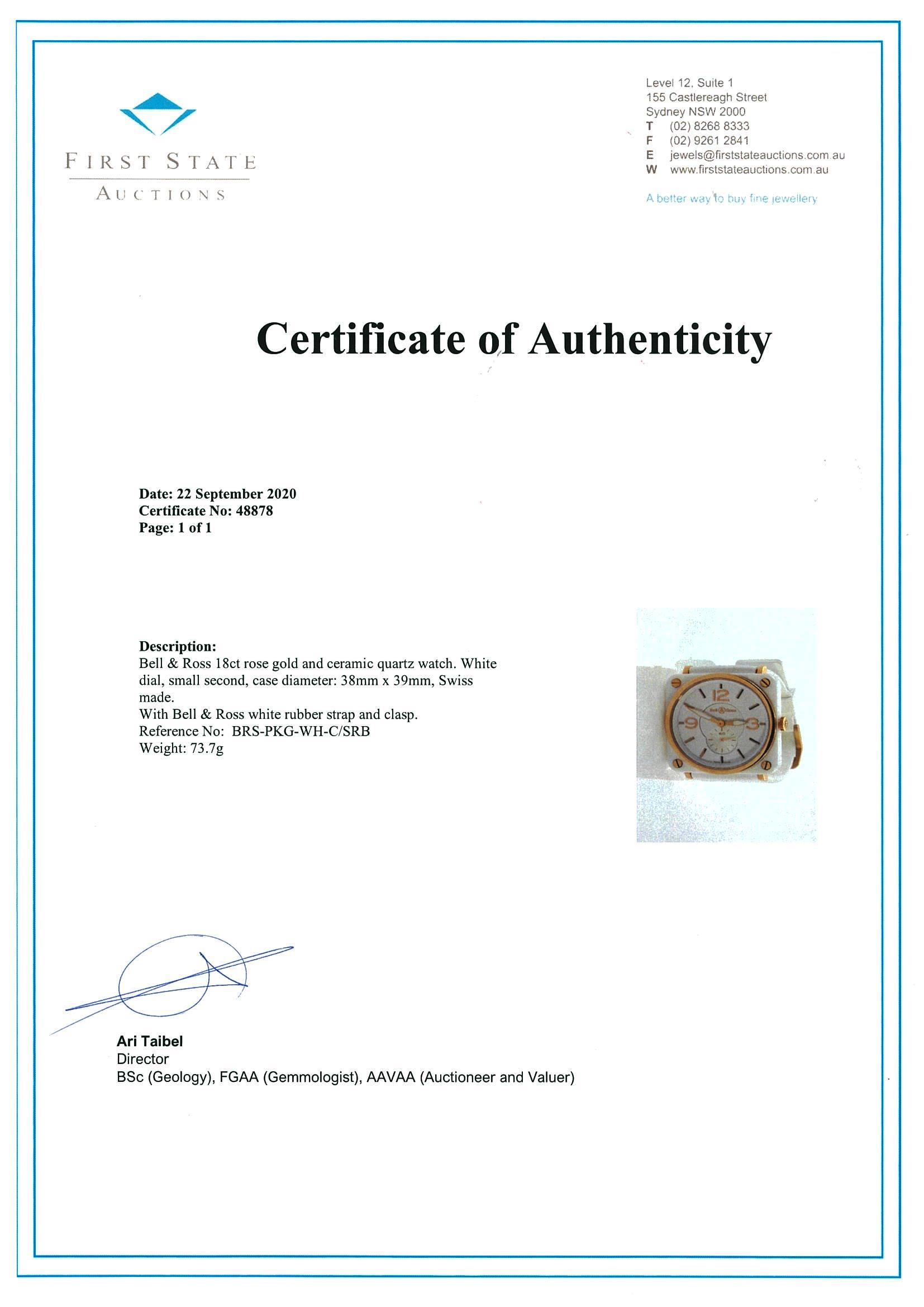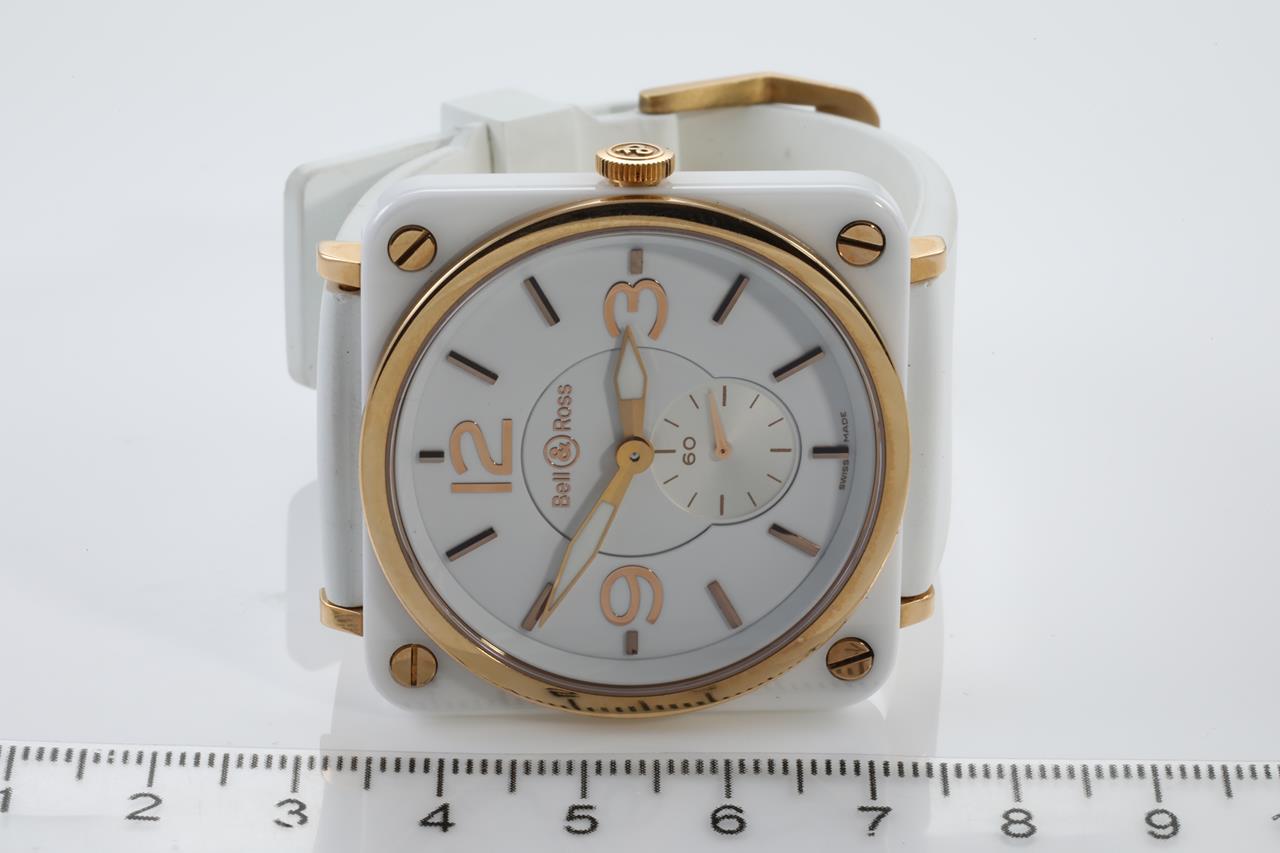 Bell & Ross 18ct rose gold and ceramic quartz watch. White dial, small second, case diameter: 38mm x 39mm, Swiss made. Ref #BRS-PKG-WH-C/SRB. With Bell & Ross white rubber strap and clasp. With instruction manual inside worn box. With FSA certifcate of authenticity. Manufacturers warranty card not supplied, 3 month FSA warranty applies. (As New)