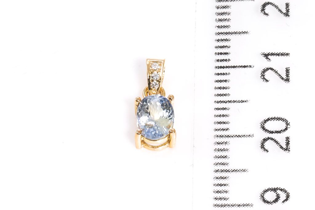 Bi coloured Sapphire Pendant with oval cut bi-coloured unheated blue-yellow Sapphire of 1.00ct (with gem report) and Diamonds totalling approximately 0.03ct. 18ct yellow gold. Weight 0.8g. No chain provided. With Gem Report (As New)