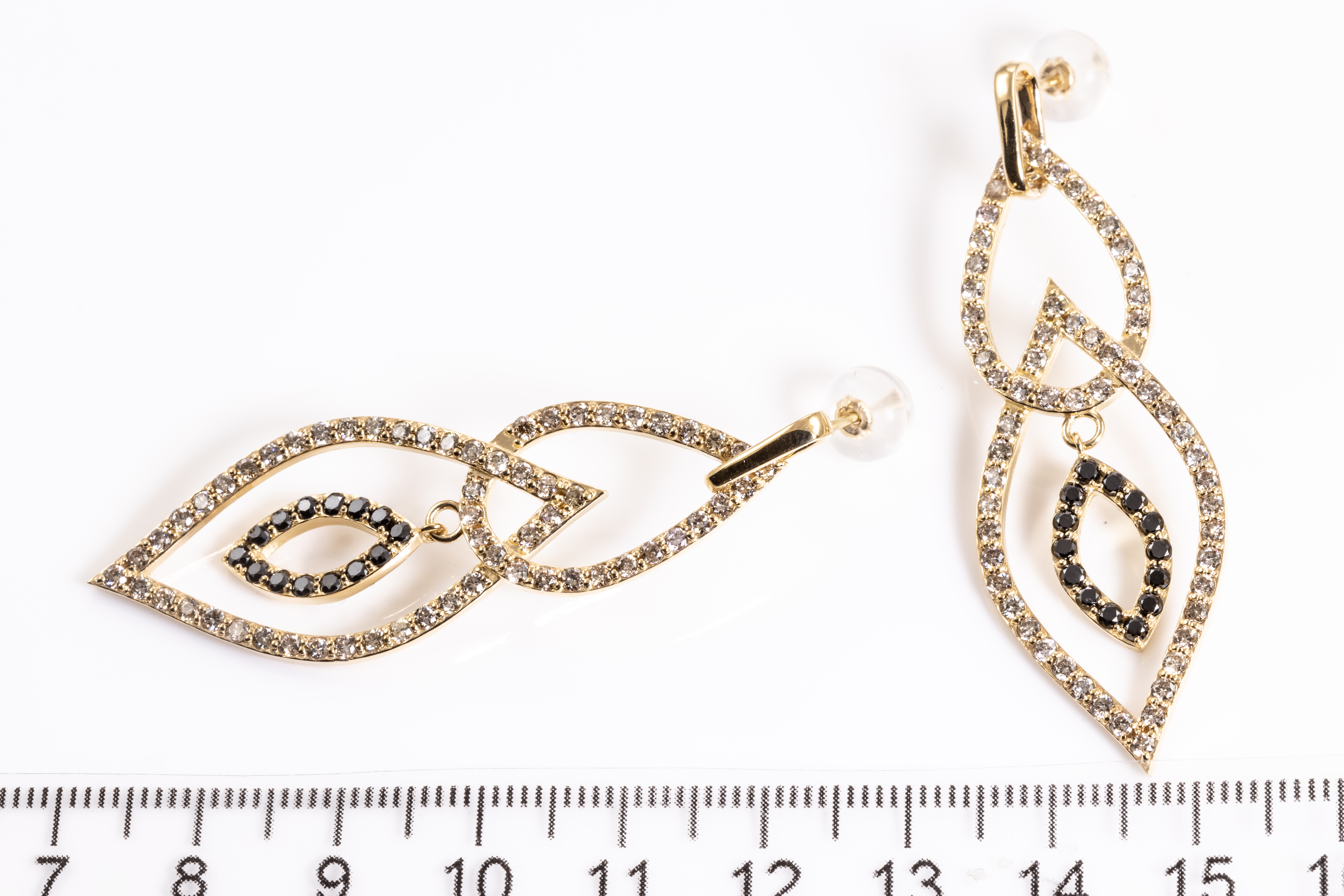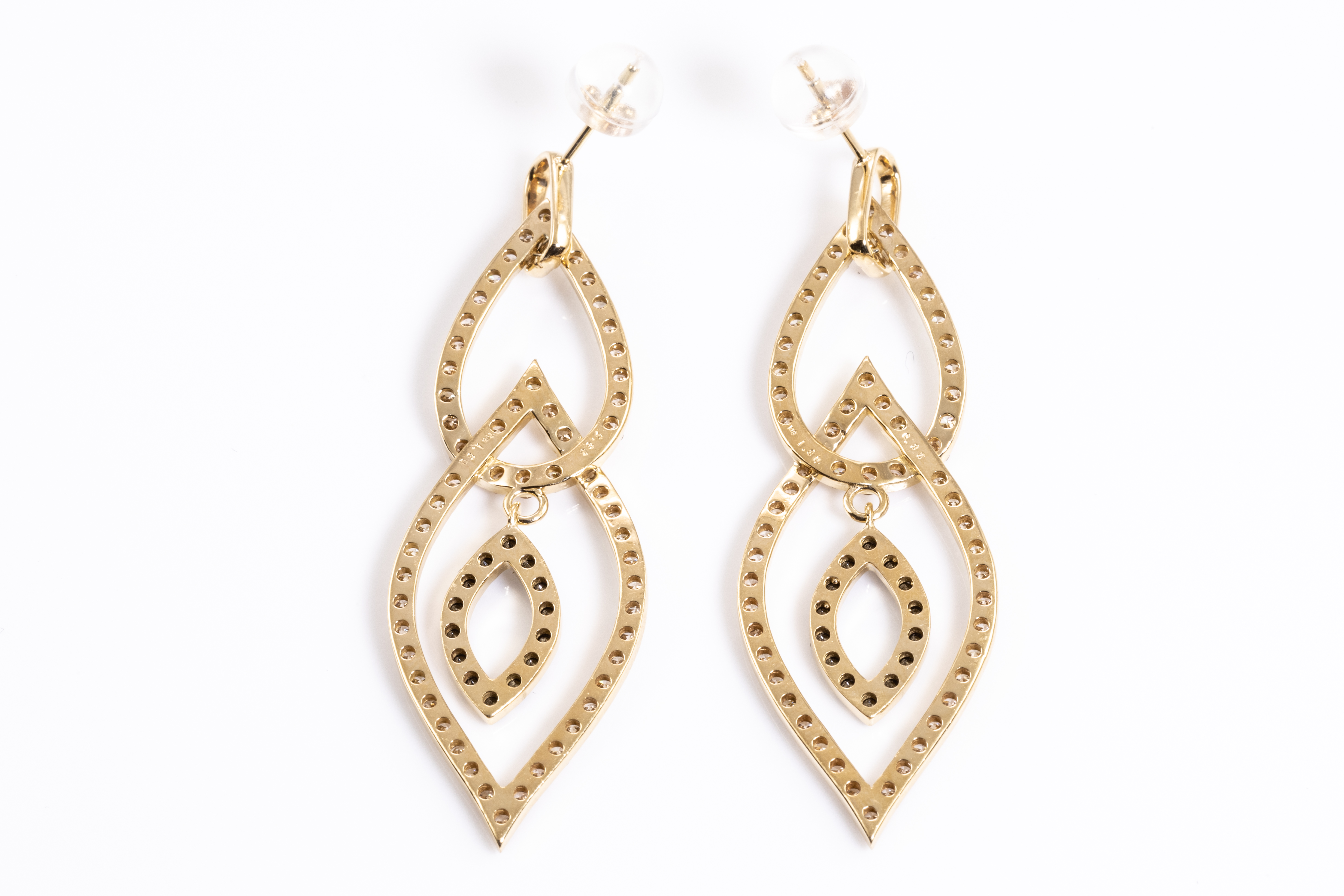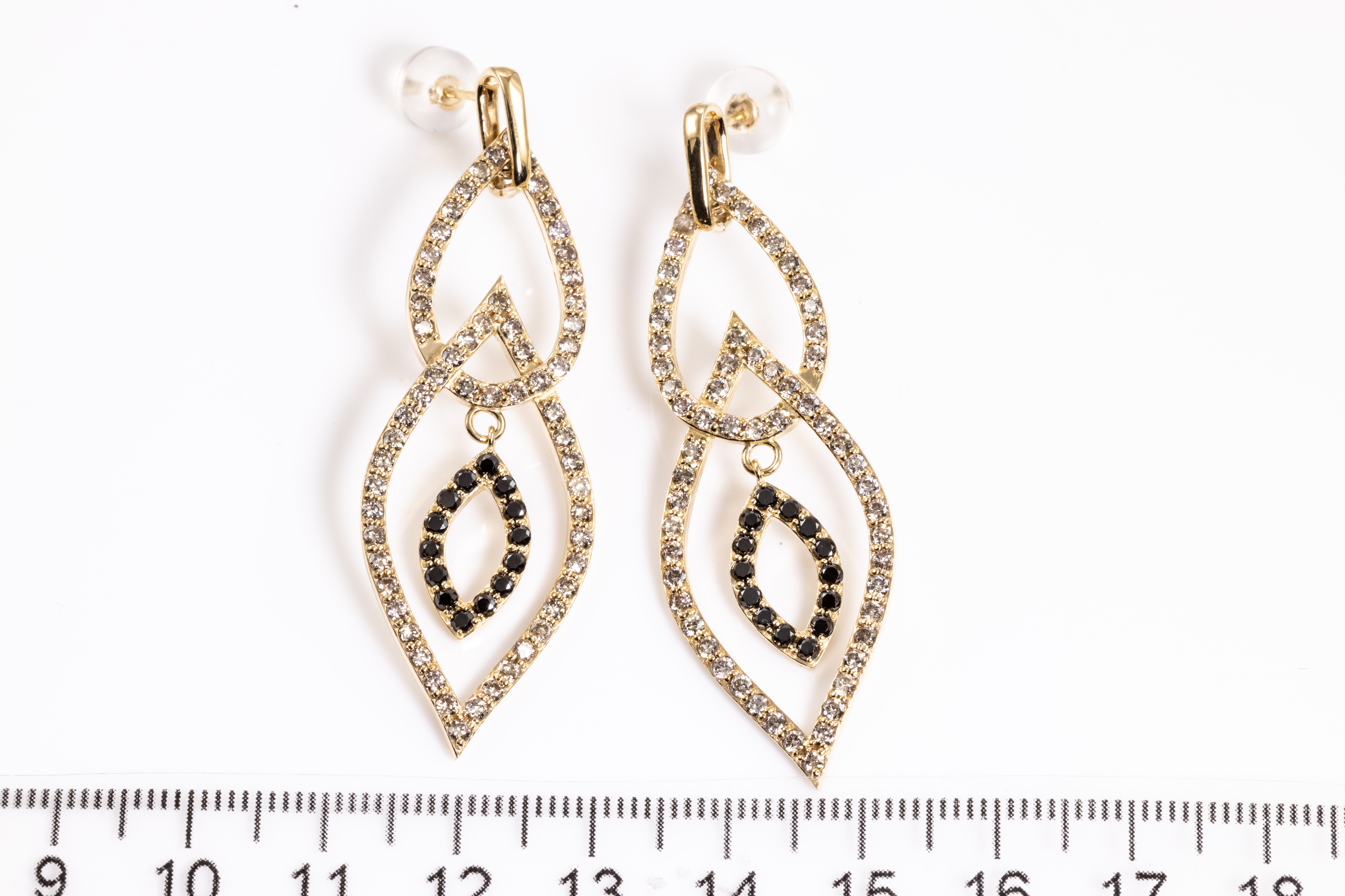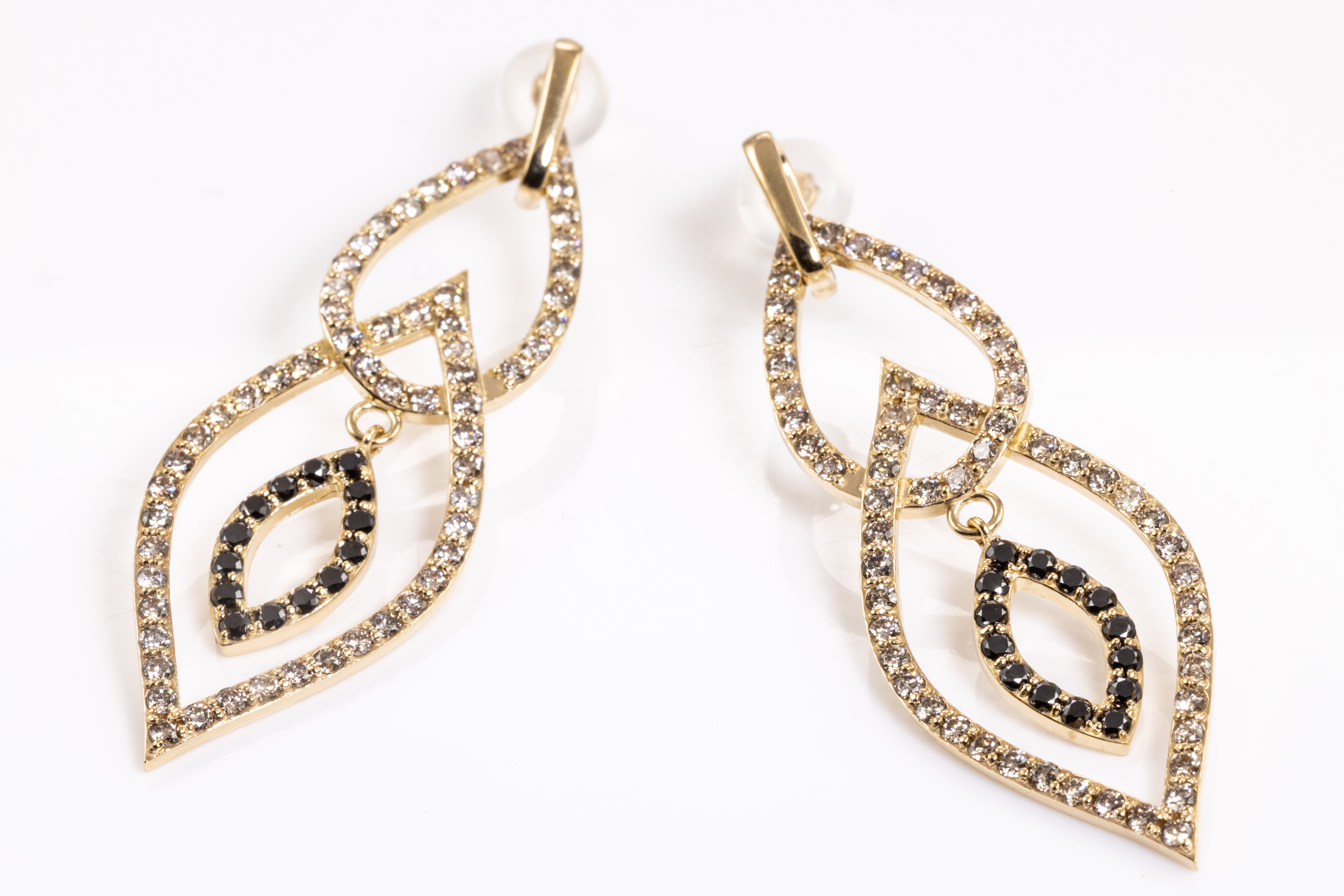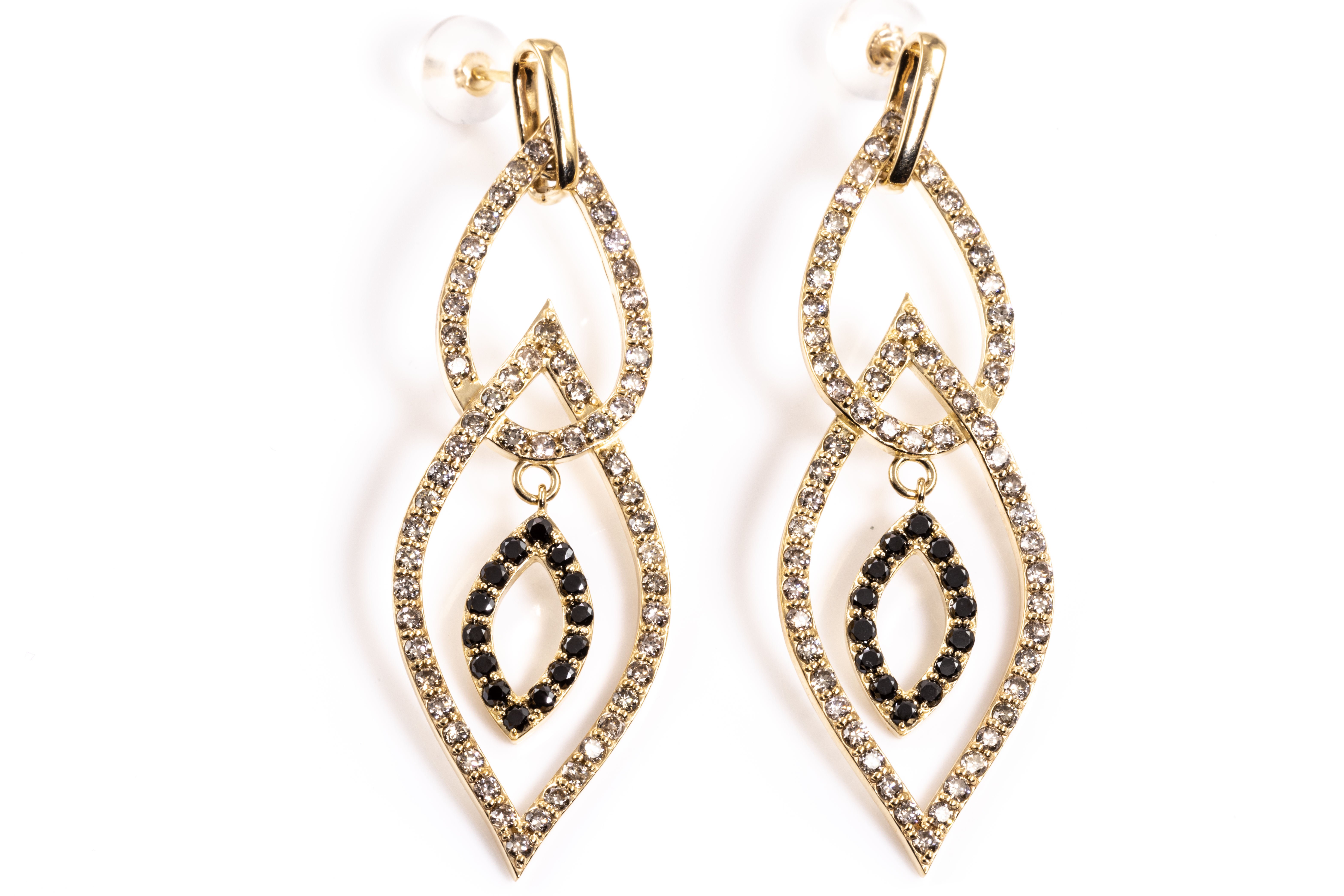 Diamond dangle earrings with round Black Diamonds (diamonds may be treated) totalling 0.70cts and round Diamonds totalling 2.60ccts (Estimated grading: TLB SI). 18ct yellow gold with silicon backs. Weight: 12g. (Pre-owned)
