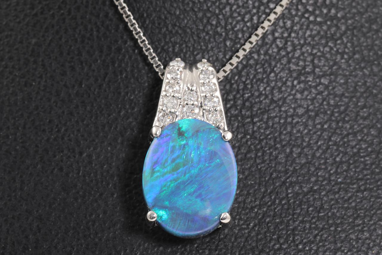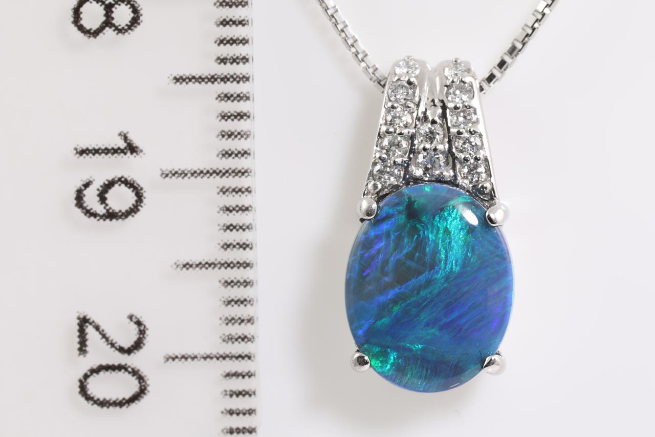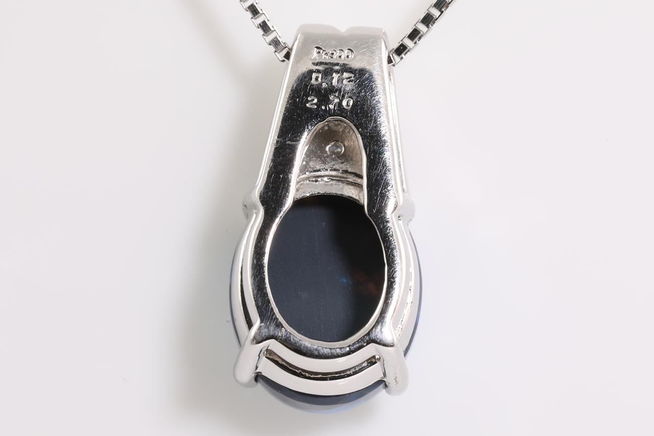 Opal and Diamond pendant with an oval Black Opal of 2.70ct and Diamonds totalling 0.12cts. Platinum with 44cm adjustable chain. Weight: 6g. (Pre-owned)