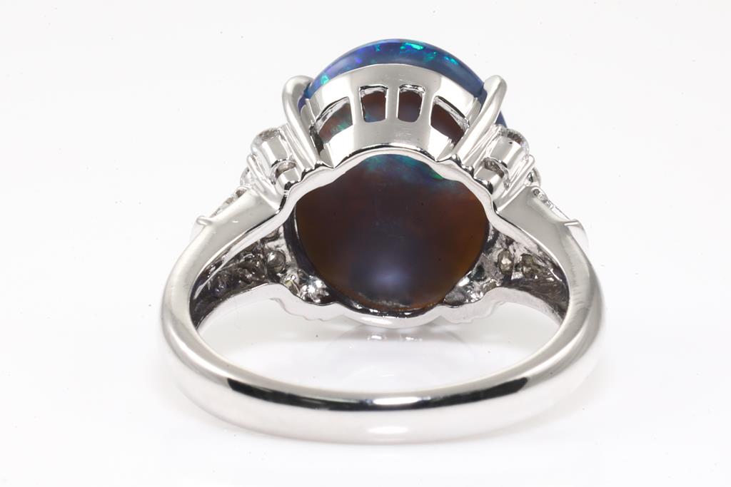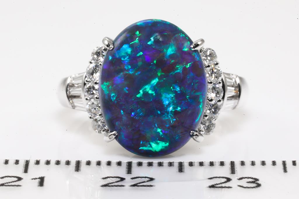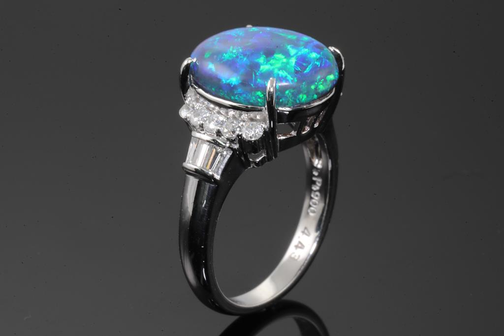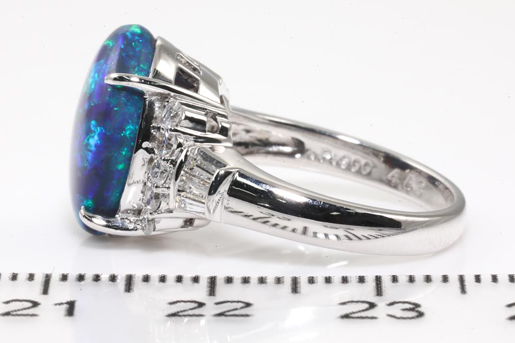 Opal and Diamond ring with Black Opal of 4.43ct with round & baguette cut Diamonds totalling 0.40cts (Estimated grading: G SI). Platinum. Ring size J. Weight: 6.8g (Pre-owned)