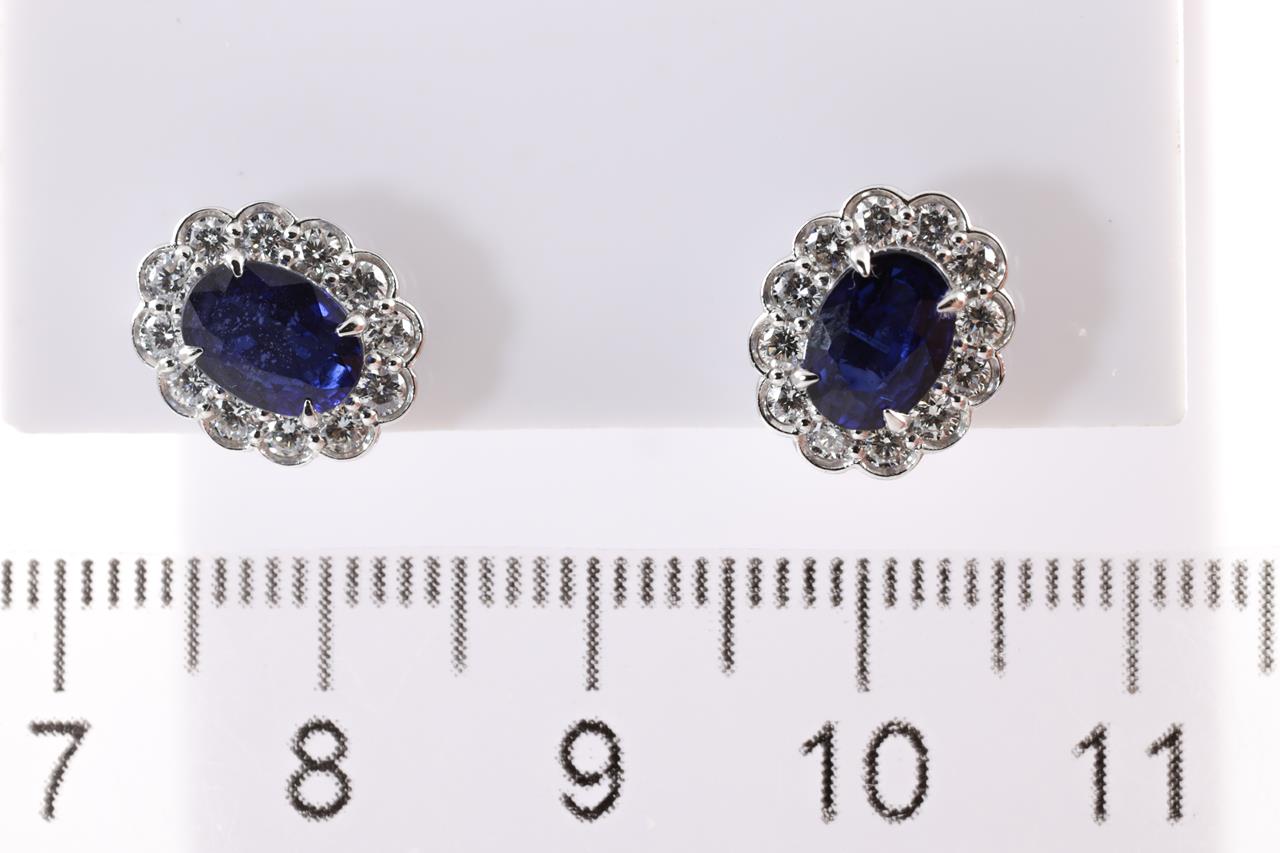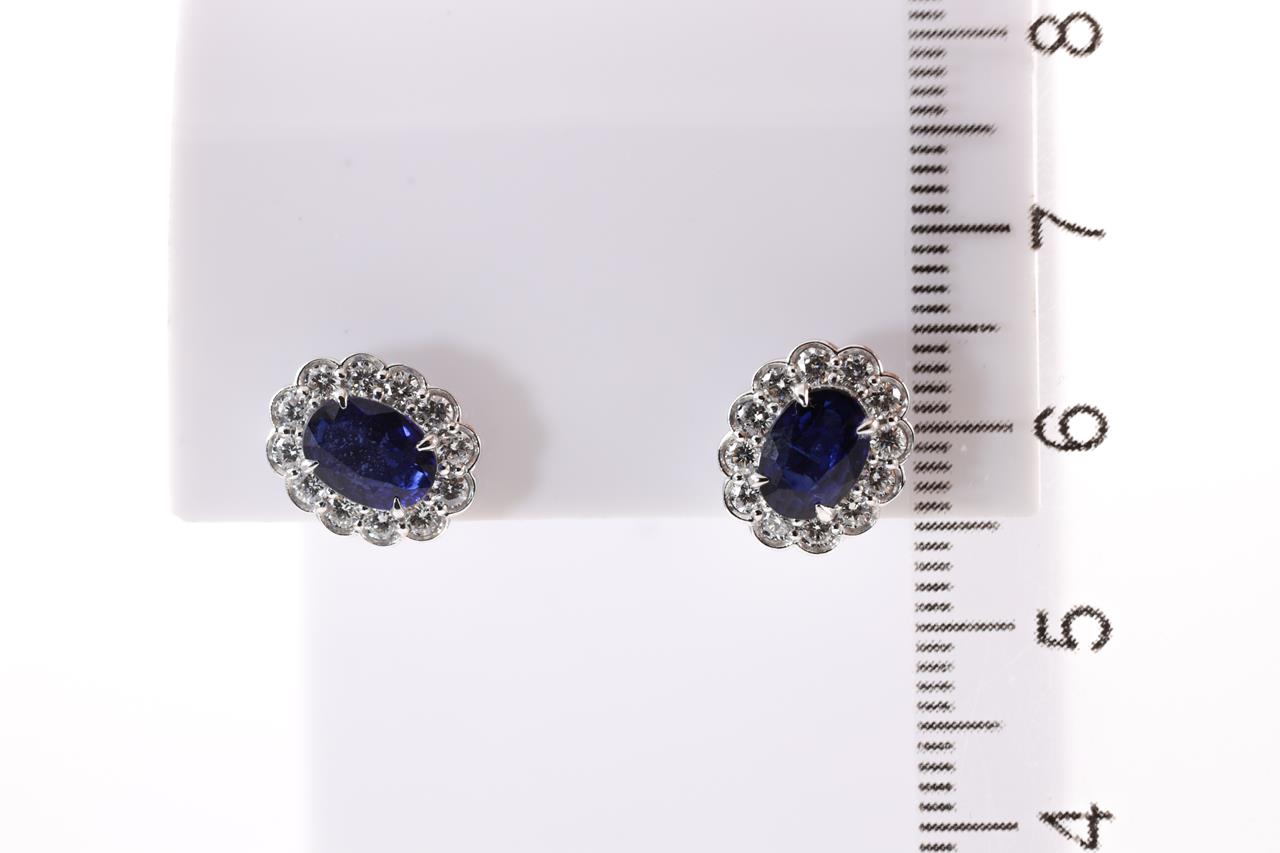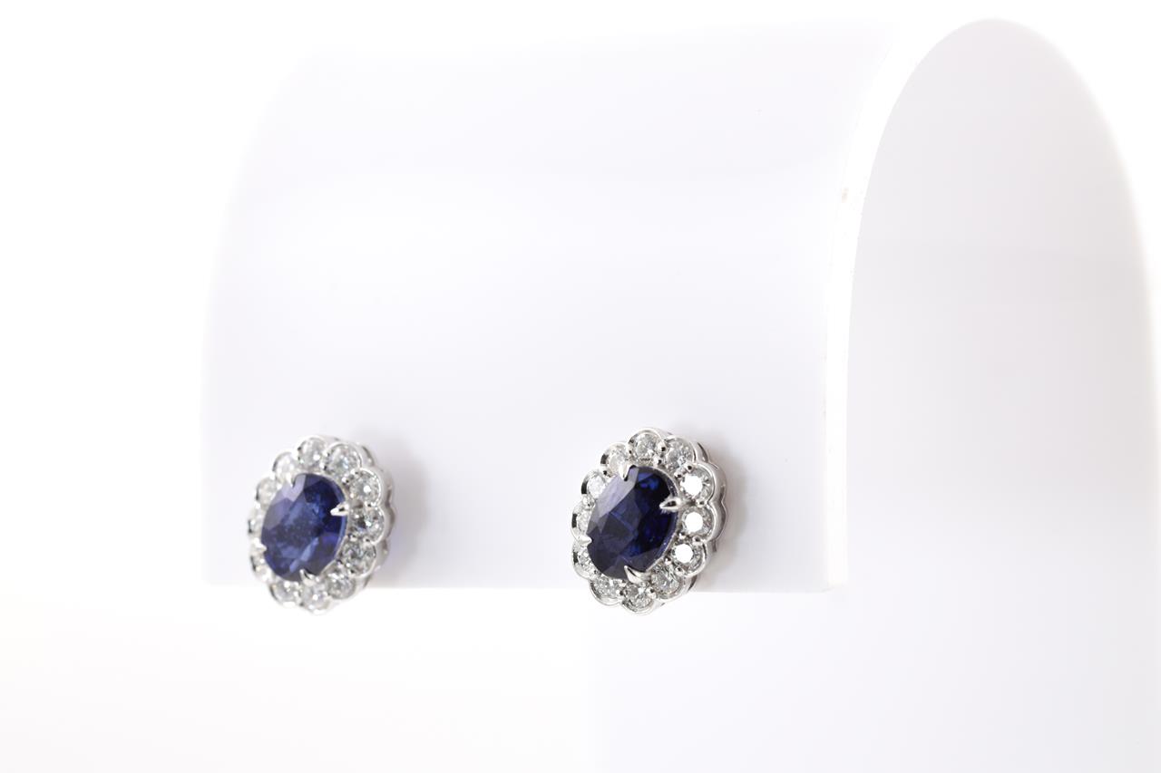 Blue Sapphire and Diamond Earrings with oval cut Blue Sapphires totalling approximately 1.98cts and round Diamonds totalling approximately 0.57cts (Estimated Grading H SI). 18ct white gold. Weight 3.4g. (Pre-owned)