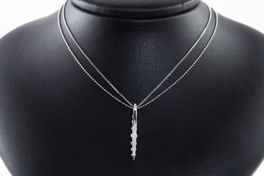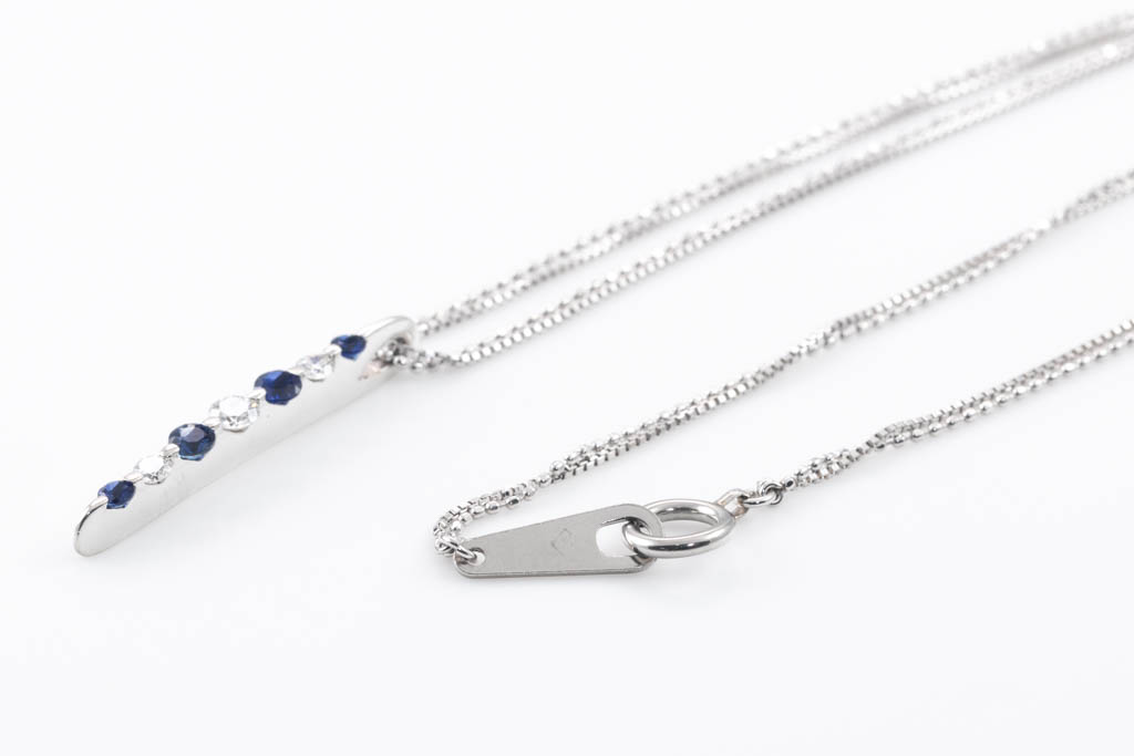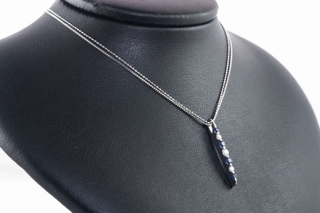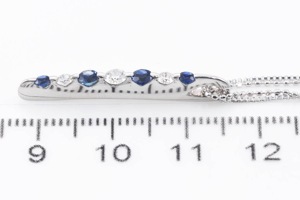 Sapphire and Diamond pendant with 4 round Blue Sapphires totalling 0.35cts and 3 round Diamonds totalling 0.24cts. 18ct white gold with 42cm platinum adjustable chain. Weight: 5.4g. (Pre-owned)