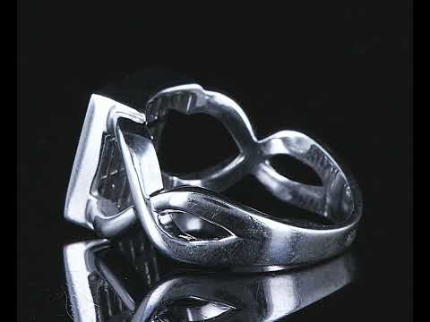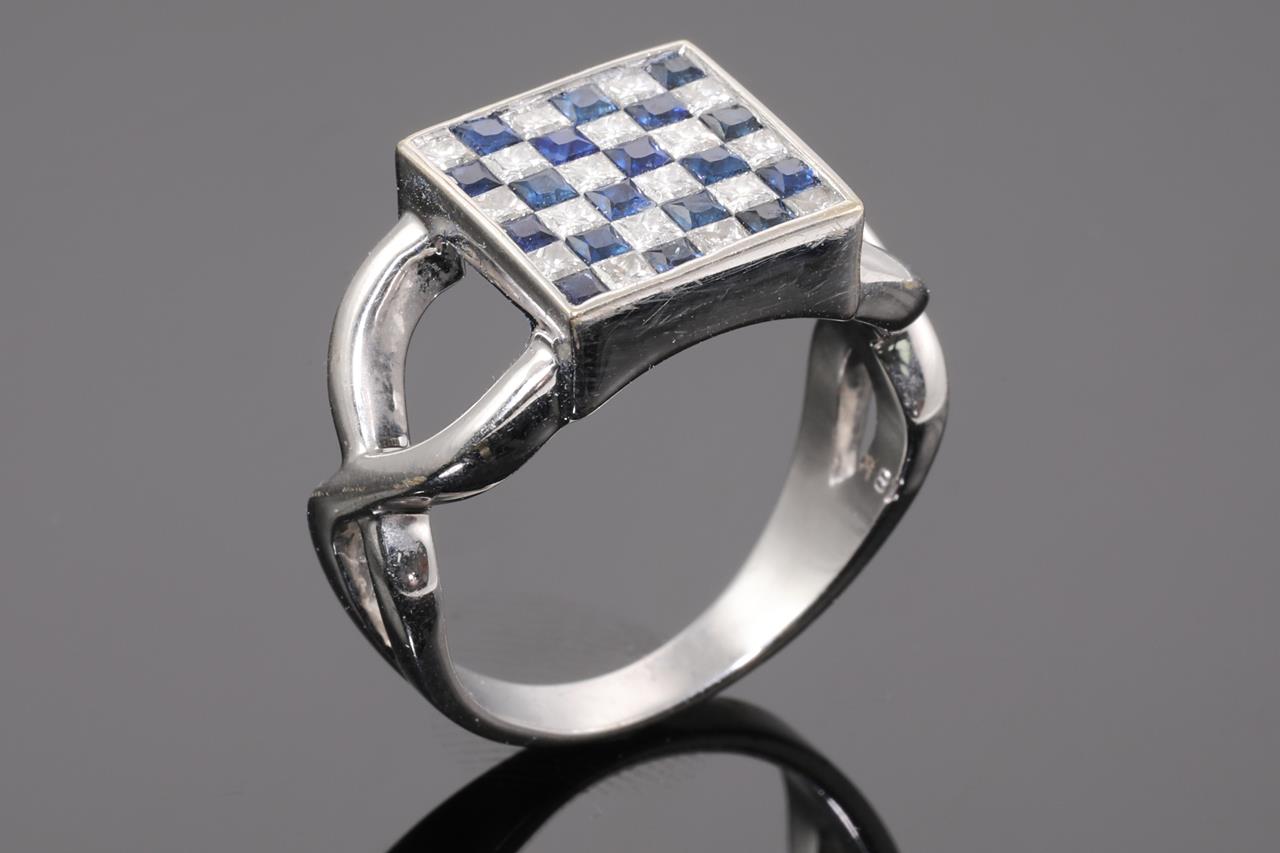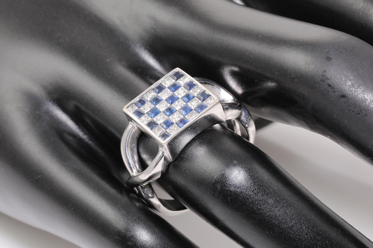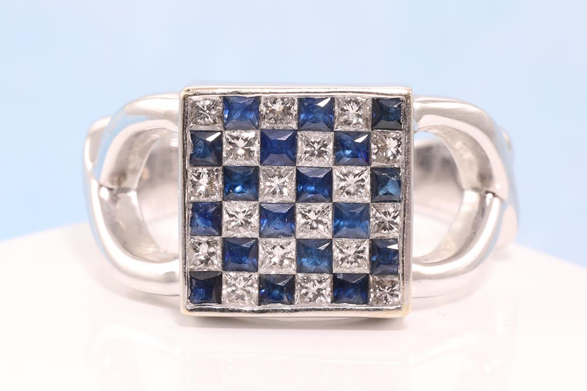 Sapphire and Diamond ring with square cut blue Sapphires totalling approximately 0.90cts and princess cut Diamonds totalling approximately 0.72cts (Estimated grading: H SI). 18ct white gold. Ring size P1/2 - ring resizing is not recommended. Weight: 8.1g. (Pre-owned)