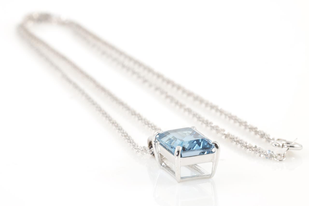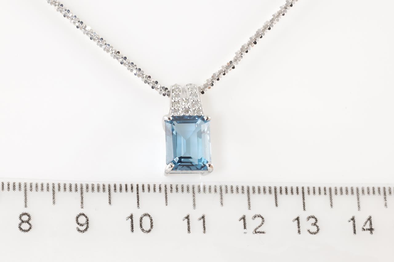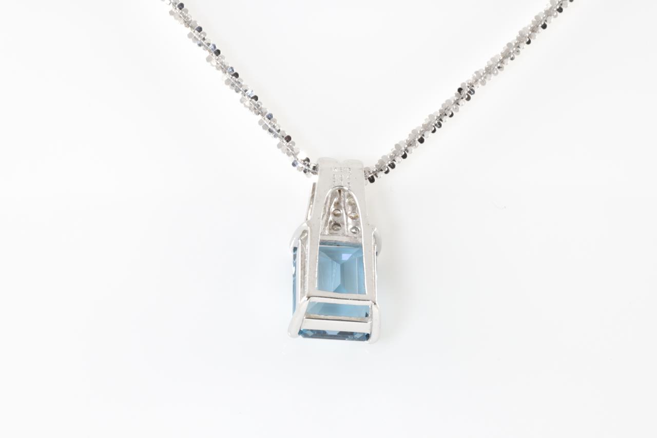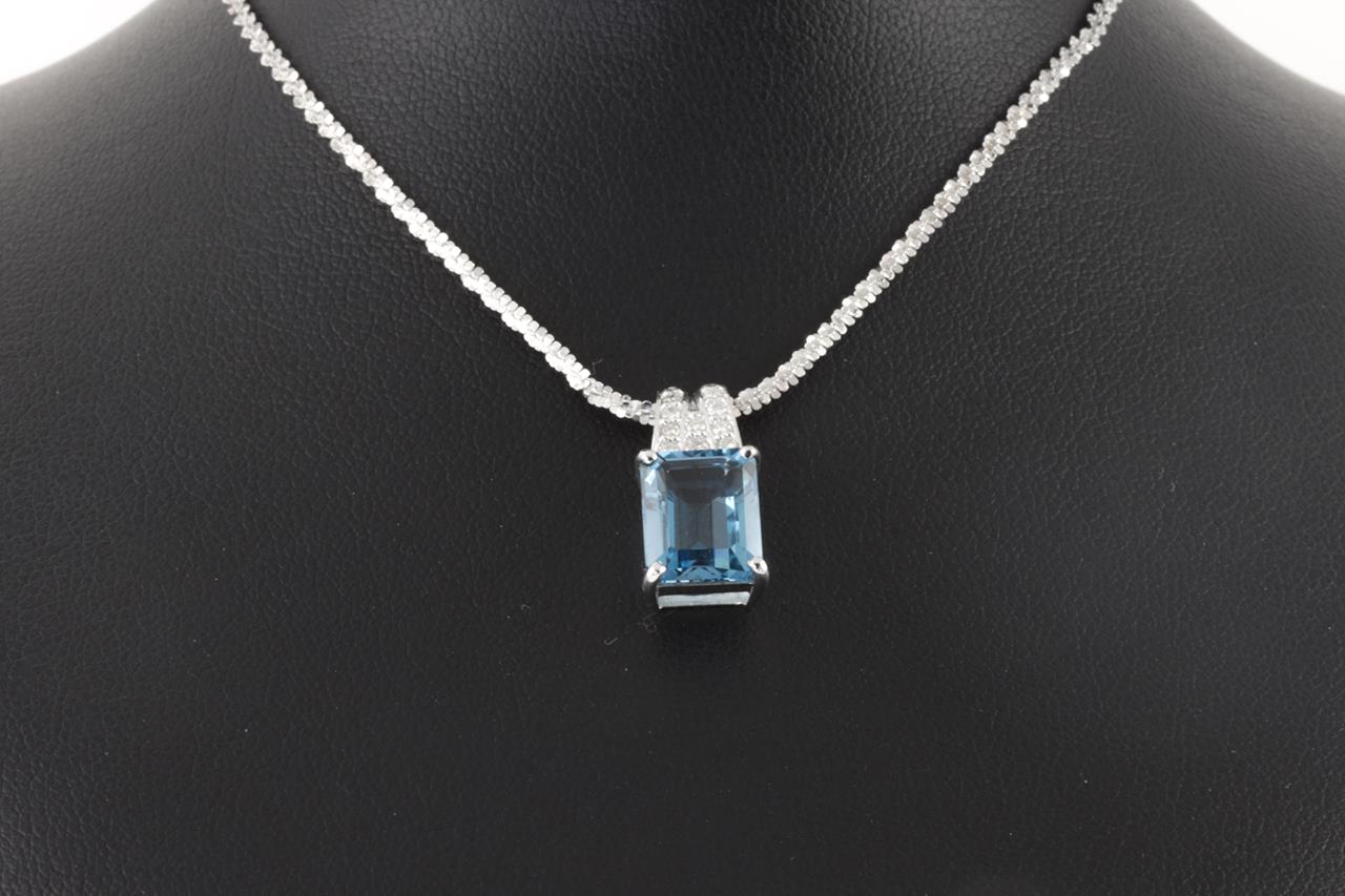 Topaz and Diamond pendant with an emerald cut Topaz of 3.94ct and Diamonds totalling 0.15cts. 18ct white gold with 18ct gold 42cm chain. Weight: 5.4g (Pre-owned)