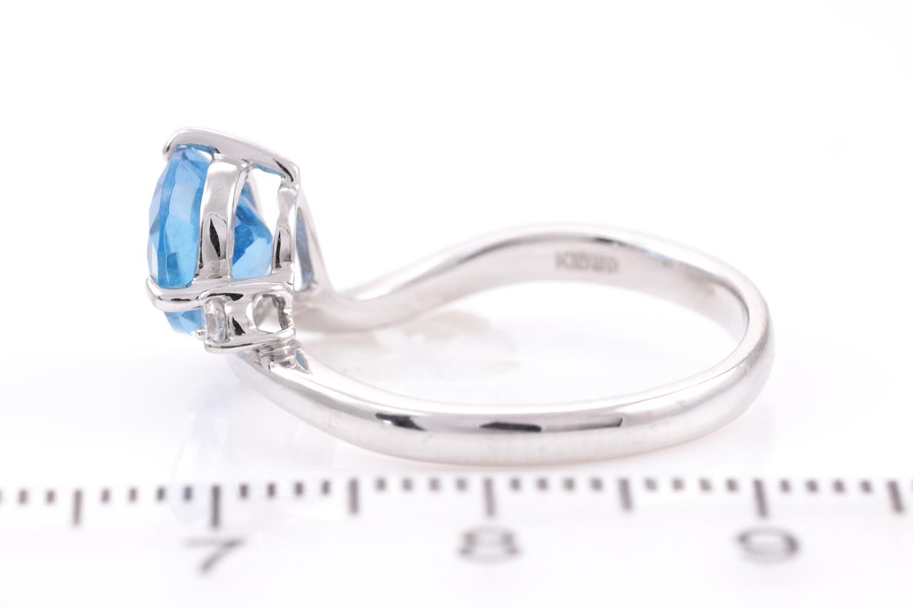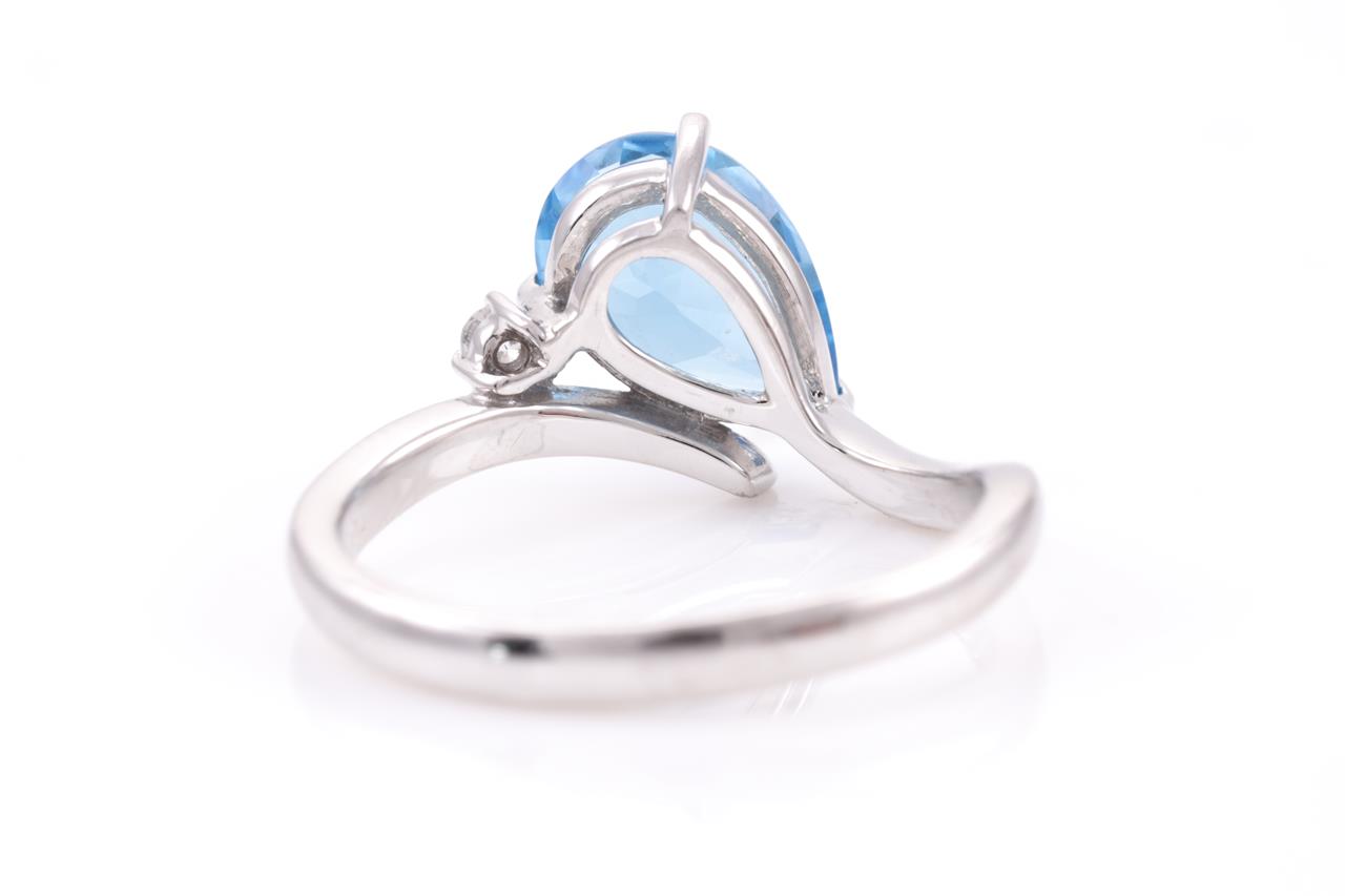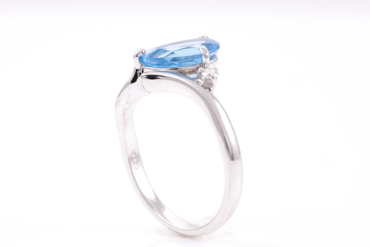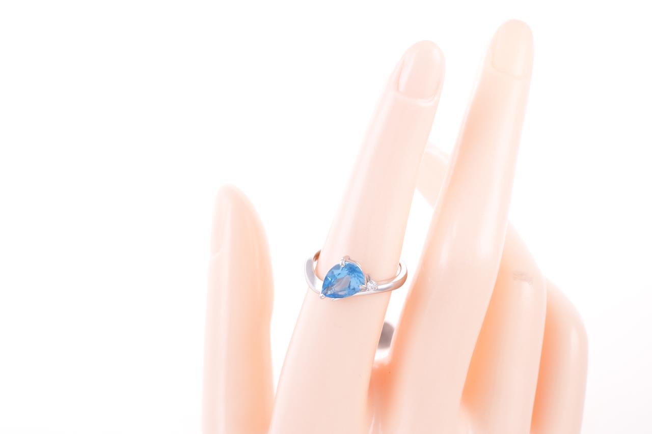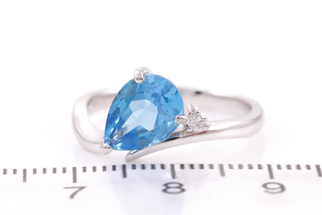 Blue Topaz and Diamond Ring with pear shape Blue Topaz of 2.16ct and a round Diamond of 0.04cts. 18ct white gold. Ring size O - ring resizing is not recommended. Weight: 4.3g. (Pre-owned)