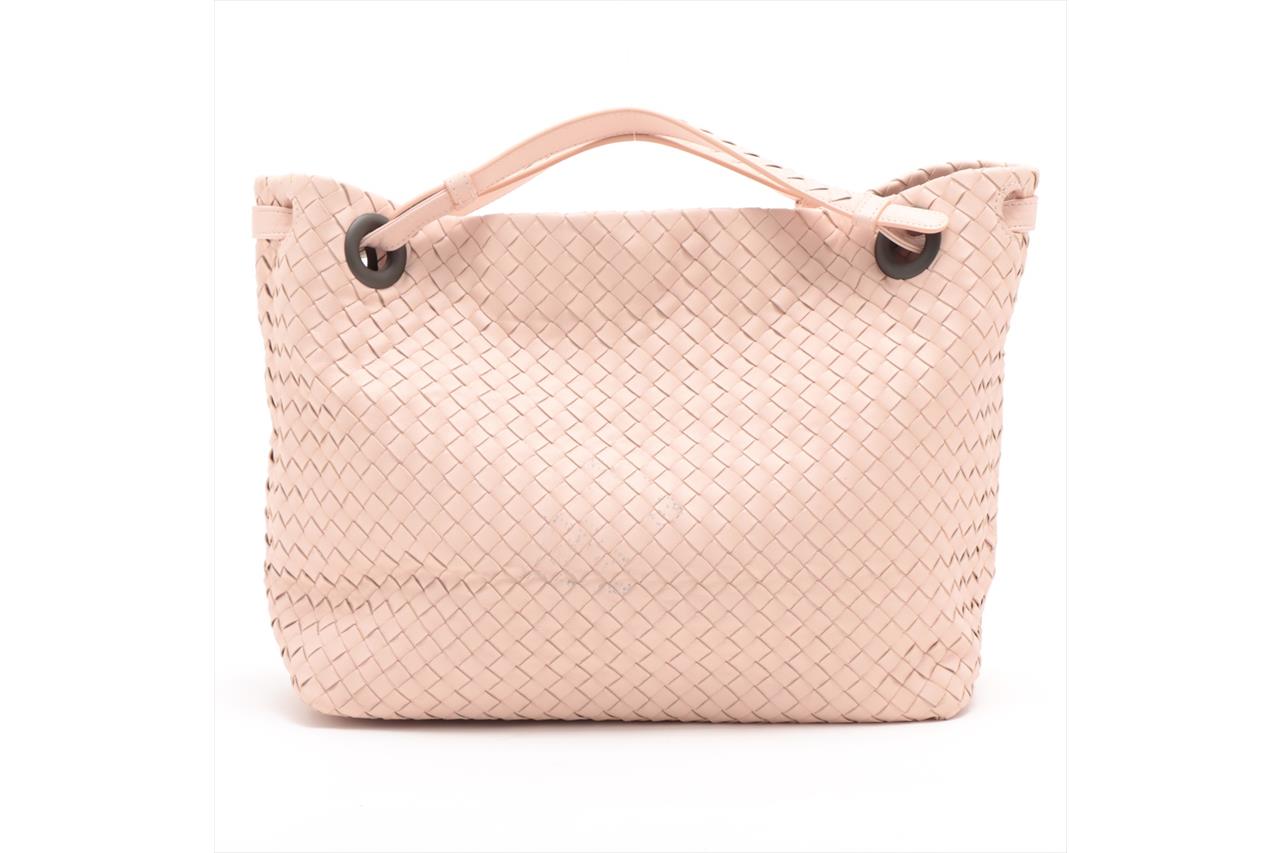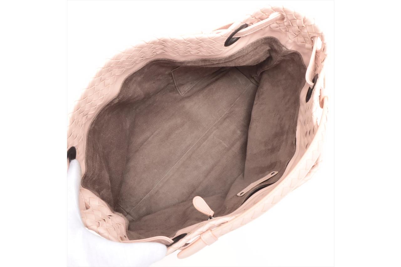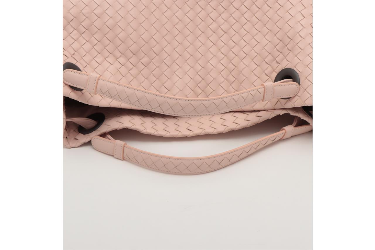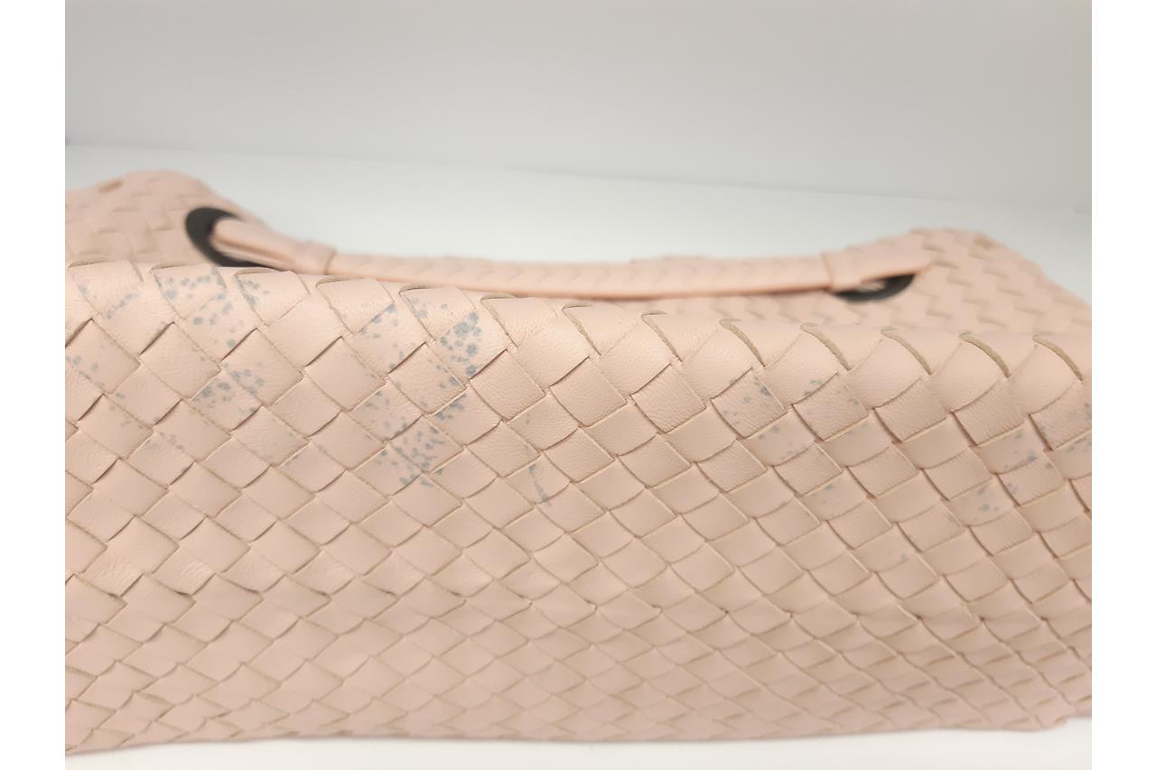 Bottega Veneta Bella medium tote bag in light pink Intrecciato leather. Metal-toned hardware, leather handles, open top with magnetic closure, the top opens to a brown suede finished lining with zip and patch pockets. Approximate dimensions: 33cm(L) x 26.5cm(H) x 14.5cm(D). Accompanied by Bottega Veneta dust bag and mirror. With Entrupy Certificate of Authenticity. (Pre-owned)