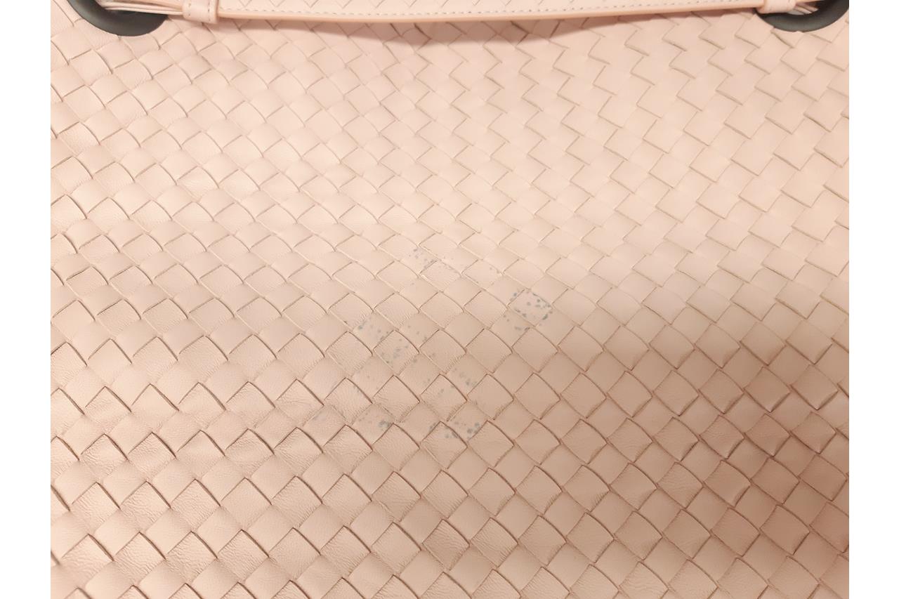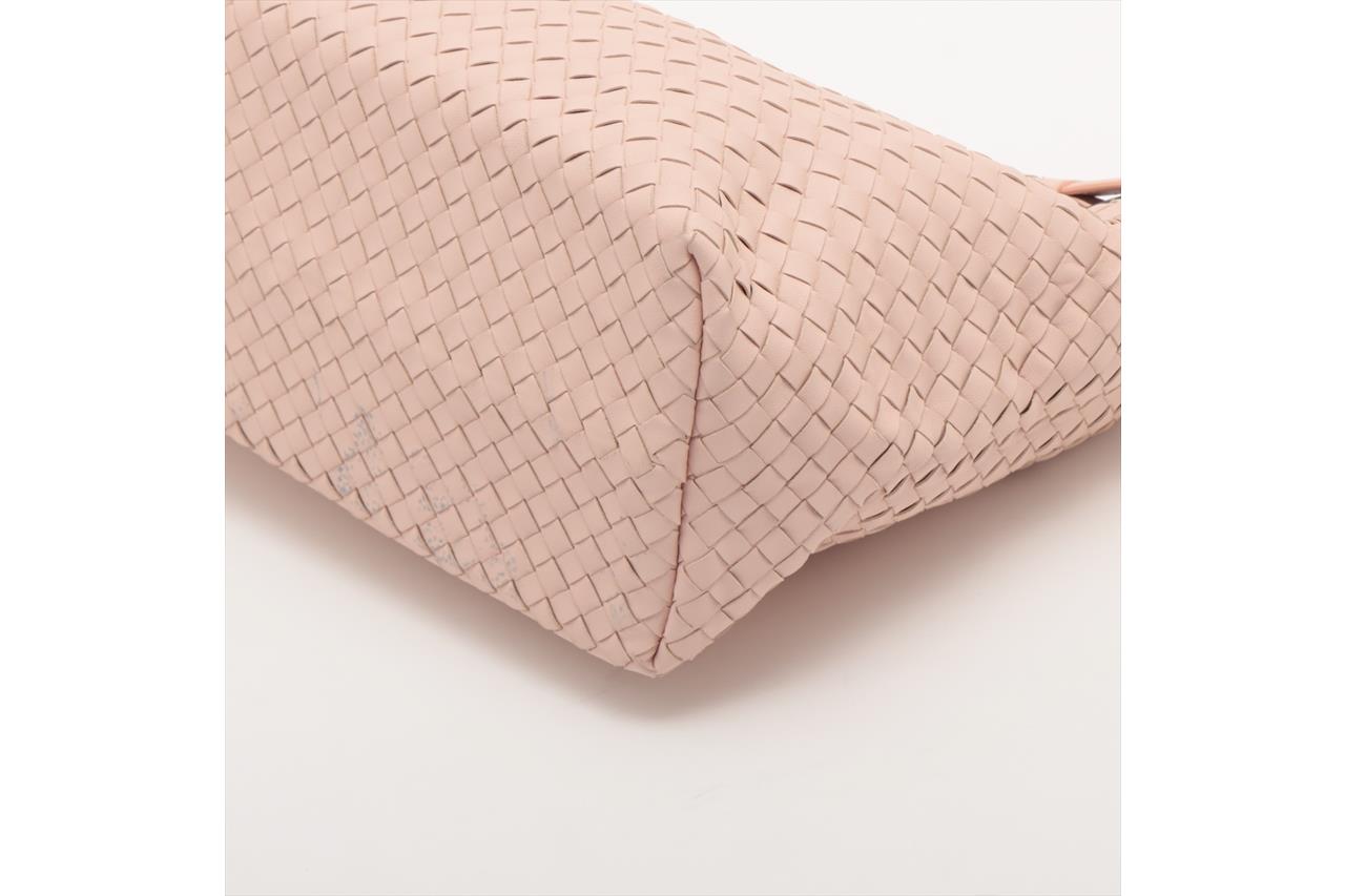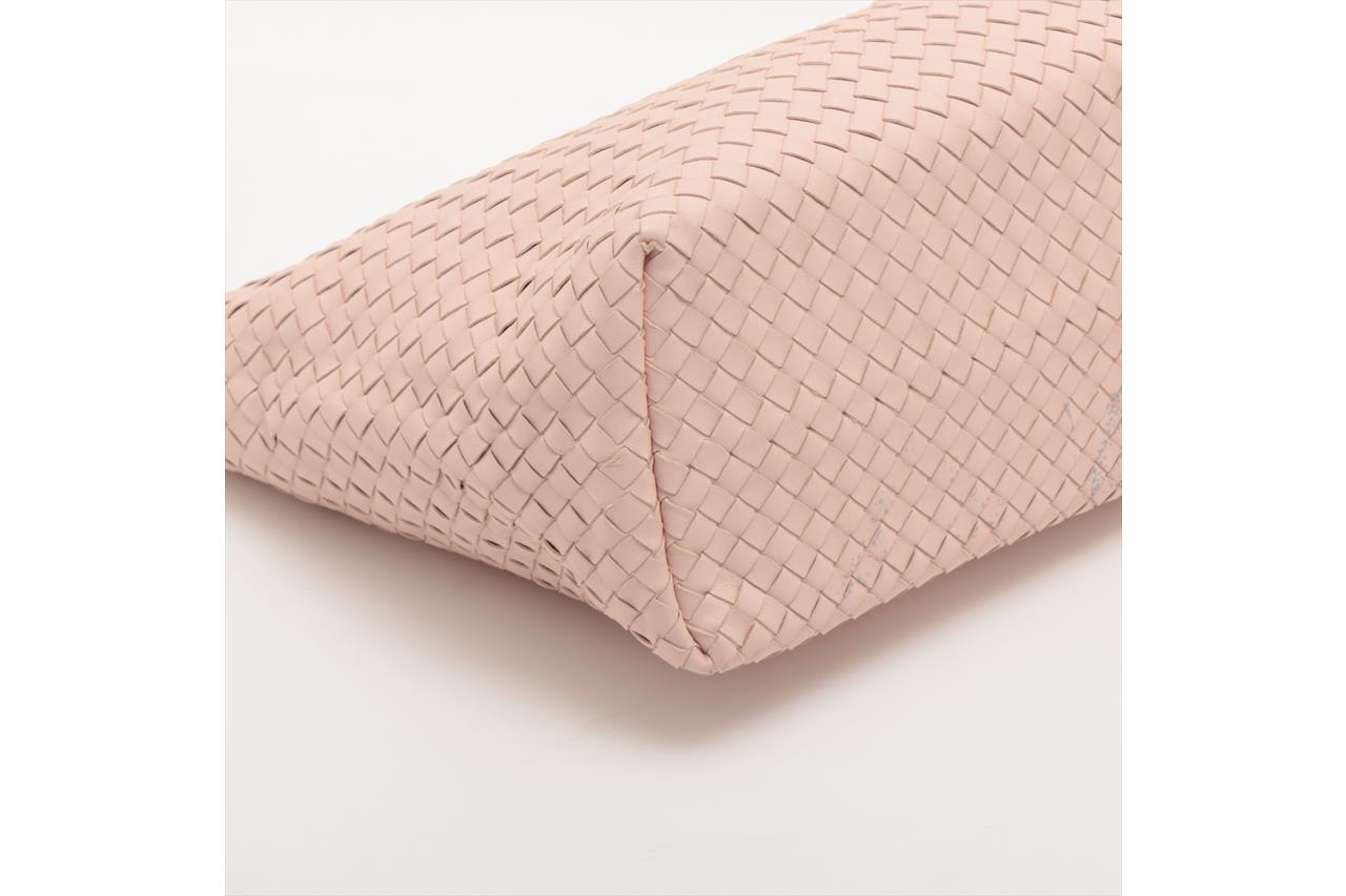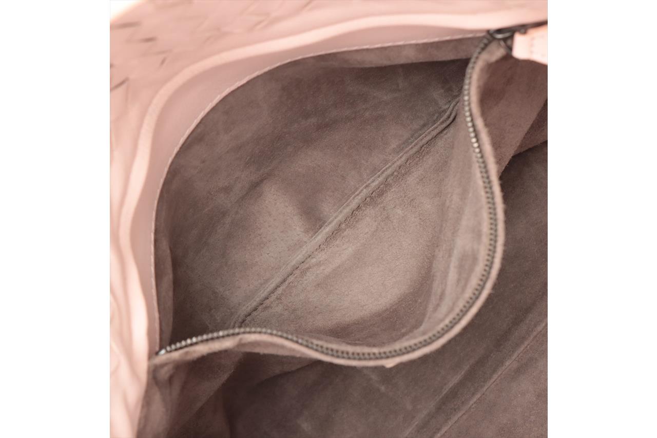 Bottega Veneta Bella medium tote bag in light pink Intrecciato leather. Metal-toned hardware, leather handles, open top with magnetic closure, the top opens to a brown suede finished lining with zip and patch pockets. Approximate dimensions: 33cm(L) x 26.5cm(H) x 14.5cm(D). Accompanied by Bottega Veneta dust bag and mirror. With Entrupy Certificate of Authenticity. (Pre-owned)