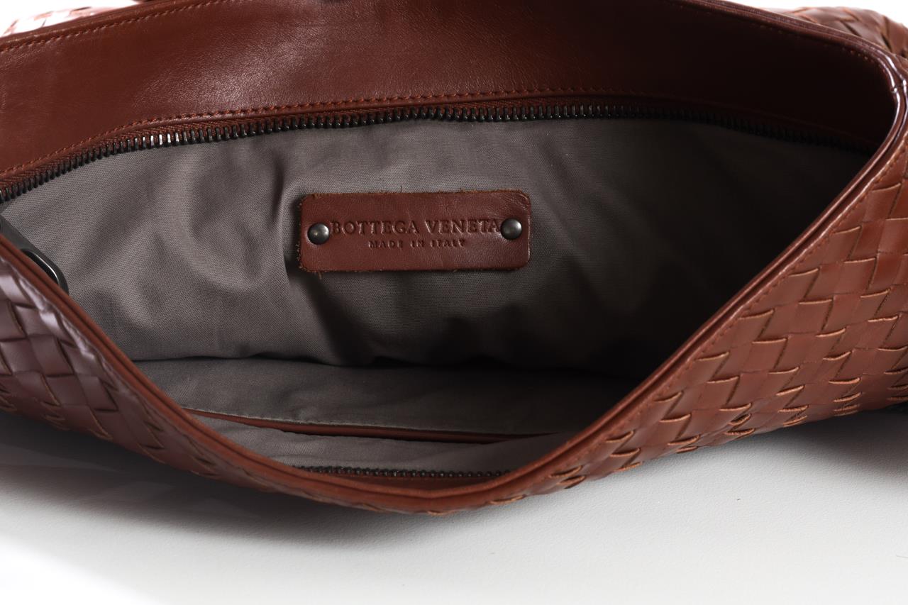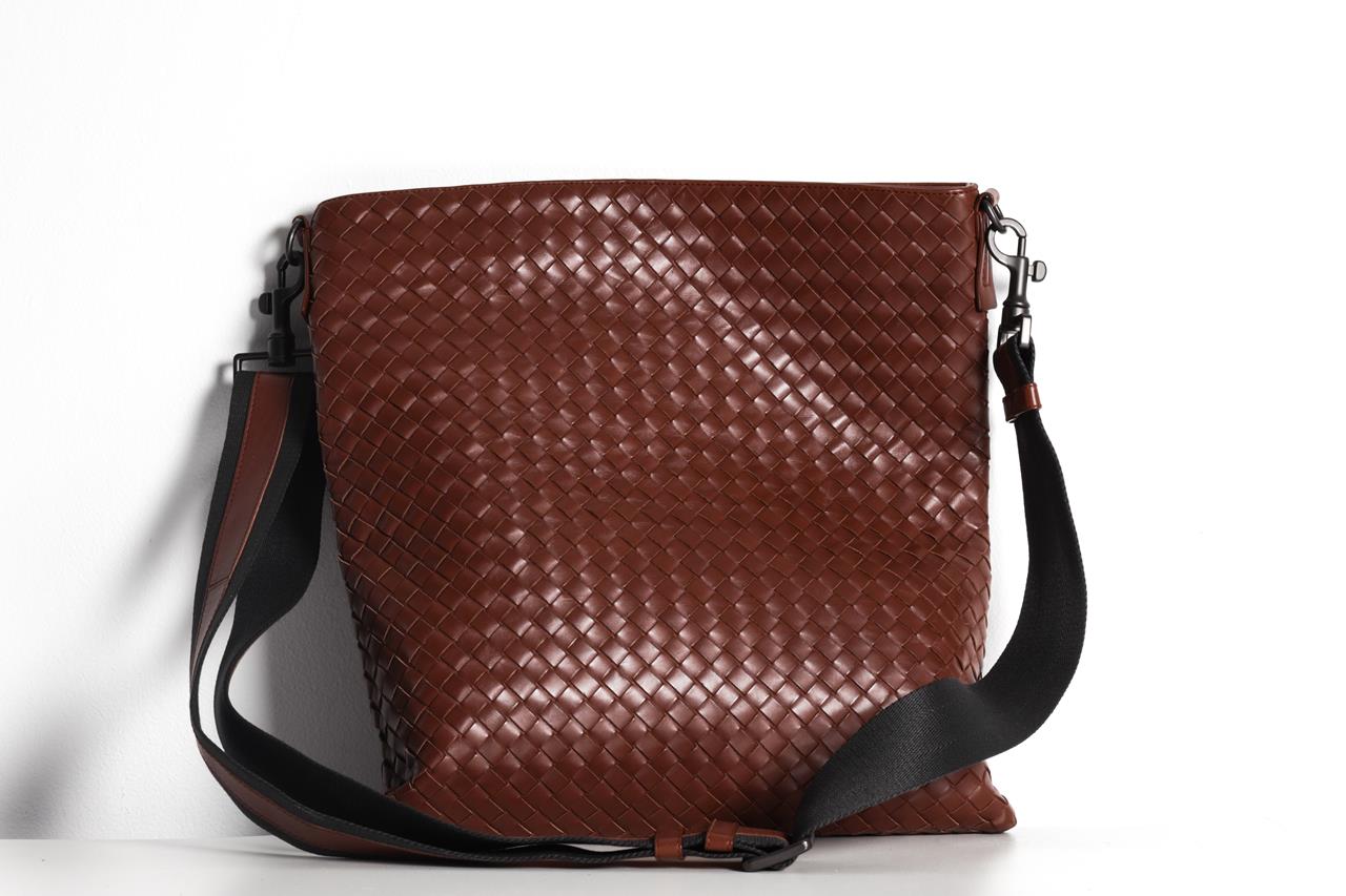 Bottega Veneta Intecciato Flat Nappa Messenger Bag. Intrecciato woven red leather. Gunmetal tone hardware. Adjustable two-tone strap. Approximate dimensions: 34cm (H) x 33cm (W). With Bottega Veneta dust bag. With Entrupy Certificate of Authenticity. (Pre-owned)