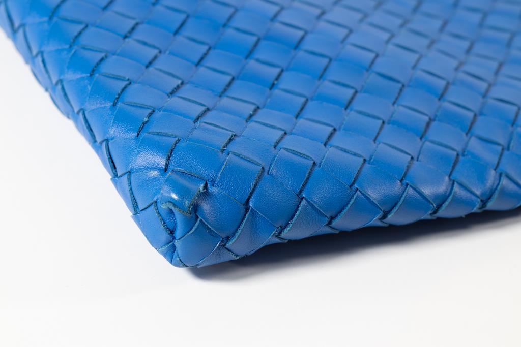 Bottega Veneta Intrecciato Messenger Bag in Blue Leather. Approximate dimensions: 27cm (L) x 28cm (H) x 2cm (D), and 35-6cm adjustable strap drop. With Entrupy Certificate of Authenticity. (Pre-owned)