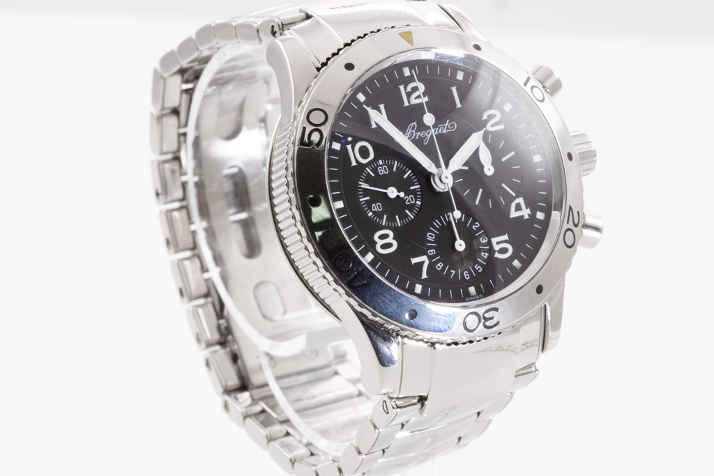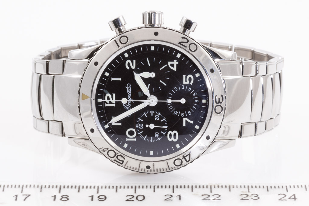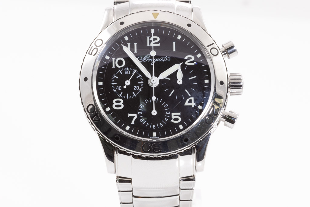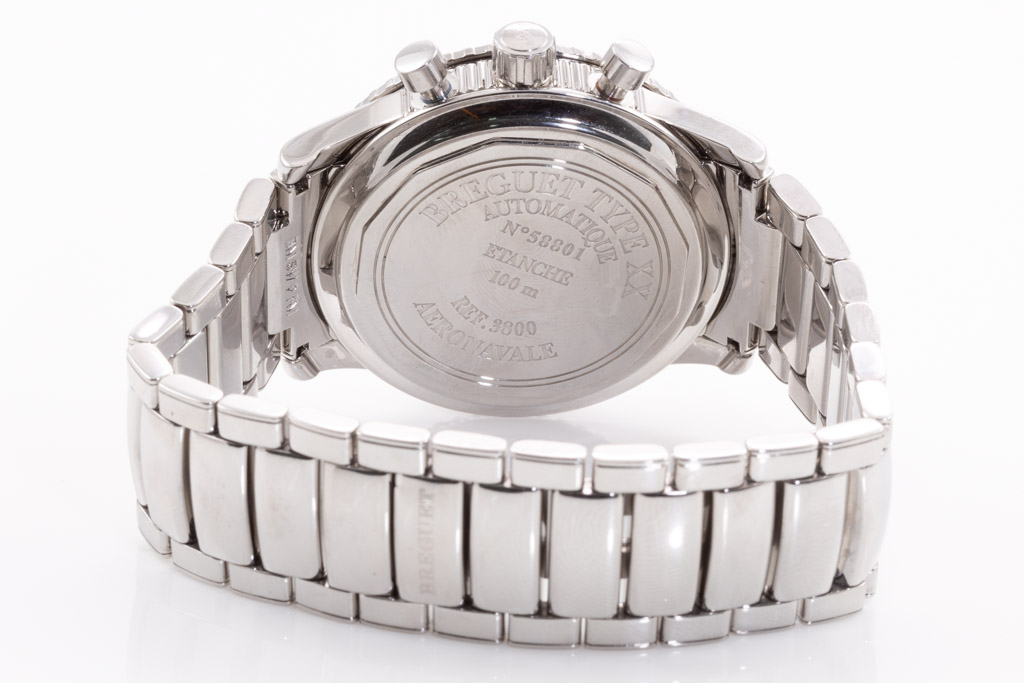 Breguet Type XX Aeronavale stainless steel automatic mens watch. Black chronograph dial, case diameter: 39mm, wrist size: 16.5cm, Swiss made. Ref# 3800ST/92/SW9. With Breguet stainless steel bracelet and clasp. With Certificate of Authenticity, Breguet Certificate of Origin and Warranty and Breguet box. 3 month FSA warranty. (Pre-owned)
