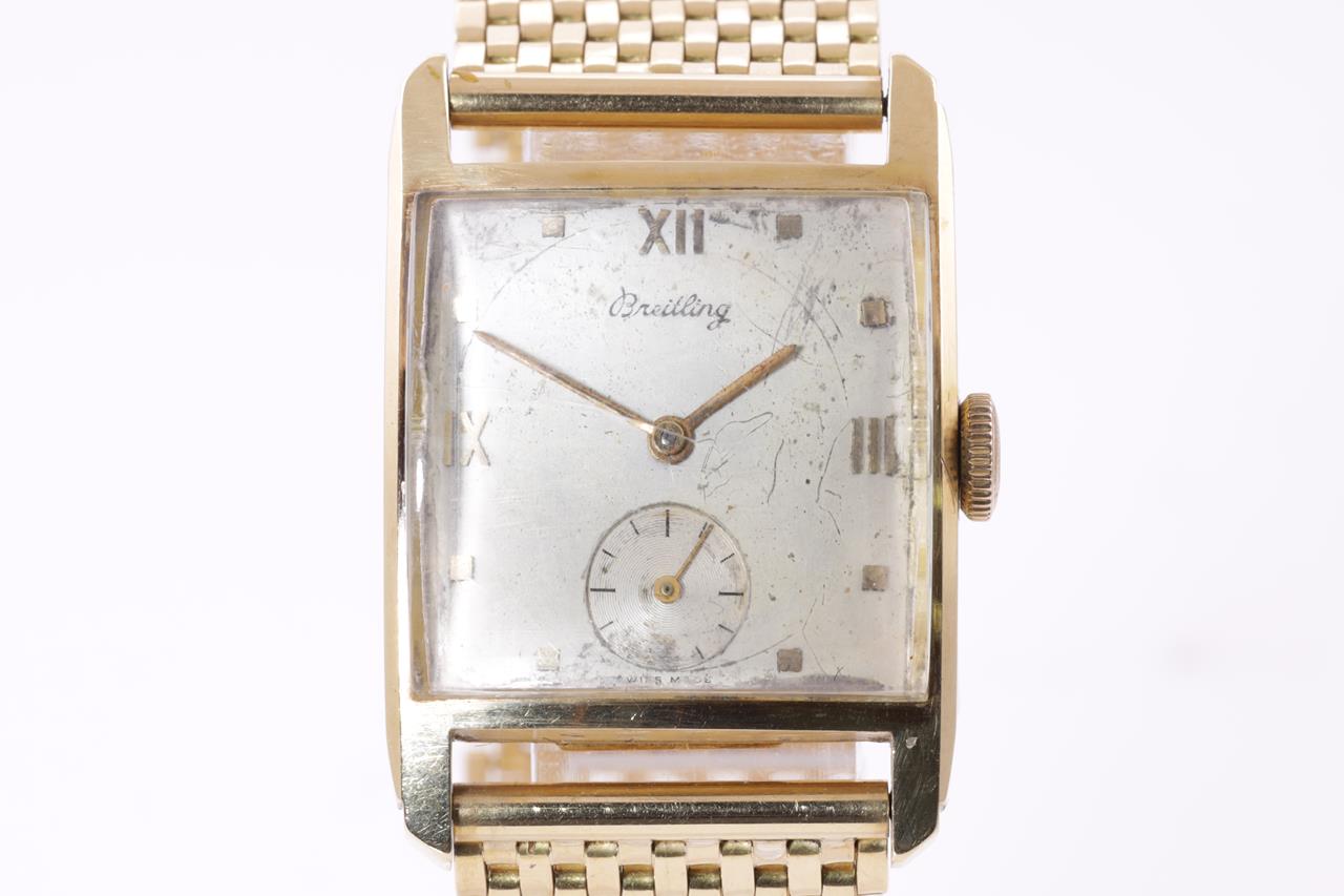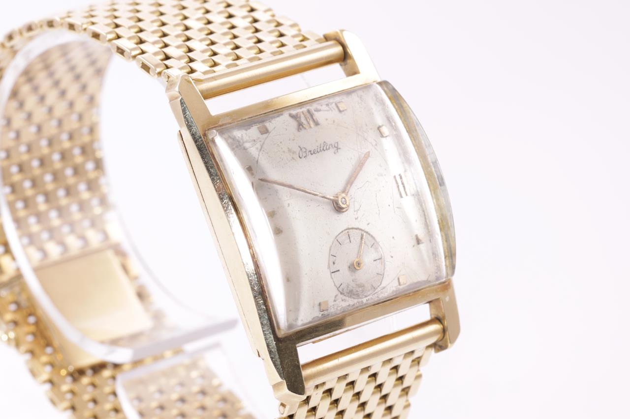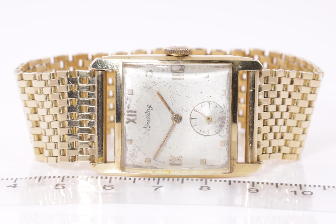 Breitling 18ct yellow gold manual winding watch. Gold dial, small second, case diameter: 22mm x 20mm, wrist size: 17cm, Swiss made. Ref# 392961. With 18ct yellow gold bracelet and clasp. With Certificate of Authenticity. 3 month FSA warranty. (Pre-owned)