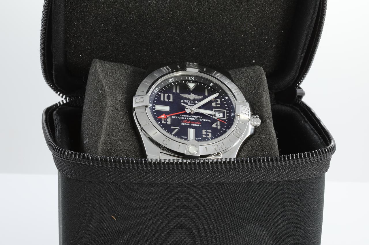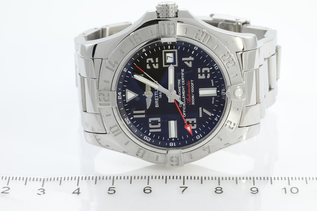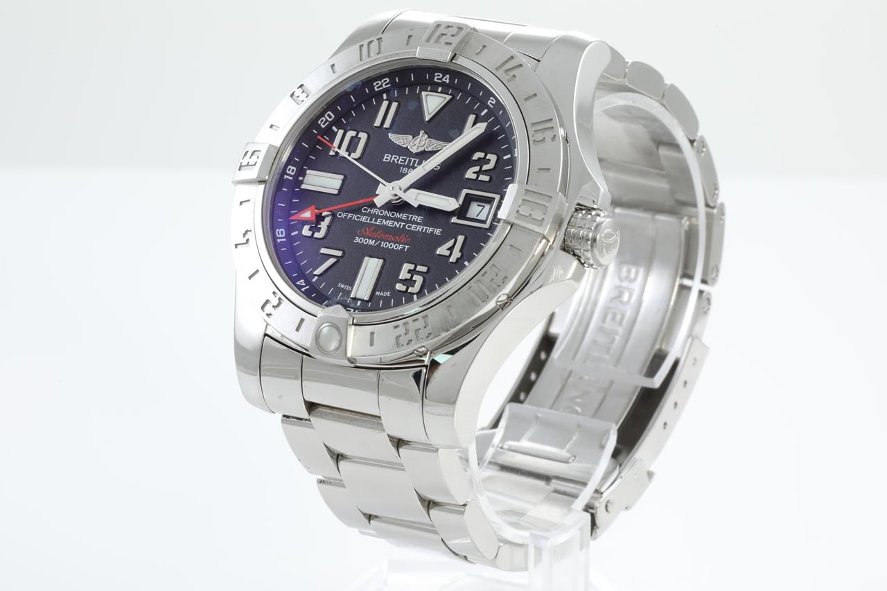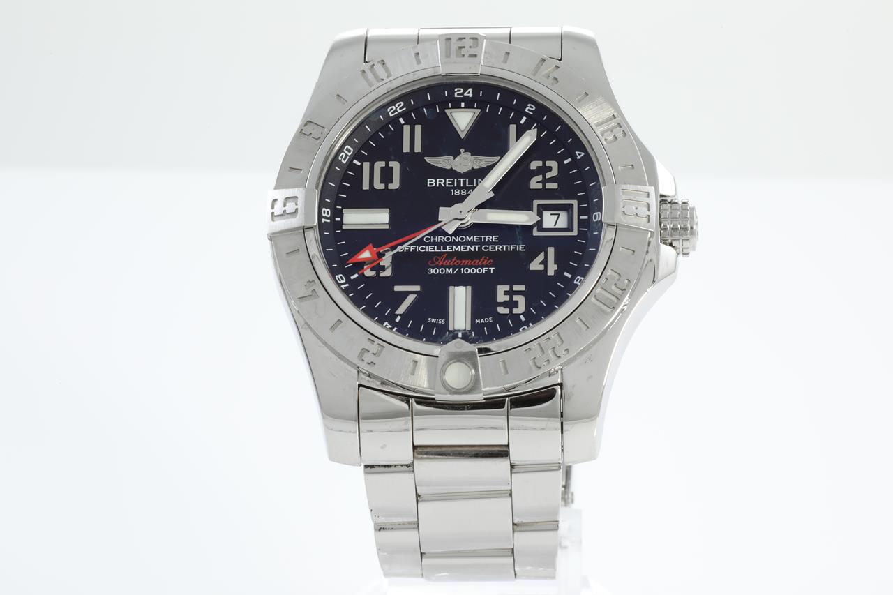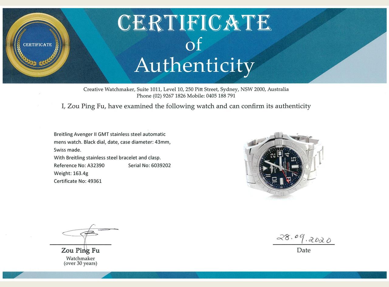 Breitling Avenger II GMT stainless steel automatic mens watch. Black dial, date, wrist size: 17cm, case diameter: 43mm, Swiss made. Ref# A32390. With Breitling stainless steel bracelet and clasp. With certificate of authenticity and Breitling box. 3 month FSA warranty. (Pre-owned)