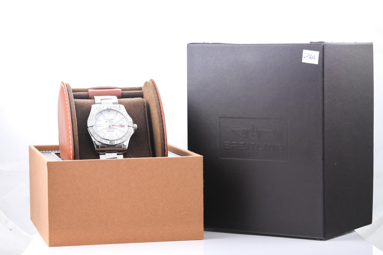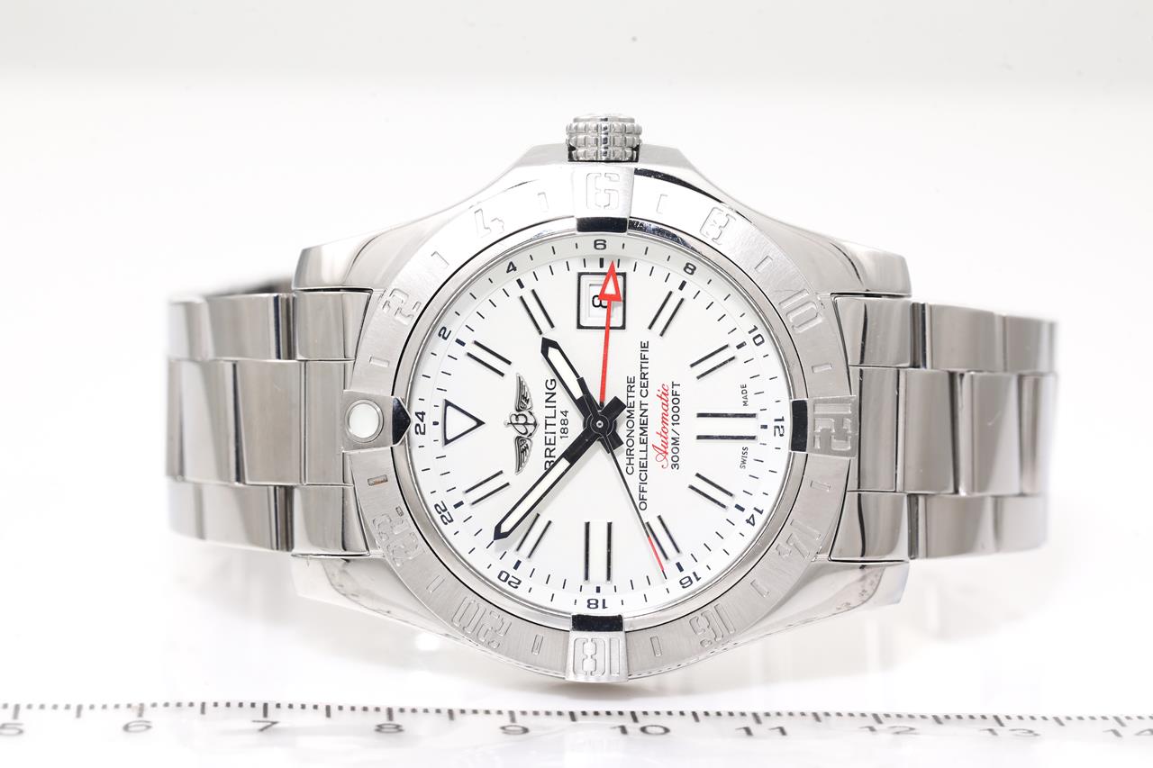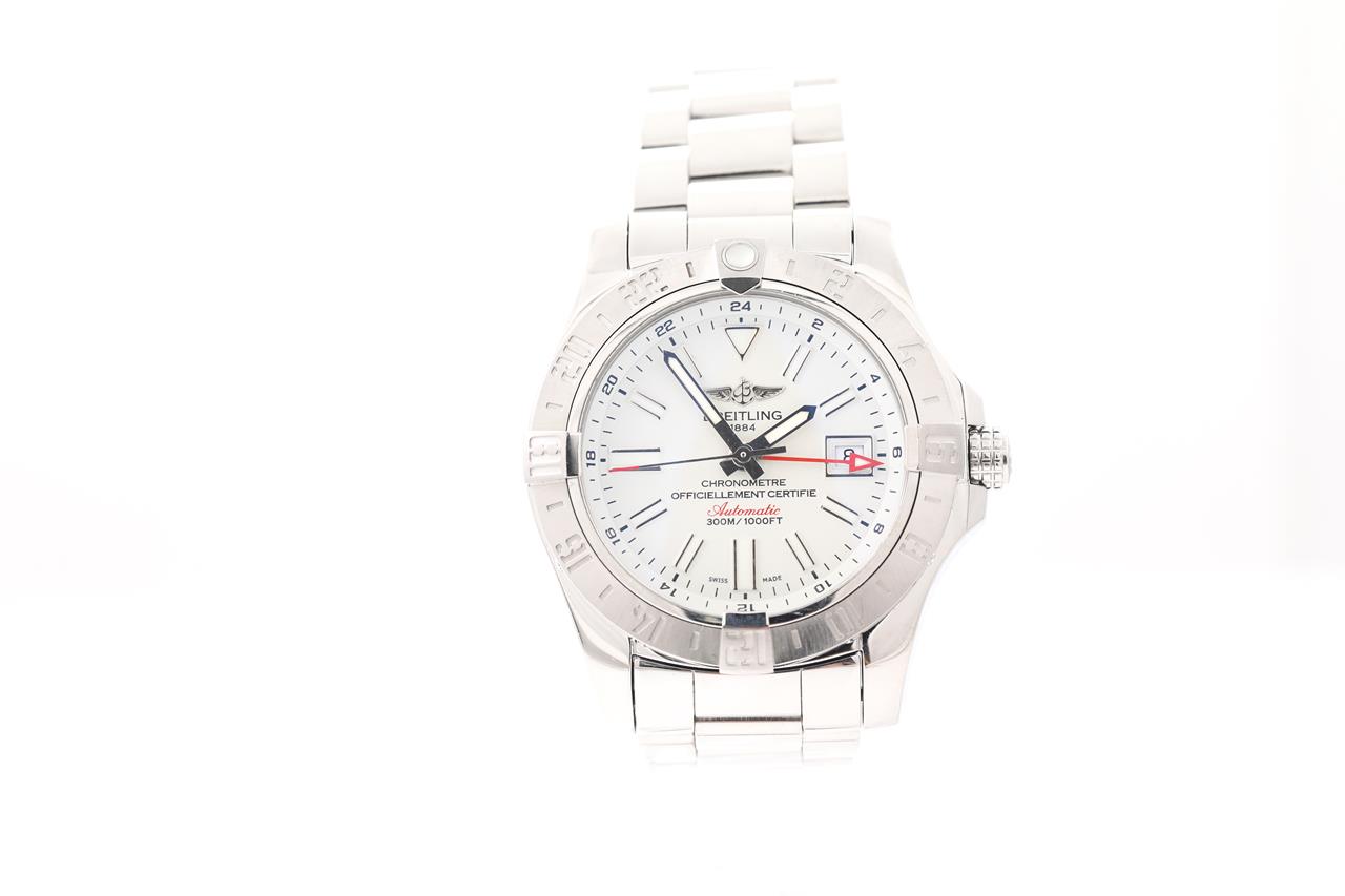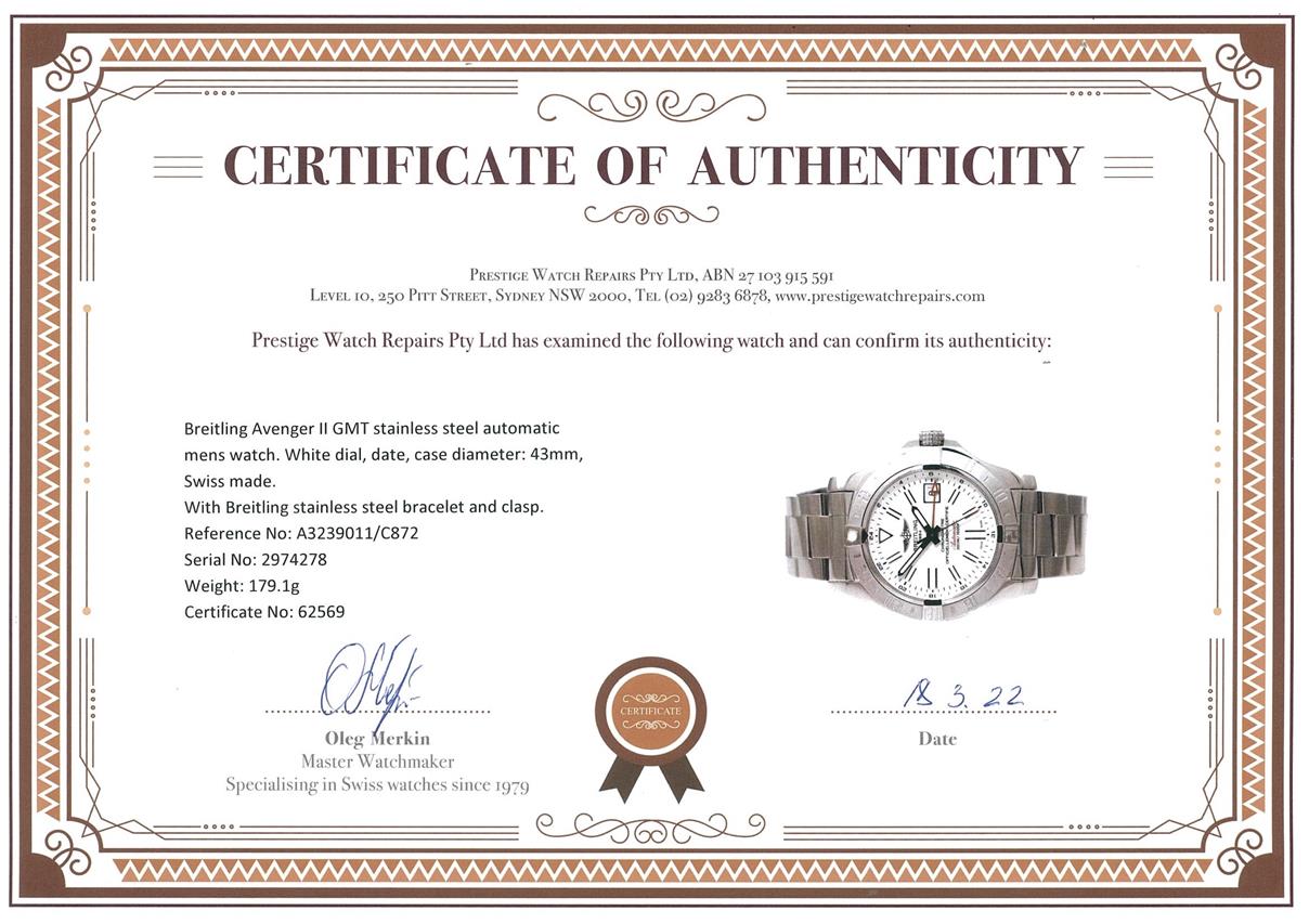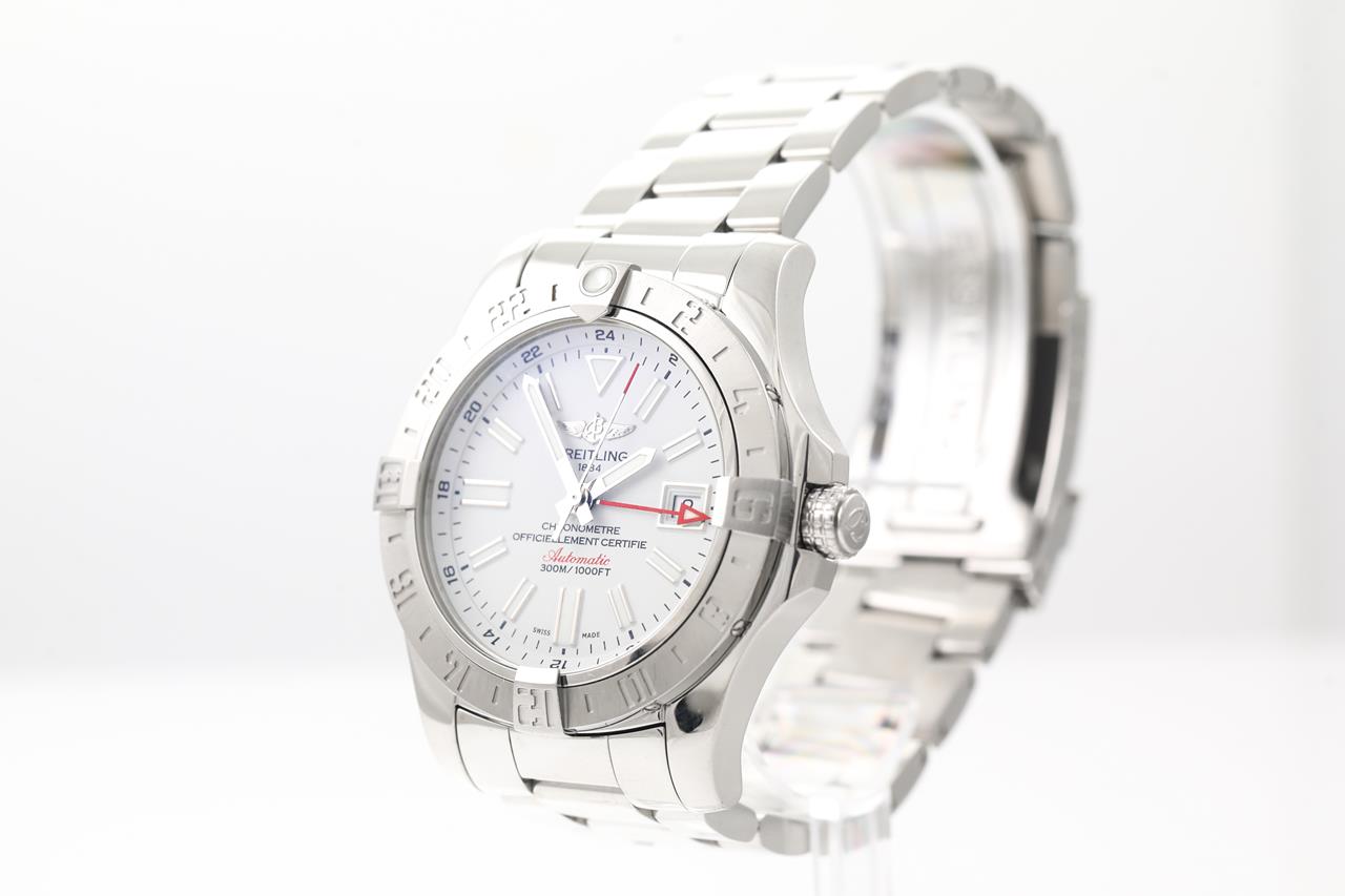 Breitling Avenger II GMT stainless steel automatic mens watch. White dial, date, case diameter: 43mm, length: 21cm, Swiss made. Ref# A3239011/C872. With Breitling stainless steel bracelet and clasp. With Certificate of Authenticity, Breitling International E-warranty Card dated 23/05/22 and Breitling box. 3 month FSA warranty. (Pre-owned)