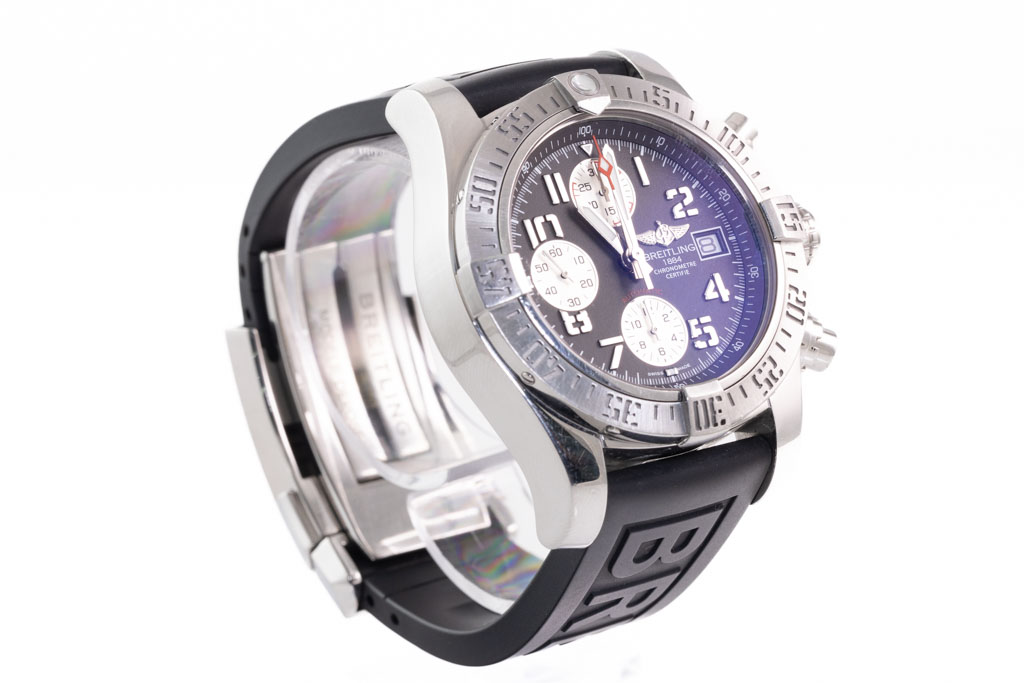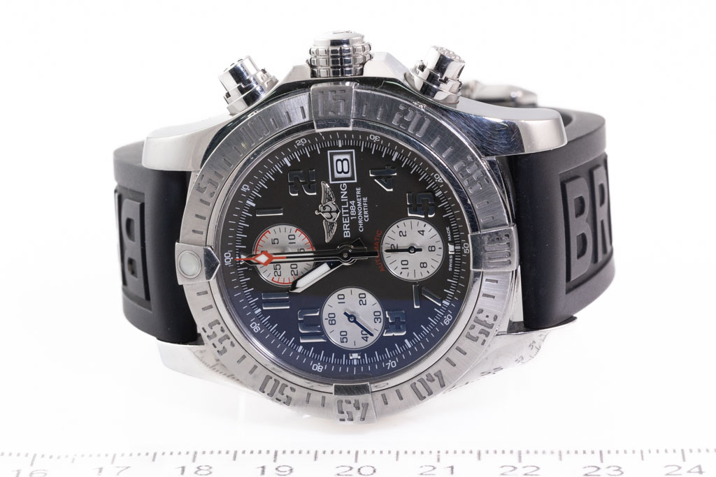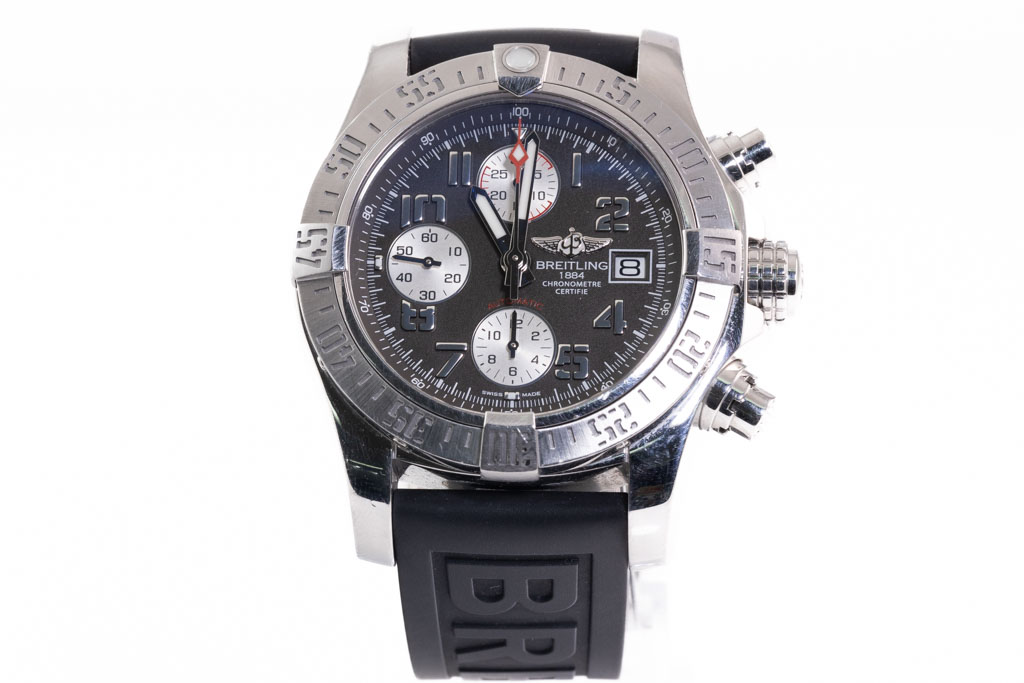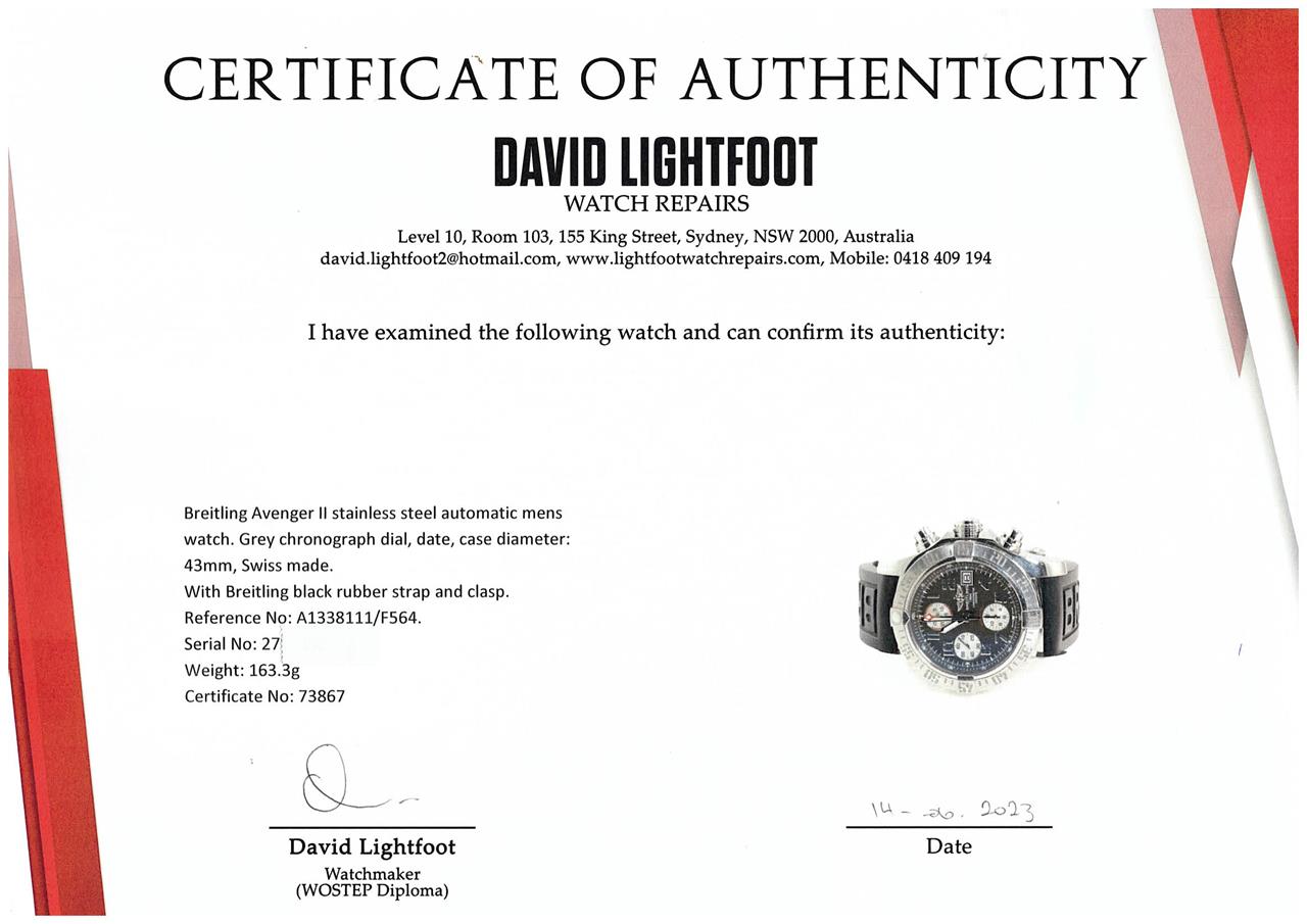 Breitling Avenger II stainless steel automatic mens watch. Grey chronograph dial, date, case diameter: 43mm, wrist size: 17cm, Swiss made. Ref# A1338111/F564. With Breitling black rubber strap and clasp. With Certificate of Authenticity, Breitling International warranty card dated 08/04/2018 and Breitling box. 3 month FSA warranty (Pre-owned)