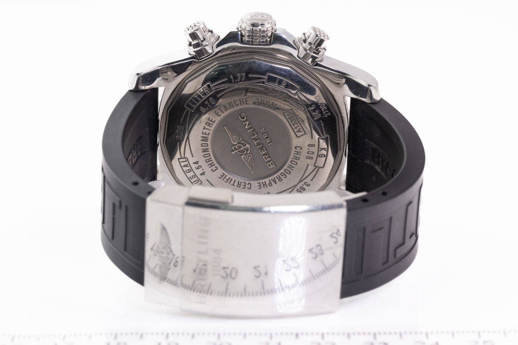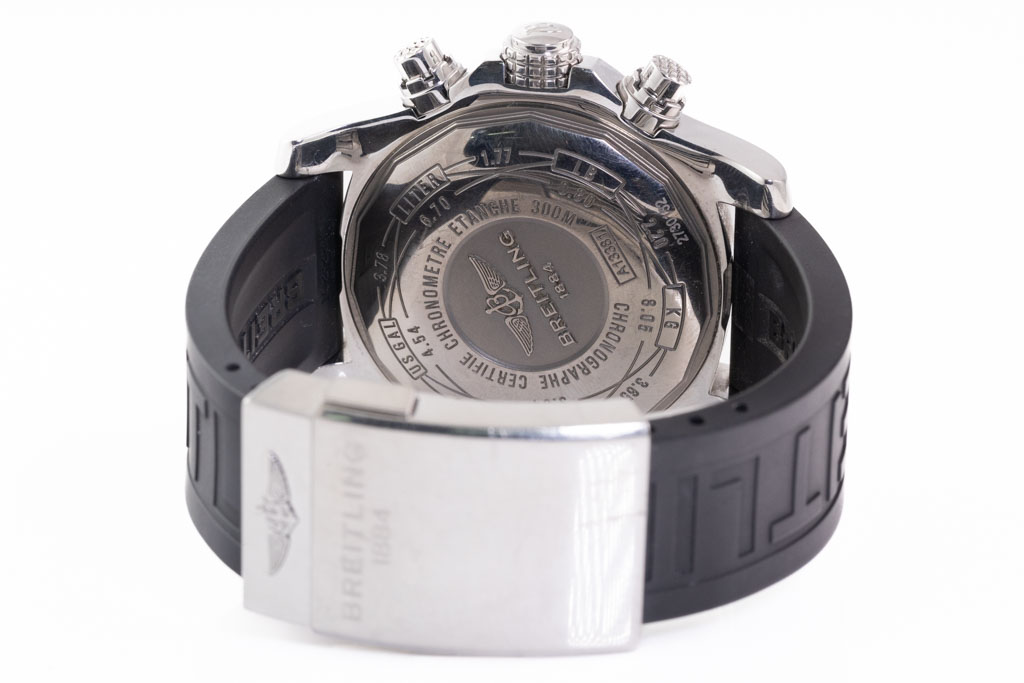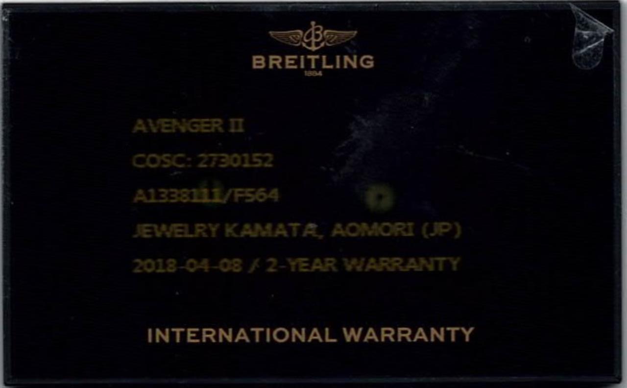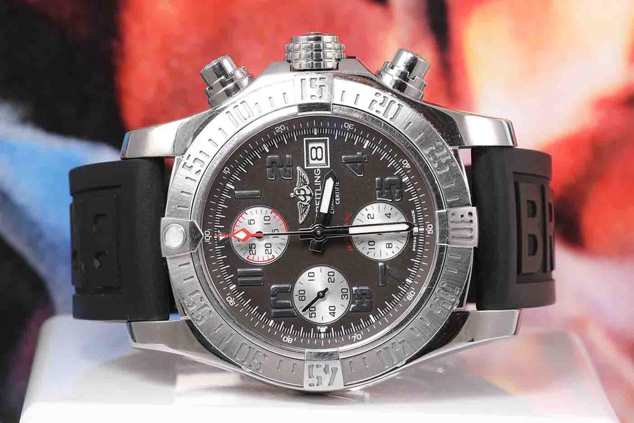 Breitling Avenger II stainless steel automatic mens watch. Grey chronograph dial, date, case diameter: 43mm, wrist size: 17cm, Swiss made. Ref# A1338111/F564. With Breitling black rubber strap and clasp. With Certificate of Authenticity, Breitling International warranty card dated 08/04/2018 and Breitling box. 3 month FSA warranty (Pre-owned)