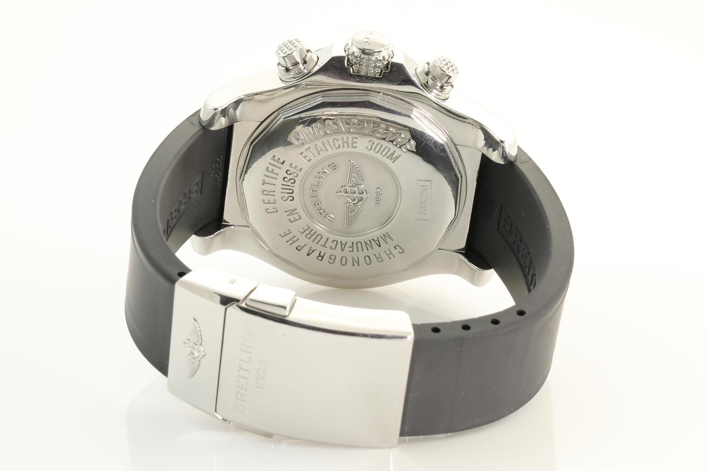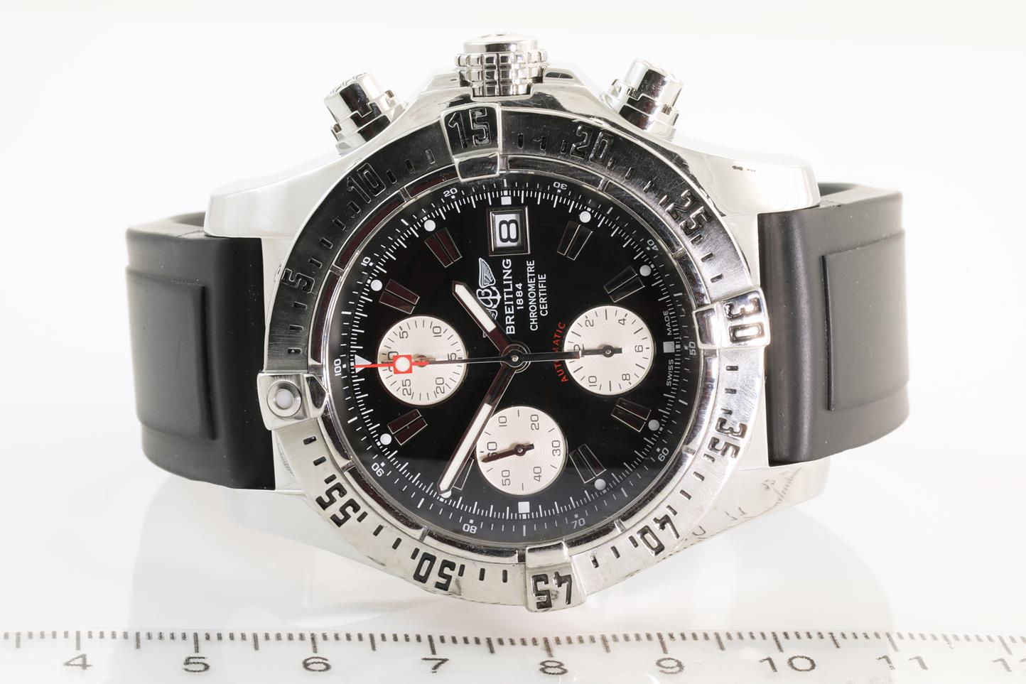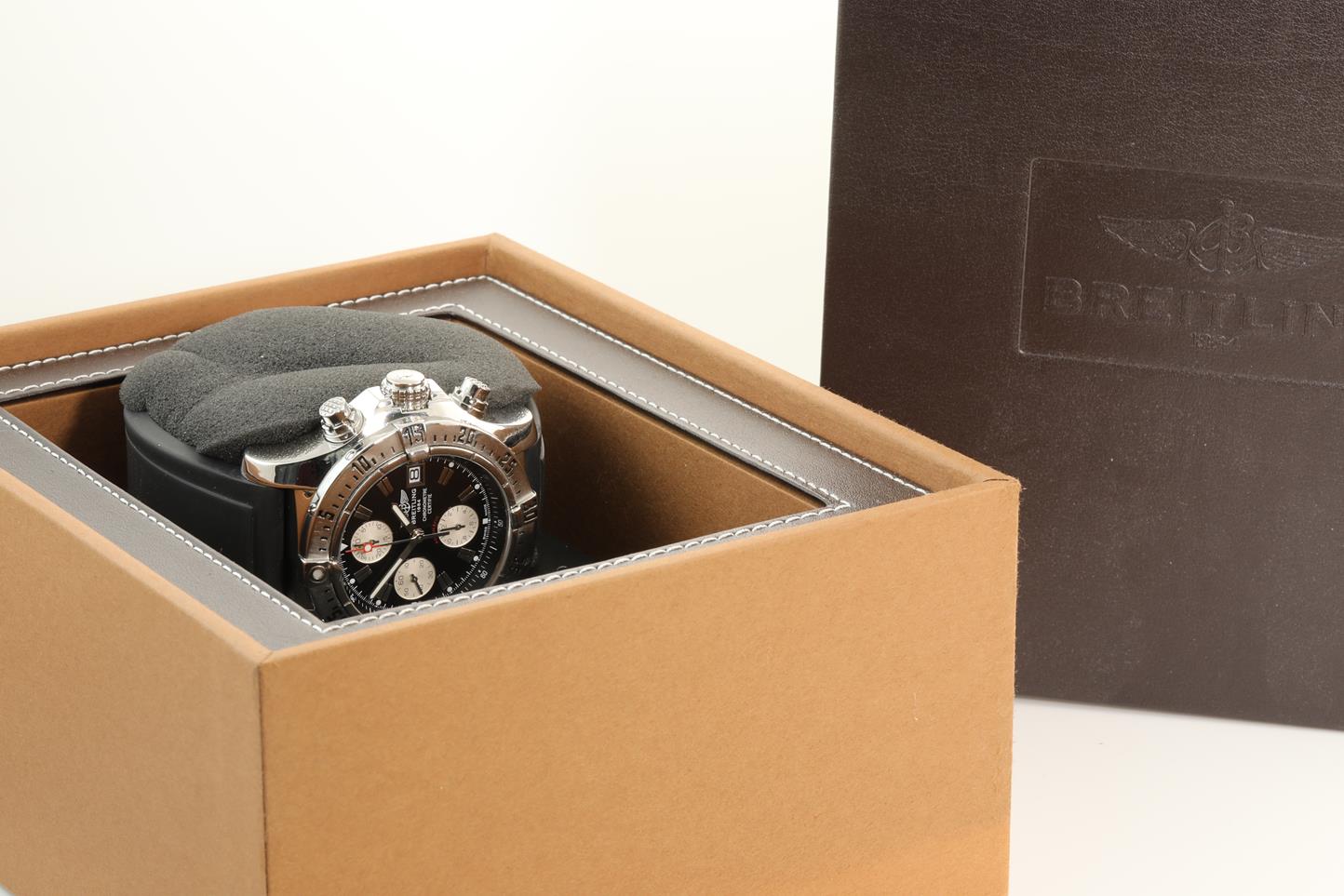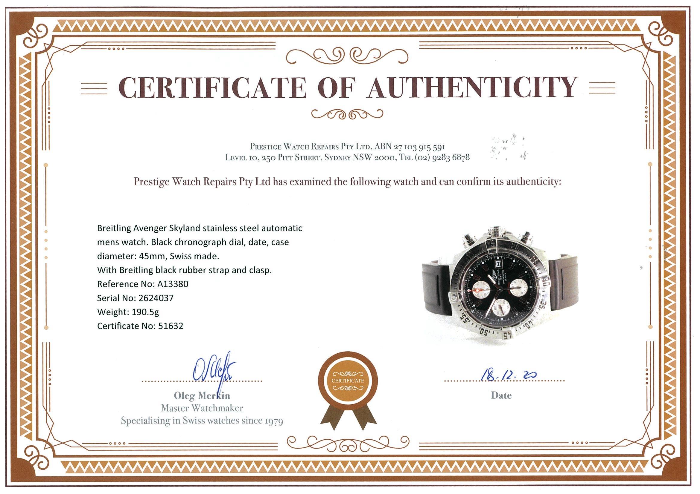 Breitling Avenger Skyland stainless steel automatic mens watch. Black chronograph dial, date, case diameter: 45mm, wrist size: 17cm, Swiss made. Ref# A13380. With Breitling black rubber strap and clasp. With certificate of authenticity and Breitling box. 3 month FSA warranty. (Pre-owned)