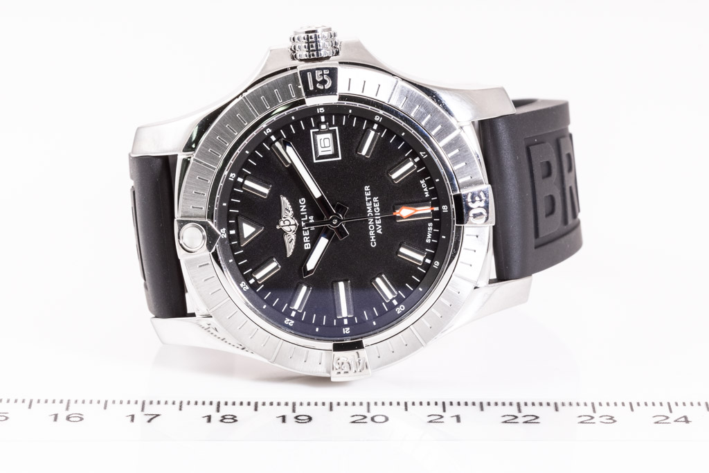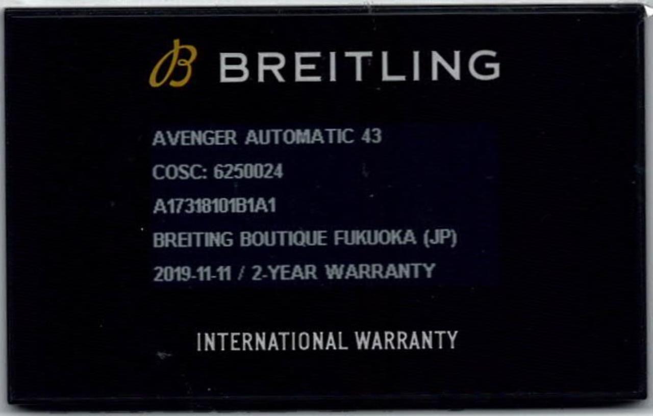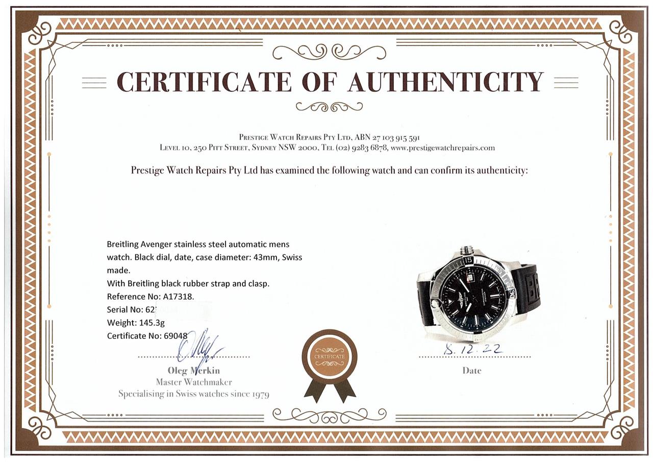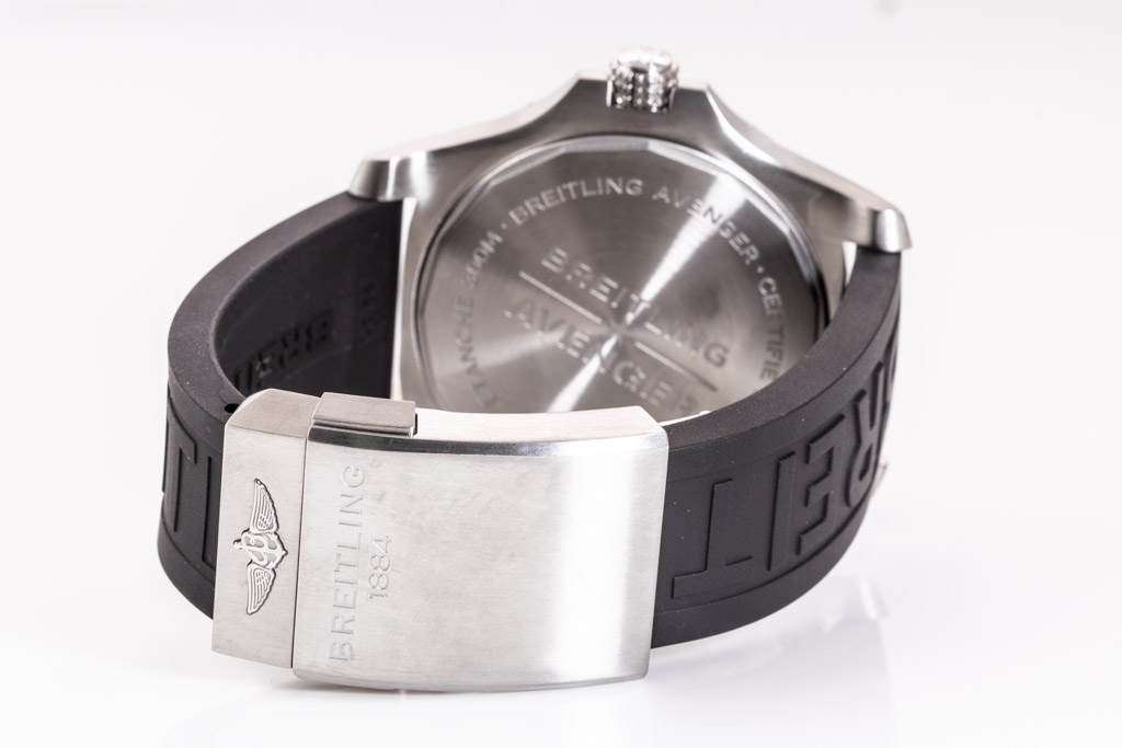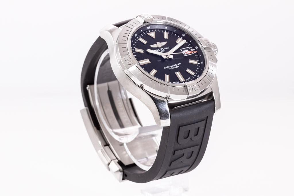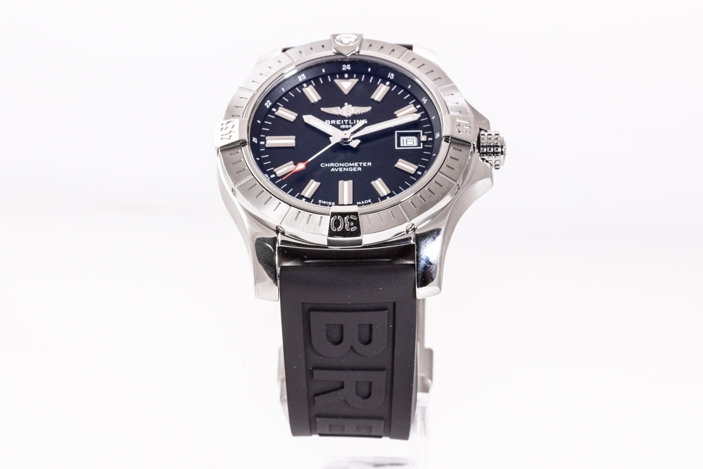 Breitling Avenger stainless steel automatic mens watch. Black dial, date, case diameter: 43mm, wrist size: 15.5cm, Swiss made. Ref# A17318. With Breitling black rubber strap and clasp. With Certificate of Authenticity, Breitling International E-warranty Card dated 11/11/2019, Spare of stainless steel bracelet and Breitling box. 3 month FSA warranty. (Pre-owned)
